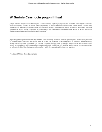 Witamy na oficjalnej stronie internetowej Gminy Czarnocin. W Gminie Czarnocin pogonili lisa! Już po raz IX w miejscowości Rzepki gm. Czarnocin odbył się tradycyjny bieg św. Huberta, który zgromadził wielu miłośników jazdy konnej. W Polsce tradycja gonitwy za dzikim zwierzem wywodzi się z XVIII wieku – mówił Wójt Roman Miksa, podczas oficjalnego otwarcia wydarzenia. Jeźdźcy oraz zaprzęgi konne, po krótkiej prezentacji ruszyły w malownicze tereny lasów i mokradeł w poszukiwaniu lisa. W tegorocznym Hubertusie w rolę tę wcielił się Bartek Świda reprezentujący stajnie „Konie na nieboskłonie”. Jego umiejętności jeździeckie oraz wyszkolenie konia pozwoliły mu długo zwodzić i przechytrzać pozostałych jeźdźców, aż po kilkunastu minutach wytrwałej ucieczki udało się, lisią kitę przejął Ułan Marcin Białowąs, reprezentujący Stowarzyszenie Ułanów im. OWWP mjr. Hubala. Po tradycyjnej gonitwie uczestnicy Hubertusa ze śpiewem na ustach wrócili na plac zbiórki, gdzie nastąpiła uroczysta dekoracja koni biorących udział w gonitwie oraz wręczenie pucharu za schwytanie lisiej kity. Następnie miłośnicy koni udali się na wspólną biesiadę przy ognisku. Fot. Kamil Miksa, Ilona Szymańska 1