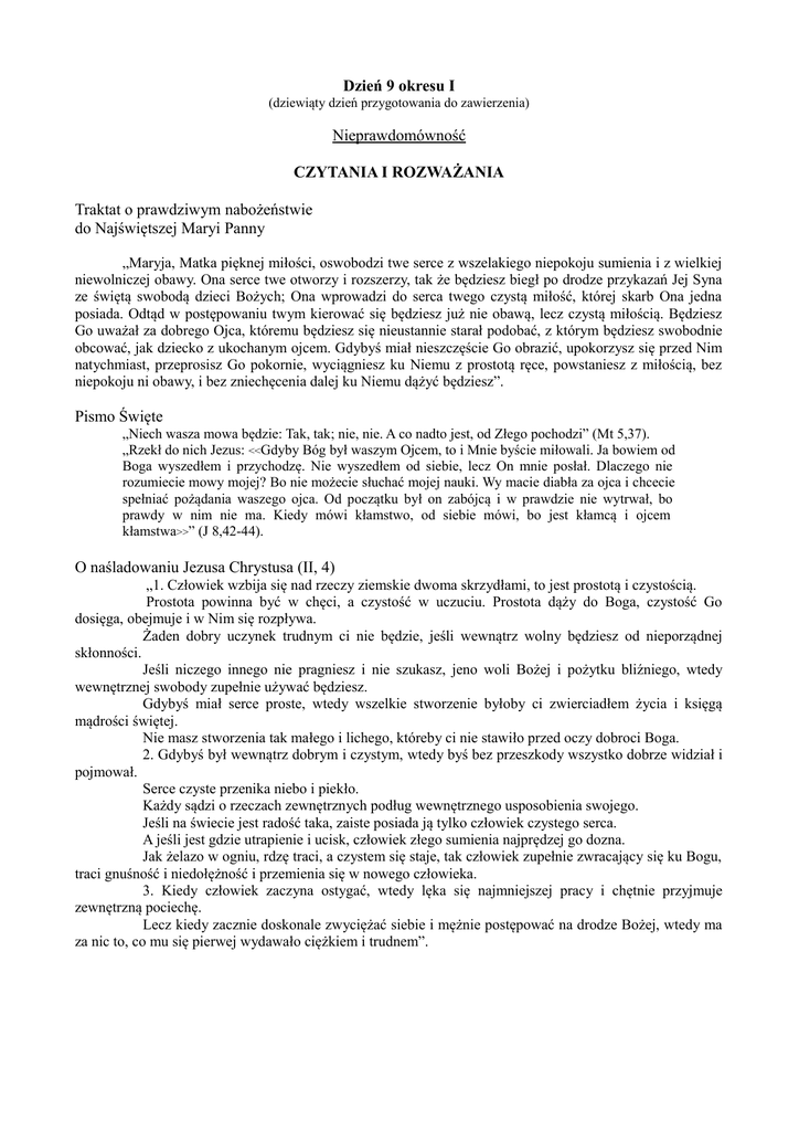 Dzień 9 okresu I (dziewiąty dzień przygotowania do zawierzenia) Nieprawdomówność CZYTANIA I ROZWAŻANIA Traktat o prawdziwym nabożeństwie do Najświętszej Maryi Panny „Maryja, Matka pięknej miłości, oswobodzi twe serce z wszelakiego niepokoju sumienia i z wielkiej niewolniczej obawy. Ona serce twe otworzy i rozszerzy, tak że będziesz biegł po drodze przykazań Jej Syna ze świętą swobodą dzieci Bożych; Ona wprowadzi do serca twego czystą miłość, której skarb Ona jedna posiada. Odtąd w postępowaniu twym kierować się będziesz już nie obawą, lecz czystą miłością. Będziesz Go uważał za dobrego Ojca, któremu będziesz się nieustannie starał podobać, z którym będziesz swobodnie obcować, jak dziecko z ukochanym ojcem. Gdybyś miał nieszczęście Go obrazić, upokorzysz się przed Nim natychmiast, przeprosisz Go pokornie, wyciągniesz ku Niemu z prostotą ręce, powstaniesz z miłością, bez niepokoju ni obawy, i bez zniechęcenia dalej ku Niemu dążyć będziesz”. Pismo Święte „Niech wasza mowa będzie: Tak, tak; nie, nie. A co nadto jest, od Złego pochodzi” (Mt 5,37). „Rzekł do nich Jezus: <<Gdyby Bóg był waszym Ojcem, to i Mnie byście miłowali. Ja bowiem od Boga wyszedłem i przychodzę. Nie wyszedłem od siebie, lecz On mnie posłał. Dlaczego nie rozumiecie mowy mojej? Bo nie możecie słuchać mojej nauki. Wy macie diabła za ojca i chcecie spełniać pożądania waszego ojca. Od początku był on zabójcą i w prawdzie nie wytrwał, bo prawdy w nim nie ma. Kiedy mówi kłamstwo, od siebie mówi, bo jest kłamcą i ojcem kłamstwa>>” (J 8,42-44). O naśladowaniu Jezusa Chrystusa (II, 4) „1. Człowiek wzbija się nad rzeczy ziemskie dwoma skrzydłami, to jest prostotą i czystością. Prostota powinna być w chęci, a czystość w uczuciu. Prostota dąży do Boga, czystość Go dosięga, obejmuje i w Nim się rozpływa. Żaden dobry uczynek trudnym ci nie będzie, jeśli wewnątrz wolny będziesz od nieporządnej skłonności. Jeśli niczego innego nie pragniesz i nie szukasz, jeno woli Bożej i pożytku bliźniego, wtedy wewnętrznej swobody zupełnie używać będziesz. Gdybyś miał serce proste, wtedy wszelkie stworzenie byłoby ci zwierciadłem życia i księgą mądrości świętej. Nie masz stworzenia tak małego i lichego, któreby ci nie stawiło przed oczy dobroci Boga. 2. Gdybyś był wewnątrz dobrym i czystym, wtedy byś bez przeszkody wszystko dobrze widział i pojmował. Serce czyste przenika niebo i piekło. Każdy sądzi o rzeczach zewnętrznych podług wewnętrznego usposobienia swojego. Jeśli na świecie jest radość taka, zaiste posiada ją tylko człowiek czystego serca. A jeśli jest gdzie utrapienie i ucisk, człowiek złego sumienia najprędzej go dozna. Jak żelazo w ogniu, rdzę traci, a czystem się staje, tak człowiek zupełnie zwracający się ku Bogu, traci gnuśność i niedołężność i przemienia się w nowego człowieka. 3. Kiedy człowiek zaczyna ostygać, wtedy lęka się najmniejszej pracy i chętnie przyjmuje zewnętrzną pociechę. Lecz kiedy zacznie doskonale zwyciężać siebie i mężnie postępować na drodze Bożej, wtedy ma za nic to, co mu się pierwej wydawało ciężkiem i trudnem”. MODLITWY „Przybądź, Duchu Święty” Przybądź, Duchu Święty, Spuść z niebiosów wzięty Światła Twego strumień. Przyjdź, Ojcze ubogich, Dawco darów mnogich, Przyjdź Światłości sumień! O najmilszy z Gości, Słodka serc radości, Słodkie orzeźwienie. W pracy Tyś ochłodą, W skwarze żywą wodą, W płaczu utulenie. Światłości najświętsza! Serc wierzących wnętrza Poddaj swej potędze! Bez Twojego tchnienia Cóż jest wśród stworzenia? Jeno cierń i nędze! Obmyj, co nieświęte, Oschłym wlej zachętę, Ulecz serca ranę! Nagnij, co jest harde, Rozgrzej serca twarde, Prowadź zabłąkane. Daj Twoim wierzącym, W Tobie ufającym, Siedmiorakie dary! Daj zasługę męstwa, Daj wieniec zwycięstwa, Daj szczęście bez miary. Ave maris stella 1. Ave, maris stella, Dei Mater alma, Atque semper Virgo Felix coeli porta. 1. Witaj, Gwiazdo morza, Wielka Matko Boga, Panno zawsze czysta, Bramo niebios błoga. 2. Sumens illud Ave Gabriélis ore, Funda nos in pace, Mutans Hevae nomen. 2. Ty, coś Gabriela Słowem przywitana, Utwierdź nas w pokoju, Odmień Ewy miano. 3. Solve vincla reis, Profer lumen caecis, Mala nostra pelle, Bona cuncta posce, 3. Winnych wyzwól z więzów, Ślepym powróć blaski. Oddal nasze nędze, Uproś wszelkie łaski. 4. Monstra te esse Matrem, Sumat per te preces, Qui pro nobis natus, 4. Okaż, żeś jest Matką, Wzrusz modłami swymi Tego, co Twym Synem Tulit esse tuus, Zechciał być na ziemi. 5. Virgo singuláris, Inter omnes mitis, Nos culpis solútos, Mites fac et castos. 5. O Dziewico sławna I pokory wzorze, Wyzwolonym z winy Daj nam żyć w pokorze. 6. Vitam praesta puram Iter para tutum, Ut vidéntes Jesum, Semper collaetémur. 6. Daj wieść życie czyste, Drogę ściel bezpieczną, Widzieć daj Jezusa, Mieć w Nim radość wieczną. 7. Sit laus Deo Patri, Summo Christo decus Spiritui Sancto, Tribus honor unus. Amen. 7. Bogu Ojcu chwała, Chrystusowi pienie, Obu z Duchem Świętym Jedno uwielbienie. Amen.