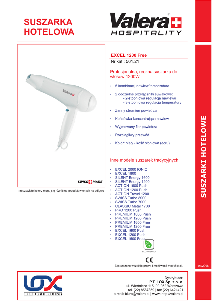 SUSZARKA HOTELOWA EXCEL 1200 Free Nr kat.: 561.21 Profesjonalna, rêczna suszarka do w³osów 1200W ? 5 kombinacji nawiew/temperatura ? 2 oddzielne prze³¹czniki suwakowe: - 2-stopniowa regulacja nawiewu - 3-stopniowa regulacja temperatury ? Koñcówka koncentruj¹ca nawiew ? Wyjmowany filtr powietrza ? Rozci¹gliwy przewód ? Kolor: bia³y - koœæ s³oniowa (ecru) Inne modele suszarek tradycyjnych: rzeczywiste kolory mog¹ siê ró¿niæ od przedstawionych na zdjêciu ? EXCEL 2000 IONIC ? EXCEL 1800 ? SILENT Energy 1600 ? SILENT Energy 1200 ? ACTION 1600 Push ? ACTION 1200 Push ? ACTION Travel 1200 ? SWISS Turbo 8000 ? SWISS Turbo 7000 ? CLASSIC Metal 1700 ? PRO 1200 Push ? PREMIUM 1600 Push ? PREMIUM 1200 Push ? PREMIUM 1600 Free ? PREMIUM 1200 Free ? EXCEL 1600 Push ? EXCEL 1200 Push ? EXCEL 1600 Free SUSZARKI HOTELOWE ? Zimny strumieñ powietrza ECO-FRIENDLY Zastrze¿one wszelkie prawa i mo¿liwoœæ modyfikacji. Dystrybutor: P.T. LOX Sp. z o. o. ul. Wiertnicza 115, 02-952 Warszawa tel. (22) 8587859 | fax (22) 6421421 e-mail: [email protected] | www: http://valera.pl 01/2008