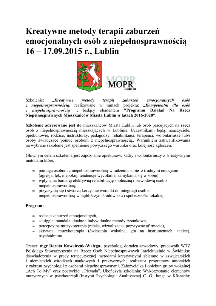Kreatywne metody terapii zaburzeń emocjonalnych osób z niepełnosprawnością 16 – 17.09.2015 r., Lublin Szkolenie: „Kreatywne metody terapii zaburzeń emocjonalnych osób z niepełnosprawnością, realizowane w ramach projektu: „Kompetentni dla osób z niepełnosprawnością” , będący elementem "Programu Działań Na Rzecz Niepełnosprawnych Mieszkańców Miasta Lublin w latach 2016-2020". Szkolenie adresowane jest do mieszkańców Miasta Lublin lub osób pracujących na rzecz osób z niepełnosprawnością mieszkających w Lublinie. Uczestnikami będą: nauczyciele, opiekunowie, rodzice, instruktorzy, pedagodzy, rehabilitanci, terapeuci, wolontariusze lub/i osoby świadczące pomoc osobom z niepełnosprawnością.. Warunkiem zakwalifikowania na wybrane szkolenie jest spełnienie powyższego warunku oraz kolejność zgłoszeń. Głównym celem szkolenia jest zapoznanie opiekunów, kadry i wolontariuszy z kreatywnymi metodami które: • • • pomogą osobom z niepełnosprawnością w radzeniu sobie z trudnymi emocjami (agresja, lęk, niepokój, tendencje wycofania, zamykania się w sobie); wpłyną na bardziej efektywną rehabilitację społeczną i zawodową osób z niepełnosprawnością; przyczynią się i stworzą korzystne warunki do integracji osób z niepełnosprawnością w najbliższym środowisku i społeczności lokalnej. Program: • • • • rodzaje zaburzeń emocjonalnych, squiggle, mandala, dualne i indywidualne metody rysunkowe, percepcyjna muzykoterapia (relaks, wizualizacje, pozytywne afirmacje), aktywna, muzykoterapia (ćwiczenia wokalne, gra na instrumentach, taniec), psychodrama. Trener: mgr Dorota Kowalczuk-Wałęga– psycholog, doradca zawodowy, pracownik WTZ Polskiego Stowarzyszenia na Rzecz Osób Niepełnosprawnych Intelektualnie w Świdniku; doświadczenia w pracy terapeutycznej metodami kreatywnymi zbierane w szwajcarskich i niemieckich ośrodkach naukowych i praktycznych; realizator programów autorskich z zakresu psychologii z osobami niepełnosprawnymi. Założycielka i opiekun grupy wokalnej „Ach To My” oraz poetyckiej „Pleyada”. Ukończyła szkolenia: Wykorzystanie elementów muzycznych w psychoterapii (Instytut Psychologii Analitycznej C. G. Junga w Küsnacht; Uzdrawiająca moc relacji – taniec, psychodrama (Ośrodek Terapii i Rozwoju w Świdniku); Techniki teatroterapii i muzykoterapii w pracy z osobami z autyzmem i zespołem Aspergera (Centrum voorAutisme dr. Leo Kannerhuis w Holandii, Synapsis w Warszawie). Termin szkolenia: 16-17.09.2016 r. Wymiar godzin: 16 h Cena szkolenia: 50 zł Termin płatności: do 10.09. 2015 r. na konto nr 48 1240 2470 1111 0010 5913 6520 Miejsce realizacji projektu: Gimnazjum i LO im. Kazimierza Wielkiego w Lublinie Al. Racławickie 17, 20-059 Lublin Jeżeli są Państwo zainteresowani udziałem w naszym szkoleniu, prosimy o wypełnienie formularza zgłoszeniowego oraz jego przesłanie na adres: [email protected] Serdecznie zapraszamy! Zarząd Fundacji „Dla Pokoleń”