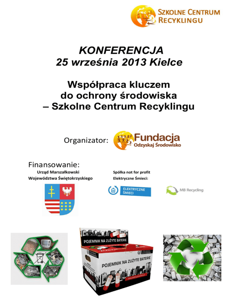 KONFERENCJA 25 września 2013 Kielce Współpraca kluczem do ochrony środowiska – Szkolne Centrum Recyklingu Organizator: Finansowanie: Urząd Marszałkowski Województwa Świętokrzyskiego Spółka not for profit Elektryczne Śmieci: Współpraca kluczem do ochrony środowiska – SZKOLNE CENTRUM RECYKLINGU AGENDA KONFERENCJI 25 września 2013 r. Sala DELTA w nowym Centrum Kongresowym Targów Kielce (Kielce, Zakładowa 1) 9.00 – 9.30 – serwis kawowy - kawa powitalna; rejestracja uczestników i odbiór materiałów szkoleniowych 9.30 – 10.20 – Recykling – moda czy konieczność? Zadbaj o środowisko w gminie, w domu i w szkole – Marta Szczecińska, Fundacja Odzyskaj Środowisko, Manager Projektu 10.20 –11.00 – Model współpracy organizacji pozarządowych, placówek oświatowych i jednostek samorządu terytorialnego w zakresie edukacji ekologicznej, Łukasz Chlebny, prawnik, specjalista w zakresie współpracy jednostek samorządu terytorialnego oraz organizacji pozarządowych 11.00 – 11.30 – Jak prowadzić działania pro ekologiczne w szkołach? – Marek Łabno, twórca projektu segreguj.pl 12.00 – 13.00 - Założenia projektu Szkolne Centrum Recyklingu i Warsztaty - korzystanie z nowoczesnych metod i platformy edukacyjnej stworzonej na potrzeby projektu SCR, Beata Bartosiak, Fundacja Odzyskaj Środowisko, Kierownik Projektu 13.00 – 13.30 – panel dyskusyjny z prelegentami 13.30 – obiad 3 MATERIAŁY KONFERENCYJNE – SPIS TREŚCI Recykling – moda czy konieczność? Zadbaj o środowisko w gminie, w domu i w szkole – Marta Szczecińska - str. 5 Model współpracy organizacji pozarządowych, placówek oświatowych i jednostek samorządu terytorialnego w zakresie edukacji ekologicznej, Łukasz Chlebny - str. 8 Jak prowadzić działania pro ekologiczne w szkołach? – Marek Łabno - str. 12 Założenia projektu Szkolne Centrum Recyklingu i Warsztaty - korzystanie z nowoczesnych metod i platformy edukacyjnej stworzonej na potrzeby projektu SCR, Beata Bartosiak- str. 15 4 Recykling – moda czy konieczność? Zadbaj o środowisko w gminie, w domu i w szkole Marta Szczecińska EKOLOGIA I RECYKLING Coraz częściej słyszymy o ekologii i recyklingu. W dużym stopniu przyczyniła się do tego ustawa o Utrzymaniu Czystości i Porządku w Gminach, ponieważ temat gospodarki odpadami nagłaśniały media. Z drugiej strony pojawiają się trendy w sztuce i wzornictwie, gdzie stosuje się zużyte przedmioty do stworzenia nowych: trash art. (szuka śmieciowa) to tworzenie dział sztuki z odpadów, moda recyklingowa to tworzenie strojów i ubrań np. z opakowań, z folii itp., a upcycling to tworzenie nowych przedmiotów użytkowych z innych starych lub zużytych przedmiotów. Takie działania to „zabawa” śmieciami, która faktycznie może się przerodzić w trend służący ponownemu wykorzystaniu odpadów. Śledząc szum medialny możemy jednak mieć wrażenie, że ekologia i recykling stają się tylko pustymi słowami, a używające ich osoby, nie znają prawdziwego znaczenia tych pojęć. Czym zatem jest ekologia i recykling? Ekologia to: 1/ Nauka o strukturze i funkcjonowaniu przyrody, zajmująca się badaniem oddziaływań pomiędzy organizmami a ich środowiskiem oraz wzajemnie między tymi organizmami 2/ Działania propagujące ochronę środowiska Dobrze wiedzieć, że etymologia słowa ekologia oíkos (gr.) oznacza DOM, a logia to nauka. Zatem ekologia jest nauką o naszym domu! Czy dom to tylko nasze podwórko i nasze otoczenie? Oczywiście nie. Wiemy, przecież, że np. woda i powietrze są w ciągłym obiegu a zanieczyszczenie jednego obszaru powoduje zanieczyszczenie sąsiednich. To dlatego myśląc o ekologii nie możemy się zawężać do myślenia tylko o swoim sąsiedztwie, powinniśmy ją postrzegać jako zjawisko globalne. Recykling to: Przetwarzanie substancji lub materiałów zawartych w odpadach w procesie produkcyjnym w celu uzyskania substancji lub materiału o przeznaczeniu pierwotnym lub o innym przeznaczeniu (Ustawa o Odpadach) Recycle (ang.) powtórny cykl. Wyłącznie postępowanie zgodnie z zasadami recyklingu zapewnia prawidłowy cykl „życia” produktów (odpadów)! ZASADA 3 R – CZYLI PRAWIDŁOWE POSTĘPOWANIE KONSUMENTA Zasada 3 R to prosta i popularna zasada recyklingowa. Najważniejsze jednak, że podaje ona konsumentom, a więc każdemu z nas praktyczne zasady postępowania z produktami i z odpadami. 5 ZASADA 3 R to: • REDUCE (ang.) - ogranicz • REUSE (ang.) – użyj ponownie • RECYCLE (ang.) – przekaż do recyklingu lub odzysku Kolejność słów nie jest przypadkowa. Pierwszy etap to OGRANICZENIE. Ograniczyć możemy zarówno samą konsumpcję, a więc ilość kupowanych rzeczy, jak i ilość generowanych przez nas odpadów np. poprzez unikanie rzeczy nadmiernie opakowanych. Drugi element to PONOWNE UŻYCIE. Przypomina on o możliwości powtórnego wykorzystania produktów powszechnie uznanych za jednorazowe np. powszechnie używane reklamówki „jednorazówki” z powodzeniem mogą być wielokrotnie używane, musimy tylko pamiętać o tym, aby zabierać je ze sobą na zakupy. Inny aspekt zasady ponownego użycia, to np. przekazanie rzeczy, których już nie używamy, a są w dobrym stanie komuś, kto jeszcze z nich skorzysta – np. osobom potrzebującym, organizacjom charytatywnym itp. Ostatni etap PRZEKAŻ DO RECYKLINGU, mówi co należy zrobić w sytuacji, gdy nie będziemy już używać danego produktu (opakowania), a powstałego z niego odpadu nie da się wykorzystać ponownie. Takie przedmioty, śmieci trzeba przekazać do recyklingu. Co to oznacza w praktyce? To, że aby nasze śmieci zostały przetworzone, muszą zostać posegregowane JUŻ w naszych domach i wyrzucone w sposób SELEKTYWNYNY. Powinniśmy także pamiętać, że niektóre rodzaje odpadów mogą być wyrzucane wyłącznie do specjalnie wyznaczonych punktów (są to np. leki, elektryczne śmieci, baterie) tzw. punktów selektywnej zbiórk