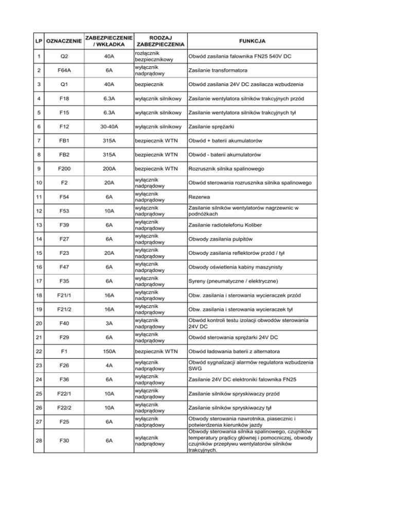 LP OZNACZENIE ZABEZPIECZENIE RODZAJ / WKŁADKA ZABEZPIECZENIA FUNKCJA 1 Q2 40A rozłącznik bezpiecznikowy Obwód zasilania falownika FN25 540V DC 2 F64A 6A wyłącznik nadprądowy Zasilanie transformatora 3 Q1 40A bezpiecznik Obwód zasilania 24V DC zasilacza wzbudzenia 4 F18 6.3A wyłącznik silnikowy Zasilanie wentylatora silników trakcyjnych przód 5 F15 6.3A wyłącznik silnikowy Zasilanie wentylatora silników trakcyjnych tył 6 F12 30-40A wyłącznik silnikowy Zasilanie sprężarki 7 FB1 315A bezpiecznik WTN Obwód + baterii akumulatorów 8 FB2 315A bezpiecznik WTN Obwód - baterii akumulatorów 9 F200 200A bezpiecznik WTN Rozrusznik silnika spalinowego 10 F2 20A wyłącznik nadprądowy Obwód sterowania rozrusznika silnika spalinowego 11 F54 6A wyłącznik nadprądowy Rezerwa 12 F53 10A wyłącznik nadprądowy Zasilanie silników wentylatorów nagrzewnic w podnóżkach 13 F39 6A wyłącznik nadprądowy Zasilanie radiotelefonu Koliber 14 F27 6A wyłącznik nadprądowy Obwody zasilania pulpitów 15 F23 20A wyłącznik nadprądowy Obwody zasilania reflektorów przód / tył 16 F47 6A wyłącznik nadprądowy Obwody oświetlenia kabiny maszynisty 17 F35 6A wyłącznik nadprądowy Syreny (pneumatyczne / elektryczne) 18 F21/1 16A wyłącznik nadprądowy Obw. zasilania i sterowania wycieraczek przód 19 F21/2 16A wyłącznik nadprądowy Obw. zasilania i sterowania wycieraczek tył 20 F40 3A wyłącznik nadprądowy Obwód kontroli testu izolacji obwodów sterowania 24V DC 21 F29 6A wyłącznik nadprądowy Obwód sterowania sprężarki 24V DC 22 F1 150A bezpiecznik WTN Obwód ładowania baterii z alternatora 23 F26 4A wyłącznik nadprądowy Obwód sygnalizacji alarmów regulatora wzbudzenia SWG 24 F36 6A wyłącznik nadprądowy Zasilanie 24V DC elektroniki falownika FN25 25 F22/1 10A wyłącznik nadprądowy Zasilanie silników spryskiwaczy przód 26 F22/2 10A wyłącznik nadprądowy Zasilanie silników spryskiwaczy tył 27 F25 6A wyłącznik nadprądowy 28 F30 6A wyłącznik nadprądowy Obwody sterowania nawrotnika, piasecznic i potwierdzenia kierunków jazdy Obwody sterowania silnika spalinowego, czujników temperatury prądicy głównej i pomocniczej, obwody czujników przepływu wentylatorów silników trakcyjnych. 29 F34 6A wyłącznik nadprądowy Obwody sterowania i zasilania 24V DC sterownika hamulca lokomotywy BCU i tablicy pneumatycznej 30 F38 16A wyłącznik nadprądowy Zasilanie grzałki podgrzewania paliwa 31 36F1 6A wyłącznik nadprądowy 32 36F2 6A wyłącznik nadprądowy 33 F55A 1A wyłącznik nadprądowy Zasilanie sterownika kontroli poślizgu 34 F55B 4A wyłącznik nadprądowy Zasilanie czujników poślizgu PIAP 35 F59 40A wyłącznik nadprądowy Klimatyzator 36 F60 32A wyłącznik nadprądowy Klimatyzator 37 F37 6A wyłącznik nadprądowy Obwód zasilania centralki i terminala p. poż 38 F45 6A wyłącznik nadprądowy Lodówka zasilanie 39 F41 16A wyłącznik nadprądowy Oświetlenie przedziałów maszynowych i stopni 24V DC 40 F42 10A wyłącznik nadprądowy Zasilanie gniazd 24V na ostoi z przodu i z tyłu pojazdu 41 F43 10A wyłącznik nadprądowy Sterowanie styczników liniowych i bocznikowania 42 F46C 3A wyłącznik nadprądowy Zasilanie nagrzewnic elektrycznych w kabinie 43 F57 3A wyłącznik nadprądowy Obwód sterowania i sygnalizacji podgrzewania szyb 44 F66 6A wyłącznik nadprądowy Zasilanie sterownika jazdy wielokrotnej 45 F2S 16A wyłącznik nadprądowy Zasilanie modułów sterownika głównego maszyny (SELECTRON) 46 F2S/1 6A wyłącznik nadprądowy Zasilacz sterownika głównego maszyny (SELECTRON) 47 F48 3A wyłącznik nadprądowy Zasilanie zegara preselekcyjnego WEBASTO 48 F56 6A wyłącznik nadprądowy Rejestrator paliwa ELTE 49 F58 3A wyłącznik nadprądowy Obwód zasilania styczników obwodów sterowania OZL+, OZL- 50 F62 16A wyłącznik nadprądowy Podgrzewanie wody 51 F63 6A wyłącznik nadprądowy Obwód zasilania wyświetlaczy pulpitowych PIXY 52 F49 6A wyłącznik nadprądowy Zasilanie WEBASTO 53 F50 25A wyłącznik nadprądowy Zasiltanie WEBASTO 54 F51 25A wyłącznik nadprądowy Zasilanie WEBASTO 55 F65 3A wyłącznik nadprądowy Grzałki podgrzewania oleju sprężarki 56 F57A 25A wyłącznik nadprądowy Grzałki podgrzewania szyb 57 F46B 10A wyłącznik nadprądowy Nagrzewnice elektryczne kabinowe - grzałki 58 F46A 10A wyłącznik nadprądowy Płyta grzewcza (kuchenka) Obwód zasilania czuwaka CA i obw. zas./ster. zaworu SIFA CA tablicy pneumatycznej Obwód zasilania czuwaka RADIO STOP i obw. zas./ster. zaworu SIFA RADIO STOP tablicy pneumatycznej