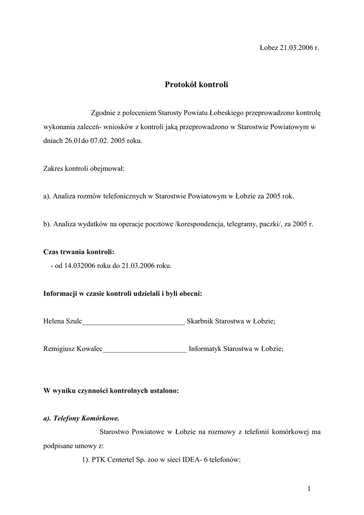 Łobez 21.03.2006 r. Protokół kontroli Zgodnie z poleceniem Starosty Powiatu Łobeskiego przeprowadzono kontrolę wykonania zaleceń- wniosków z kontroli jaką przeprowadzono w Starostwie Powiatowym w dniach 26.01do 07.02. 2005 roku. Zakres kontroli obejmował: a). Analiza rozmów telefonicznych w Starostwie Powiatowym w Łobzie za 2005 rok. b). Analiza wydatków na operacje pocztowe /korespondencja, telegramy, paczki/, za 2005 r. Czas trwania kontroli: - od 14.032006 roku do 21.03.2006 roku. Informacji w czasie kontroli udzielali i byli obecni: Helena Szulc____________________________ Skarbnik Starostwa w Łobzie; Remigiusz Kowalec_______________________ Informatyk Starostwa w Łobzie; W wyniku czynności kontrolnych ustalono: a). Telefony Komórkowe. Starostwo Powiatowe w Łobzie na rozmowy z telefonii komórkowej ma podpisane umowy z: 1). PTK Centertel Sp. zoo w sieci IDEA- 6 telefonów; 1 2). PLUS GSM - 1 telefon; Szczegółowy wykaz wartości rozmów telefonicznych poszczególnych numerów z telefonii komórkowej w 2005 roku przedstawia zamieszczona poniżej tabela. WYKAZ WARTOŚCI ROZMÓW Z TELEFONII KOMÓRKOWEJ IDEA Numer telefonu SP a I II III IV V VI 353,25 251,29 242,49 268,22 265,4 264,12 250,97 146,51 141,18 139,67 124,37 153,67 302,78 342,4 371,51 212,08 283,5 222,85 142,4 143,2 136,05 116,88 118,04 115,28 SE c 80,8 80 80,35 60,16 60 60 GK c 88,34 87,19 98,86 63,76 60,16 60,32 IX X XI XII WS b CZ b BR b VII VIII 288,4 310,75 229,39 267,17 220,72 224,56 3185,76 WS b 160,64 139,87 182,84 146,49 188,8 168,61 1943,62 CZ b 290,15 583,69 280,24 251,79 215,48 214,99 3571,46 BR 123,21 119 117,04 117,68 115,22 115,76 1479,76 SE c 60 60 60,56 60,16 60,24 60 782,27 GK c 65,56 60 61,39 63,16 61 66,95 836,69 III IV SP a b ceny netto PLUS Numer telefonu SEKRETARIAT d I 236,68 VII 449,77 II 285,6 VIII 126,65 362,58 IX 423,99 245,59 X 366,83 V 298,66 XI 442,49 VI 238,24 XII 389,86 ceny brutto 3866,94 2 a - Pakiet Idea Top Firma 400 - 240 zł b- Pakiet Idea Top Firma 200 - 140 zł c- Pakiet Idea Top Firma 100 - 80 zł d- Pakiet Plus Lider 300 - 193,50 / 236,07 zł MIESIĘCZNY WYKAZ WARTOŚCI ROZMÓW TELEFONICZNYCH W 2005 ROKU. Idea Top Firma I II III IV V VI VII VIII IX X XI XII Plus Lider 1485,64 1281,72 1342,54 1050,14 1112 1069,01 1205,31 1553,43 1136,38 1105,87 1 051 1038,06 I II III IV V VI VII VIII IX X XI XII 14431,1 236,68 285,6 362,58 245,59 298,66 238,24 449,77 126,65 423,99 366,83 442,49 389,86 3866,94 Telefon Komórkowy na kartę – IDEA xxxx - Członek Zarządu miesiąc III VI VII IX XI kwota 50 ZŁ 50 ZŁ 50 ZŁ 50 ZŁ 50 ZŁ 250 ZŁ Łączna wartość rozmów przez telefonię komórkową wynosi 18548,02 złotych. W celu obniżenia kosztów telefonii komórkowej Starostwo Powiatowe w Łobzie od września 2005 roku zmieniło Pakiety w Idea Top Firma na bardziej ekonomiczne. b). Telefony stacjonarne. 3 Starostwo Powiatowe w Łobzie ma podpisaną umowę z Telekomunikacją Polską S.A. na korzystanie z usług telefonii stacjonarnej. Koszty rozmów telefonii stacjonarnej, jakie poddano analizie w 2005 roku przedstawia poniższa tabela. miesiąc I II III IV V VI VII VIII IX X XI XII kwota 3937,04 4227,29 4205,57 4640,62 4198,67 4299,32 4757,67 4104,68 4160,86 4425,32 4430,61 4060,76 51449,63 W kwocie 51449,63 złotych zawiera się opłata za korzystanie z Internetu - 4611,55 złotych. Na rozmowy telefoniczne Starostwa Powiatowego w roku 2005wykorzystało kwotę 62963 złotych, a 2004 roku wykorzystano kwotę 60303 złotych Wszystkie rozmowy telefoniczne, które zamawiane są przez pracowników Starostwa za pośrednictwem centralki telefonicznej znajdującej się w pokoju ‘’Informacji Starostwa”, są odnotowane w zeszycie: „ Rejestr rozmów telefonicznych.” W 2005 roku zapisano w zeszycie ‘’Rejestr rozmów telefonicznych” 778 rozmów telefonicznych do wszystkich typów sieci telefonicznych. Wszystkie faktury są sprawdzone pod względem formalnym i merytorycznorachunkowym przez osoby odpowiedzialne za prawidłowe funkcjonowanie kontrolowanej jednostki budżetowej. c). Wydatki na operacje pocztowe/korespondencja, telegramy, paczki w 2005 roku: Korespondencję wysyłaną z Starostwa zapisuje się w dwóch dziennikach: 1. „ Dziennik korespondencyjny”, w którym prowadzona jest ewidencja poczty wychodzącej – wszystkie listy zwykłe , listy ze zwrotnym potwierdzeniem odbioru na terenie miasta Łobez. 2. „ Pocztowa książka nadawcza”, gdzie prowadzona jest ewidencja korespondencji wychodzącej – listy polecone i ze zwrotnym potwierdzeniem odbioru poza terenem Łobza. 4 Decyzję o formie wysyłania korespondencji podejmują dyrektorzy wydziałów. Wszystkie pisma wychodzące z Starostwa Powiatowego zawierające decyzje urzędowe, od których przysługuje środek odwoławczy są wysyłane za zwrotnym potwierdzeniem odbioru. Reguluje to kodeks postępowania administracyjnego. Poniżej przedstawiono zestawienie korespondencji 2003- 2005 rok. ZESTAWIENIE KORESPONDENCJI WYCHODZĄCEJ POWIATOWEGO W ŁOBZIE W LATACH 2003-2005 R. Z STAROSTWA ZESTAWIENIE KORESPONDENCJI ZA ROK 2003 Rodzaj Listu Ilość w szt. cena za szt. rozniesiono przez stażystów Wysłano listy zwykłe 5 648 1.20 823 4 825 listy polecone 1 174 3.40 1 174 listy ze zwrotnym potwierdzeniem odbioru od 5.40 do 8 zł ( cena zależna 3 394 od wagi) 3 394 9 393 Wysłano ogółem 823 Rozniesiono ogółem Razem 10 216 szt. ZESTAWIENIE KORESPONDENCJI ZA ROK 2004 Rodzaj Listu listy zwykłe listy polecone listy ze zwrotnym potwierdzeniem odbioru listy zwykłe Jurek Grzesiek listy polecone Jurek Grzesiek listy ze zwrotnym potwierdzeniem odbioru Jurek Grzesiek Wysłano ogółem Ilość w szt. cena za szt. 5 730 1.25 od 3.50 do 10 zł ( cena zależna 852 od wagi) od 5.50 do (cena 4 073 zależna od wagi) rozniesiono przez stażystów Wysłano 1 462 4 268 852 4 073 1 250 225 879 9 193 5 1 462 Rozniesiono ogółem Razem 13 009 szt. ZESTAWIENIE KORESPONDENCJI ZA ROK 2005 Rodzaj Listu Ilość w szt. cena za szt. listy