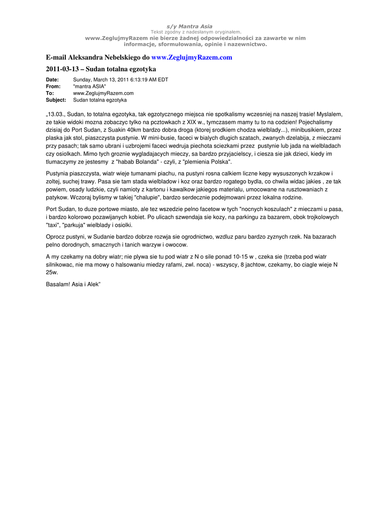 s/y Mantra Asia Tekst zgodny z nadesłanym oryginałem. www.ZeglujmyRazem nie bierze żadnej odpowiedzialności za zawarte w nim informacje, sformułowania, opinie i nazewnictwo. E-mail Aleksandra Nebelskiego do www.ZeglujmyRazem.com 2011-03-13 – Sudan totalna egzotyka Date: From: To: Subject: Sunday, March 13, 2011 6:13:19 AM EDT "mantra ASIA" www.ZeglujmyRazem.com Sudan totalna egzotyka „13.03., Sudan, to totalna egzotyka, tak egzotycznego miejsca nie spotkalismy wczesniej na naszej trasie! Myslalem, ze takie widoki mozna zobaczyc tylko na pcztowkach z XIX w., tymczasem mamy tu to na codzien! Pojechalismy dzisiaj do Port Sudan, z Suakin 40km bardzo dobra droga (ktorej srodkiem chodza wielblady...), minibusikiem, przez plaska jak stol, piaszczysta pustynie. W mini-busie, faceci w bialych dlugich szatach, zwanych dzelabija, z mieczami przy pasach; tak samo ubrani i uzbrojemi faceci wedruja piechota sciezkami przez pustynie lub jada na wielbladach czy osiolkach. Mimo tych groznie wygladajacych mieczy, sa bardzo przyjacielscy, i ciesza sie jak dzieci, kiedy im tlumaczymy ze jestesmy z "habab Bolanda" - czyli, z "plemienia Polska". Pustynia piaszczysta, wiatr wieje tumanami piachu, na pustyni rosna calkiem liczne kepy wysuszonych krzakow i zoltej, suchej trawy. Pasa sie tam stada wielbladow i koz oraz bardzo rogatego bydla, co chwila widac jakies , ze tak powiem, osady ludzkie, czyli namioty z kartonu i kawalkow jakiegos materialu, umocowane na rusztowaniach z patykow. Wczoraj bylismy w takiej "chalupie", bardzo serdecznie podejmowani przez lokalna rodzine. Port Sudan, to duze portowe miasto, ale tez wszedzie pelno facetow w tych "nocnych koszulach" z mieczami u pasa, i bardzo kolorowo pozawijanych kobiet. Po ulicach szwendaja sie kozy, na parkingu za bazarem, obok trojkolowych "taxi", "parkuja" wielblady i osiolki. Oprocz pustyni, w Sudanie bardzo dobrze rozwja sie ogrodnictwo, wzdluz paru bardzo zyznych rzek. Na bazarach pelno dorodnych, smacznych i tanich warzyw i owocow. A my czekamy na dobry wiatr; nie plywa sie tu pod wiatr z N o sile ponad 10-15 w , czeka sie (trzeba pod wiatr silnikowac, nie ma mowy o halsowaniu miedzy rafami, zwl. noca) - wszyscy, 8 jachtow, czekamy, bo ciagle wieje N 25w. Basalam! Asia i Alek” s/y Mantra Asia 2 wg: http://maps.google.com/maps?hl=en&ie=UTF8&ll=24.246965,28.081055&spn=21.729036,47.900391&t=h&z=5