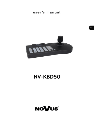 u s e r ’s m a n u a l NV-KBD50 NV-kBD50 ver. 1.0 - User’s manual INFORMATION EMC (2004/108/EC) and LVD (2006/95/EC ) Directives CE Marking Our products are manufactured to comply with the requirements of the following directives and national regulations implementing the directives: Electromagnetic compatibility EMC 2004/108/EC. Low voltage LVD 2006/95/EC with further amendment. The Directive applies to electrical equipment designed for use with a voltage rating of between 50VAC and 1000VAC as well as 75VDC and 1500VDC. WEEE Directive 2002/96/EC Information on Disposal for Users of Waste Electrical and Electronic Equipment This appliance is marked according to the European Directive on Waste Electrical and Electronic Equipment (2002/96/EC) and further amendments. By ensuring this product is disposed of correctly, you will help to prevent potential negative consequences for the environment and human health, which could otherwise be caused by inappropriate waste handling of this product. The symbol on the product, or the documents accompanying the product, indicates that this appliance may not be treated as household waste. It shall be handed over to the applicable collection point for used up electrical and electronic equipment for recycling purpose. For more information about recycling of this product, please contact your local authorities, your household waste disposal service or the shop where you purchased the product. RoHS Directive 2002/95/EC Out of concern for human health protection and friendly environment, we assure that our products falling under RoHS Directive regulations, regarding the restriction of the use of hazardous substances in electrical and electronic equipment, have been designed and manufactured in compliance with the above mentioned regulations. Simultaneously, we claim that our products have been tested and do not contain hazardous substances whose exceeding limits could have negative impact on human health or natural environment. Information The device, as a part of professional CCTV system used for surveillance and control, is not designed for self installation in households by individuals without technical knowledge. The manufacturer is not responsible for defects and damages that result from improper or inconsistent with user’s manual installation of the device in the system. All rights reserved © AAT Holding sp. z o.o. 2 NV-KBD50 ver. 1.0 - User’s manual SAFETY REQUIREMENTS WARNING! THE KNOWLEDGE OF THIS MANUAL IS AN INDESPENSIBLE CONDITION OF A PROPER DEVICE OPERATION. YOU ARE KINDLY REQUSTED TO FAMILIRIZE YOURSELF WITH THE MANUAL PRIOR TO INSTALLATION AND FURTHER DEVICE OPERATION. WARNING! USER IS NOT ALLOWED TO DISASSEMBLE THE CASING AS THERE ARE NO USER-SERVICEABLE PARTS INSIDE THIS UNIT. ONLY AUTHORIZED SERVICE PERSONNEL MAY OPEN THE UNIT INSTALLATION AND SERVICING SHOULD ONLY BE DONE BY QUALIFIED SERVICE PERSONNEL AND SHOULD CONFORM TO ALL LOCAL REGULATIONS WARNING! PRIOR TO UNDERTAKING ANY ACTION THAT IS NOT DESCRIBED FOR THE GIVEN PRODUCT IN USER’S MANUAL AND OTHER DOCUMENTS DELIVERED WITH THE PRODUCT, OR IF IT DOES NOT ARISE FROM THE USUAL APPLICATION OF THE PRODUCT, MANUFACTURER MUST BE CONTACTED UNDER THE RIGOR OF EXCLUDING THE MANUFACTURER’S RESPONSIBILITY FOR THE RESULTS OF SUCH AN ACTION. IMPORTANT SAFEGUARDS AND WARNINGS 1. Prior to undertaking any action please consult the following manual and read all the safety and operating instructions before starting the device. 2. Please keep this manual for the lifespan of the device in case referring to the contents of this manual is necessary; 3. All the safety precautions referred to in this manual should be strictly followed, as they have a direct influence on user’s safety and durability and reliability of the device; 4. All actions conducted by the servicemen and users must be accomplished in accordance with the user’s manual; 5. The device should be disconnected from power sources during maintenance procedures; 6. Usage of additional devices and components neither provided nor recommended by the producer is forbidden; 7. Device should be supplied only from a power sources whose parameters are in accordance with those specified by the producer in the camera technical datasheet. Therefore, it is forbidden to supply the camera from a power sources with unknown parameters, unstable or not meeting producer’s requirements; 8. User cannot repair or upgrade the equipment himself. All maintenance actions and repairs should be conducted only by qualified service personnel; 10. Unplug the keyboard from the power source immediately and contact the proper maintenance department in case of: Damages to the power cord or to the plug itself; Liquids getting inside the device or exposure to strong mechanical shock; Device behaves in a way not described in the manual and all adjustments approved by the manufacturer and possible to apply by user himself, seem not to have any effect; Keyboard is damaged; Atypical behaviour of the keyboard components may be seen (heard). ATTENTION! TECHNICAL CHANGES RESERVED WITHOUT PRIOR NOTICE AND PRINTING ERRORS POSSIBLE. All rights reserved © AAT Holding sp. z o.o. 3 NV-kBD50 ver. 1.0 - User’s manual FOREWORD INFORMATION 1. PACKAGE CONTENTS Keyboard User’s manual Power supply 12VDC If any of the listed equipment has been damaged during transport or if the package is incomplete, the contents of package should be packed back in to the original box. Please contact your local NOVUS distributor for further assistance. 2. MAIN CHARACTERISTICS Keyboard for remote control of NOVUS DVRs and cameras; Implemented DVR control protocols: N-Control; Able to control cameras utilizing N-Control, Pelco-D protocols; Three level access: ADMINISTRATOR, SUPERVISOR and USER; Control of up to 256 cameras, 256 DVRs is possible; 29 multifunctional buttons; 1 x 16 characters LCD display; 12 VDC power supply. Warning ! Due to risk of water condensation, if the device was brought fro