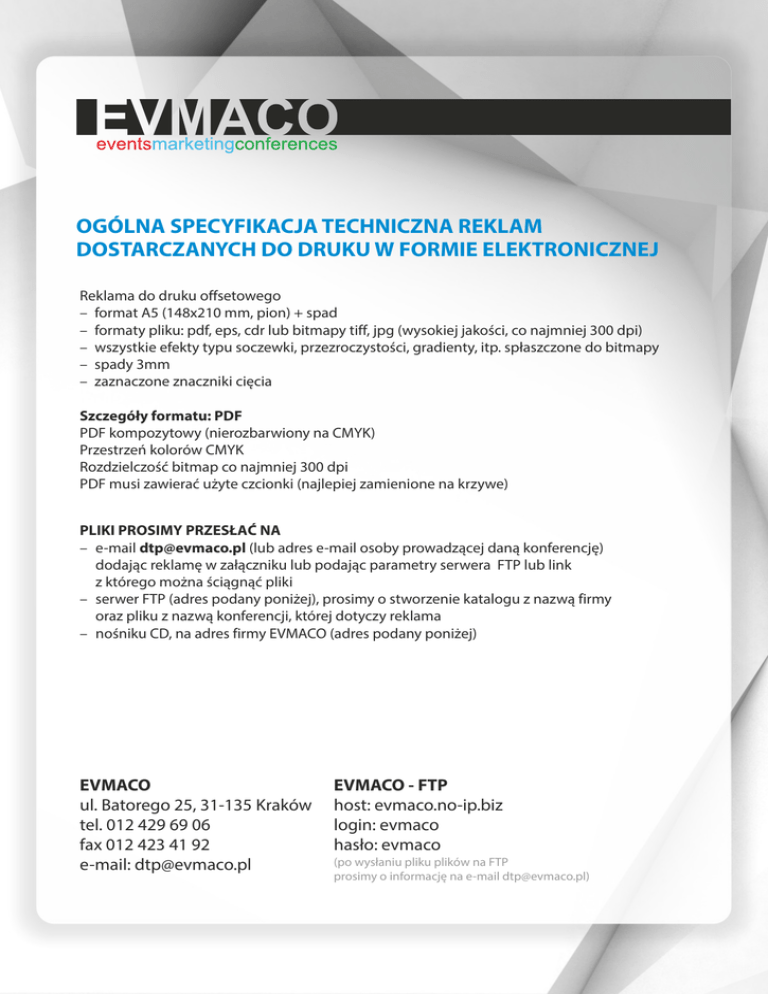 OGÓLNA SPECYFIKACJA TECHNICZNA REKLAM DOSTARCZANYCH DO DRUKU W FORMIE ELEKTRONICZNEJ Reklama do druku offsetowego – format A5 (148x210 mm, pion) + spad – formaty pliku: pdf, eps, cdr lub bitmapy tiff, jpg (wysokiej jakości, co najmniej 300 dpi) – wszystkie efekty typu soczewki, przezroczystości, gradienty, itp. spłaszczone do bitmapy – spady 3mm – zaznaczone znaczniki cięcia Szczegóły formatu: PDF PDF kompozytowy (nierozbarwiony na CMYK) Przestrzeń kolorów CMYK Rozdzielczość bitmap co najmniej 300 dpi PDF musi zawierać użyte czcionki (najlepiej zamienione na krzywe) PLIKI PROSIMY PRZESŁAĆ NA – e-mail [email protected] (lub adres e-mail osoby prowadzącej daną konferencję) dodając reklamę w załączniku lub podając parametry serwera FTP lub link z którego można ściągnąć pliki – serwer FTP (adres podany poniżej), prosimy o stworzenie katalogu z nazwą firmy oraz pliku z nazwą konferencji, której dotyczy reklama – nośniku CD, na adres firmy EVMACO (adres podany poniżej) EVMACO ul. Batorego 25, 31-135 Kraków tel. 012 429 69 06 fax 012 423 41 92 e-mail: [email protected] EVMACO - FTP host: evmaco.no-ip.biz login: evmaco hasło: evmaco (po wysłaniu pliku plików na FTP prosimy o informację na e-mail [email protected])