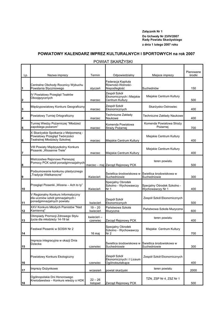 Załącznik Nr 1 Do Uchwały Nr 23/IV/2007 Rady Powiatu Skarżyskiego z dnia 1 lutego 2007 roku POWIATOWY KALENDARZ IMPREZ KULTURALNYCH I SPORTOWYCH na rok 2007 POWIAT SKARŻYSKI Lp. 1 2 3 4 Nazwa imprezy Centralne Obchody Rocznicy Wybuchu Powstania Styczniowego IV Powiatowy Przegląd Teatrów Obcojęzycznych Międzypowiatowy Konkurs Geograficzny Powiatowy Turniej Ortograficzny Termin Odpowiedzialny styczeń Federacja Kapituła Równość-WolnośćNiepodległość marzec Zespół Szkół Ekonomicznych i Miejskie Centrum Kultury marzec Zespół Szkół Ekonomicznych marzec Techniczne Zakłady Naukowe Techniczne Zakłady Naukowe Komenda Powiatowa Straży Pożarnej 5 Turniej Wiedzy Pożarniczej “Młodzież zapobiega pożarom” marzec Komenda Powiatowa Straży Pożarnej 6 X Skarżyskie Spotkania z Melpomeną Powiatowy Przegląd Twórczości Teatralnej Młodzieży Szkolnej marzec Miejskie Centrum Kultury marzec Miejskie Centrum Kultury 7 8 9 VIII Powiaty Międzyszkolny Konkurs Piosenki „Wiosenne Trele” Mistrzostwa Rejonowe Pierwszej Pomocy PCK szkół ponadgimnazjalnych Podsumowanie konkursu plastycznego „Tradycje Wielkanocne” 11 V Regionalny Konkurs Informatyczny dla uczniów szkół gimnazjalnych i ponadgimnazjalnych powiatu 12 XXV Konkurs Młodych Pianistów "Nad Kamienną" 13 Olimpiady Promocji Zdrowego Stylu życia dla młodzieży 14-19 lat 15 17 18 Imprezy Dożynkowe Ogólnopolskie Dni Honorowego Krwiodawstwa – Konkurs wiedzy o HDK 500 Skarżysko-Ostrowiec 400 400 700 400 400 teren powiatu 500 Kwiecień Świetlica środowiskowa w Świetlica środowiskowa w Suchedniowie Suchedniowie 300 Kwiecień Specjalny Ośrodek Szkolno - Wychowawczy Nr 1 400 kwiecień Zespół Szkół Ekonomicznych 19 – 20 kwiecień Państwowa Szkoła Muzyczna kwiecień – czerwiec Zarząd Rejonowy PCK Specjalny Ośrodek Szkolno - Wychowawczy Nr 2 Specjalny Ośrodek Szkolno Wychowawczy Nr 1 Zespół Szkół Ekonomicznych 500 Państwowa Szkoła Muzyczna teren powiatu 600 400 Miejskie Centrum Kultury 700 czerwiec Świetlica środowiskowa w Świetlica środowiskowa w Suchedniowie Suchedniowie 300 czerwiec Zespół Szkół Zespół Szkół Ekonomicznych Ekonomicznych i I Liceum Ogólnokształcące 400 wrzesień powiat skarżyski 22 – 26 listopad Zarząd Rejonowy PCK Powiatowy Konkurs Ekologiczny 16 Miejskie Centrum Kultury marzec – maj Zarząd Rejonowy PCK 16 maj Impreza integracyjna w okazji Dnia Dziecka 150 Miejskie Centrum Kultury Festiwal Piosenki w SOSW Nr 2 14 Suchedniów Planowane środki Miejskie Centrum Kultury Przegląd Piosenki „Wiosna – Ach to ty” 10 Miejsce imprezy teren powiatu 2000 TZN, ZSP Nr 4, ZSZ Nr 1 500 19 VI Mlodzieżowe Prezentacje Muzyczne listopad Miejskie Centrum Kultury 20 XXXIV Ogólnopolski Konkurs Recytatorski im. Leopolda Staffa grudzień Miejskie Centrum Kultury 21 Powiatowy Turniej piłki siatkowej nauczycieli styczeń Zespoół Szkół Budowlanych styczeń Kielecki Klub Karate Kyokushin 22 23 24 Zimowa Akademia Karate Indywidualne Mistrzostwa Polski seniorów w badmintonie Świętokrzyski Turniej Piłki Nożnej Olimpiad Specjalnych 25 Bieg Uliczny o "Błękitną Wstęgę Kamiennej" 26 XI Memoriał im. Prof.. H. Wytrzyszczewskiego 27 28 VI Ogólnopolski Wyścig Kolarski BLIZYN TOUR 2007 29 X Wakacyjny Turniej Piłkarski „Dolna Kamienna” 30 31 32 33 Komitet Regionalny Olimpiad Specjalnych Polska 800 Powiatowy Drużynowy Turniej Szachowy Szkół Ponadgimnazjalnych czerwiec II Liceum Ogólnokształcące czerwiec Zespół Szkól Ekonomicznych 38 39 Plac Floriański Gmiina Bliżyn Boisko piłkarskie ul. Org.Orzeł Biały Rejów 1100 300 500 1000 3000 październik Miejskie Centrum Kultury Miejskie Centrum Kultury 300 listopad Miejskie Centrum Kultury Miejskie Centrum Kultury 300 Gminne Zrzeszenie Ludowe – Zespoły Sportowe Skarżysko-Kościelne 300 wiosna Instytucja Kultury Kamionki Świetlica Gminnej Biblioteki Publicznej w Łącznej 300 1 czerwca Instytucja Kultury Kamionki Świetlica Gminnej Biblioteki Publicznej w Łącznej 300 i Bajkowy Świat Dziecka 37 II Liceum Ogólnokształcące 600 500 czerwiec Imprezy z Powiatowego Kalendarza Szkolnego Związku Sportowego Klub Osiedlowy „Dolna Kamienna” Komitet Organizacyjny Półmaratonu Osiedle Dolna Kamienna Rynek październik UKS „NIKE” Suchedniów Bieg Uliczny 36 Klub Olimpiada Skarżysko-Kamienna Suchedniów Suchedniów 34 35 500 28v – 29 kwiecień 18 sierpień XXI Powiatowy Drużynowy Turniej Szaradziarski Szkół Ponadgimnazjalnych Wiosenny Turniej Tenisa Stołowego “Piłkarzyków” Szkoły na terenie powiatu 300 500 Lipiec – sierpień Międzynarodowys Turniej Badmintona „Puchar Gór Świętokrzyskich” Zespoół Szkół Budowlanych 1100 MKS „Orlicz” Suchedniów MKS „Orlicz” Suchedniów Towarzystwo Przyjaciół 20 czerwca Bliżyna Półmaraton Skarżyski - Rejów Miejskie Centrum Kultury 400 2-4.02.07 maj Bieg uliczny Miejskie Centrum Kultury wg. odrębnego kalendarza, w terminach zgodnych z kalendarzem Szkolnego Związku Sportowego Inne imprezy kulturalne nie ujęte w powyższym zestawieniu Inne imprezy sportowe nie ujęte w powyższym zestawieniu 13500 2650 200