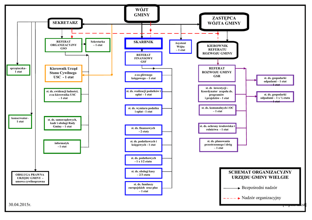 WÓJT GMINY ZASTĘPCA WÓJTA GMINY SEKRETARZ REFERAT ORGANIZACYJNY GSO Sekretarka – 1 etat SKARBNIK REFERAT FINANSOWY GSF sprzątaczka– 1 etat Kierownik Urząd Stanu Cywilnego USC - 1 etat st. ds. ewidencji ludności, z-ca kierownika USC – 1 etat konserwator– 1 etat st. ds. samorządowych, kadr i obsługi Rady Gminy – 1 etat informatyk - 1 etat z-ca głównego księgowego – 1 etat Asystent Wójta – 1 etat KIEROWNIK REFERATU ROZWOJU GMINY REFERAT ROZWOJU GMINY GSR st. ds. realizacji podatków i opłat – 1 etat st. ds inwestycji Koordynator zespołu ds. programów i projektów - 1 etat st. ds. wymiaru podatku i opłat - 1 etat st. ds. komunalnych i OC – 1 etat st. ds. finansowych - 2 etaty st. ds. podatkowych i księgowych - 1 etat st. ds. gospodarki odpadami – 1 etat – 1 etat st. ds. gospodarki odpadami – 1 x ½ etatu – 1 etat st. ds. ochrony środowiska i rolnictwa - 1 etat st. ds. planowania przestrzennego i dróg – 1 etat st. ds. podatkowych - 1 x 1/2 etatu OBSŁUGA PRAWNA URZĘDU GMINY umowa cywilnoprawna st. ds. obsługi kasy – 2/3 etatu st. ds. funduszy europejskich oraz płac – 1 etat SCHEMAT ORGANIZACYJNY URZĘDU GMINY WIELGIE Bezpośredni nadzór Nadzór organizacyjny 30.04.2015r. [Wpisz tekst]