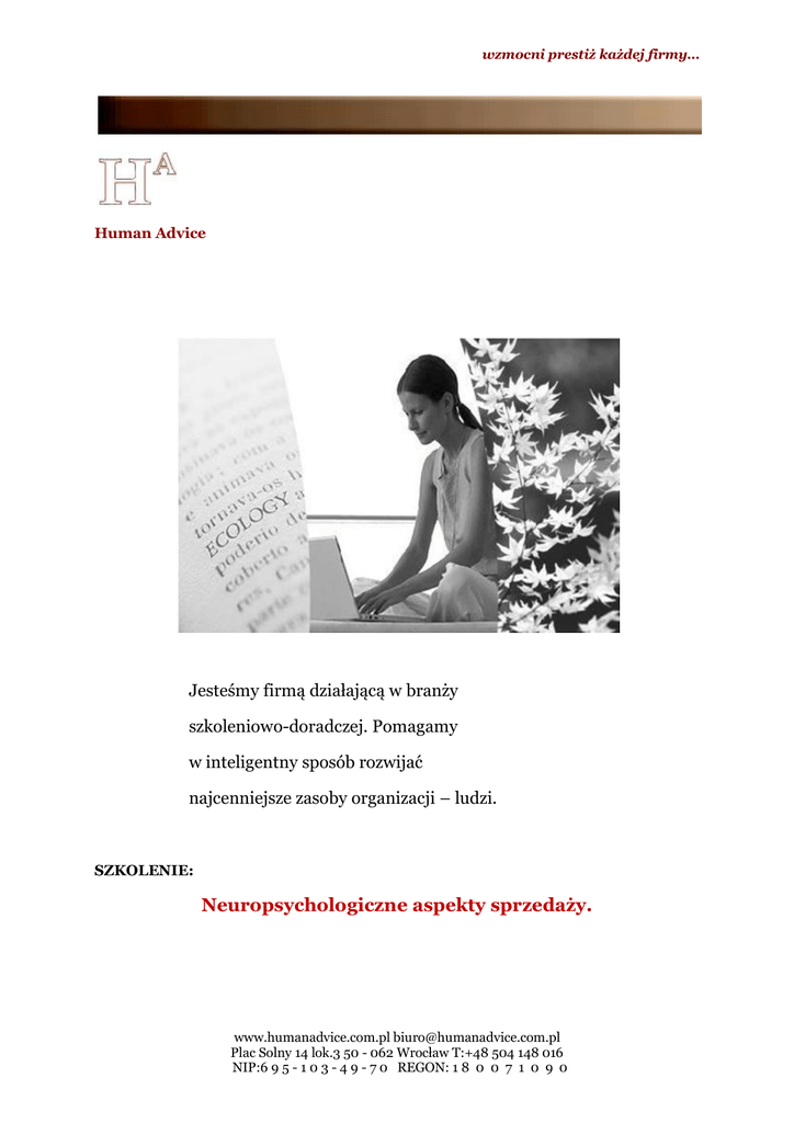wzmocni prestiż każdej firmy… Human Advice Jesteśmy firmą działającą w branży szkoleniowo-doradczej. Pomagamy w inteligentny sposób rozwijać najcenniejsze zasoby organizacji – ludzi. SZKOLENIE: Neuropsychologiczne aspekty sprzedaży. www.humanadvice.com.pl [email protected] Plac Solny 14 lok.3 50 - 062 Wrocław T:+48 504 148 016 NIP:6 9 5 - 1 0 3 - 4 9 - 7 0 REGON: 1 8 0 0 7 1 0 9 0 wzmocni prestiż każdej firmy… Human Advice Motto szkolenia: Ludzie nie kupują już butów tylko po to, aby mieć sucho i ciepło w stopy. Kupują zaś to, co pozwala im czuć się męsko, kobieco, silnie, oryginalnie, młodo, czarująco. Kupowanie butów stało się emocjonalnym przeżyciem. Nasz biznes dzisiaj to sprzedawanie nie tyle samych butów, co emocji.” Francis C. Rooney Profil uczestnika: szkolenie adresowane jest do osób zajmujących się sprzedażą Cele szkolenia: - rozwój umiejętności sprzedażowych - rozwój umiejętności przyciągania doskonałych klientów - rozwój umiejętności budowania trwałych relacji z klientami Czas i termin: jednodniowe Grupa szkoleniowa: 10 - 12 osób Forma i miejsce szkolenia: szkolenie zamknięte, wybór miejsca szkolenia w zakresie firmy (oddziały) lub na zewnątrz - do uzgodnienia Metody: trening interaktywny, ćwiczenia grupowe i indywidualne, „burza mózgów”, mapy myśli, case study- wymiana doświadczeń Materiały szkoleniowe i narzędzia: uczestnicy otrzymują materiały szkoleniowe +audiobook „Psychologia sprzedaży” -The Psychology of Sales– Brian Tracy + miesięczny dostęp do innowacyjnego systemu on-line wspomagającego interaktywną sprzedaż przez Internet – KomIQ+ książka „Sprzedawanie samego siebie” – K.Hogan i W.Horton Certyfikat: Przerwy: uczestnicy otrzymują Certyfikat potwierdzający uczestnictwo w szkoleniu przewidziane są przerwy na serwis kawowy oraz lunch Prezent: woda „POTENCJAŁKA” AOx Family PROPONOWANY PROGRAM TEMATYCZNY TRENINGU: 1. 2. 3. 4. 5. 6. 7. 8. 9. 10. 11. Zespołowe odkrycie celu procesu sprzedaży (świadomego i podświadomego) Uświadomienie sobie profilu doskonałego klienta firmy Uświadomienie sobie profilu doskonałego sprzedawcy Uświadomienie sobie własnych podświadomych celów, wartości i misji zawodowej sprzedawcy oraz dlaczego dobrze być sprzedawcą? Poziomy kompetencji sprzedaży: nieświadoma niekompetencja/świadoma niekompetencja /świadoma kompetencja/nieświadoma kompetencja Podświadoma komunikacja Neuropsychologia w sprzedaży - skuteczne techniki i narzędzia sprzedażowe Wiara we własne siły i potrzeba osiągnięć jako podstawy sukcesu w sprzedaży Sprzedaż jako proces zadawania pytań - scenariusz rozmowy sprzedażowej jako przykład inteligentnej komunikacji Autodiagnoza własnych mocnych stron i obszarów wymagających wzmocnienia Indywidualny Plan Działania – wybranego obszaru do rozwoju *powyższe informacje o szkoleniu nie stanowią oferty w rozumieniu Kodeksu Cywilnego Zapraszamy do kontaktu w celu przedstawienia oferty idealnej do Państwa potrzeb. www.humanadvice.com.pl [email protected] Plac Solny 14 lok.3 50 - 062 Wrocław T:+48 504 148 016 NIP:6 9 5 - 1 0 3 - 4 9 - 7 0 REGON: 1 8 0 0 7 1 0 9 0