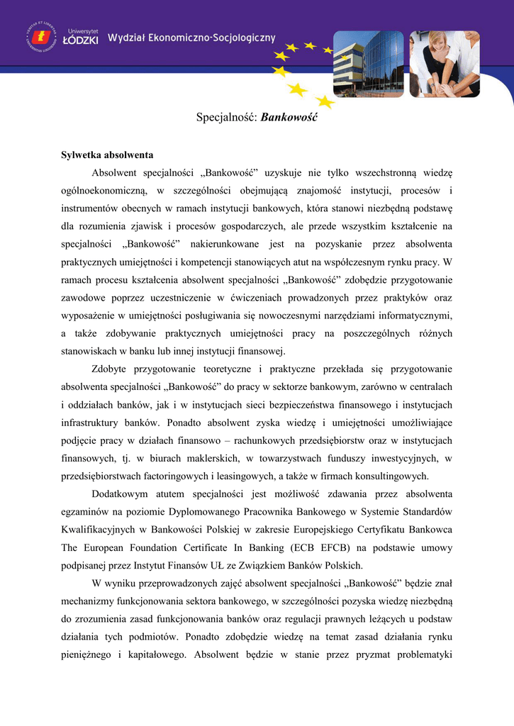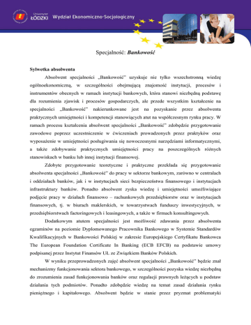 Specjalność: Bankowość Sylwetka absolwenta Absolwent specjalności „Bankowość” uzyskuje nie tylko wszechstronną wiedzę ogólnoekonomiczną, w szczególności obejmującą znajomość instytucji, procesów i instrumentów obecnych w ramach instytucji bankowych, która stanowi niezbędną podstawę dla rozumienia zjawisk i procesów gospodarczych, ale przede wszystkim kształcenie na specjalności „Bankowość” nakierunkowane jest na pozyskanie przez absolwenta praktycznych umiejętności i kompetencji stanowiących atut na współczesnym rynku pracy. W ramach procesu kształcenia absolwent specjalności „Bankowość” zdobędzie przygotowanie zawodowe poprzez uczestniczenie w ćwiczeniach prowadzonych przez praktyków oraz wyposażenie w umiejętności posługiwania się nowoczesnymi narzędziami informatycznymi, a także zdobywanie praktycznych umiejętności pracy na poszczególnych różnych stanowiskach w banku lub innej instytucji finansowej. Zdobyte przygotowanie teoretyczne i praktyczne przekłada się przygotowanie absolwenta specjalności „Bankowość” do pracy w sektorze bankowym, zarówno w centralach i oddziałach banków, jak i w instytucjach sieci bezpieczeństwa finansowego i instytucjach infrastruktury banków. Ponadto absolwent zyska wiedzę i umiejętności umożliwiające podjęcie pracy w działach finansowo – rachunkowych przedsiębiorstw oraz w instytucjach finansowych, tj. w biurach maklerskich, w towarzystwach funduszy inwestycyjnych, w przedsiębiorstwach factoringowych i leasingowych, a także w firmach konsultingowych. Dodatkowym atutem specjalności jest możliwość zdawania przez absolwenta egzaminów na poziomie Dyplomowanego Pracownika Bankowego w Systemie Standardów Kwalifikacyjnych w Bankowości Polskiej w zakresie Europejskiego Certyfikatu Bankowca The European Foundation Certificate In Banking (ECB EFCB) na podstawie umowy podpisanej przez Instytut Finansów UŁ ze Związkiem Banków Polskich. W wyniku przeprowadzonych zajęć absolwent specjalności „Bankowość” będzie znał mechanizmy funkcjonowania sektora bankowego, w szczególności pozyska wiedzę niezbędną do zrozumienia zasad funkcjonowania banków oraz regulacji prawnych leżących u podstaw działania tych podmiotów. Ponadto zdobędzie wiedzę na temat zasad działania rynku pieniężnego i kapitałowego. Absolwent będzie w stanie przez pryzmat problematyki zarządzania bankiem odnieść się do procesów zachodzących wewnątrz banku, w tym do wskazania znaczenia ryzyka w działalności bankowej i spełnienia norm ostrożnościowych. Pozyska także wiedzę z zakresu rachunkowości finansowej i zarządczej w banku. Ponadto, absolwent uzyska gruntowną wiedzę na temat specyfiki bankowości detalicznej, korporacyjnej, inwestycyjnej, spółdzielczej, specjalistycznej i elektronicznej, na bazie której będzie umiał nakreślić jej zakres, ocenić jej rolę w strategii rozwoju banku oraz scharakteryzować specyfikę obsługi poszczególnych kategorii klientów, zidentyfikować ich potrzeby i zaproponować adekwatne produkty bankowe. Program specjalności umożliwi zdobycie umiejętności formułowania opinii na temat zasad funkcjonowania sektora bankowego i działających w jego ramach instytucji, z uwzględnieniem kluczowych aktów prawnych regulujących ich działalność. Absolwent będzie potrafił zastosować w praktyce zdobytą wiedzę na temat zarządzania przedsiębiorstwem bankowym, w tym ryzykiem ponoszonym przez bank oraz zyska umiejętność czytania sprawozdań finansowych banków, co umożliwi mu przeprowadzenie oceny kondycji finansowej banku. Praktycznym wymiarem zdobytych przez absolwenta umiejętności będzie zdolność do przeprowadzenia analizy otoczenia i potencjału banku oraz umiejętność analizowania, porównywania, dokonywania syntezy i krytycznej oceny w zakresie oferty produktowej banków detalicznych, inwestycyjnych, korporacyjnych, spółdzielczych, specjalistycznych i elektronicznych, jak również przeprowadzania oceny zdolności kredytowej danego segmentu klientów. Prowadzone zajęcia na specjalności „Bankowość” powinny stworzyć wśród studentów aktywne postawy wobec otoczenia finansowego banków komercyjnych i spółdzielczych, wyrażania ocen na temat sytuacji finansowej banku oraz zarządzania produktami bankowymi. Wyrażać się one powinny w pozyskiwaniu i dążeniu do podtrzymania współpracy z gospodarstwami domowymi, podmiotami gospodarczymi i organizacjami non profit poprzez kreatywność i zdolność przygotowania atrakcyjnej oferty dedykowanej poszczególnym segmentom klientów oraz aktywną postawę wobec nowoczesnych kanałów dystrybucji usług bankowych. W wyniku przeprowadzonych zajęć absolwent zrozumie zasadność ciągłego doskonalenia i rozwijania swoich kompetencji oraz dbałość o zachowanie dobrych relacji wewnątrz i na zewnątrz banku. Ważnym aspektem kształcenia postaw wśród absolwentów jest postępowanie zgodnie z zasadami prawa bankowego i przejawianie dbałości o kulturę prawną oraz etyczne i odpowiedzialne postępowanie.
