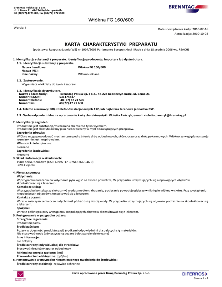Brenntag Polska Sp. z o.o. ul. J. Bema 21, 47-224 Kędzierzyn-Koźle tel (48/77) 4721500, fax (48/77) 4721600 Włókna FG 160/600 Wersja: I Data sporządzenia karty: 2010-02-16 Aktualizacja: 2010-10-08 KARTA CHARAKTERYSTYKI PREPARATU (podstawa: Rozporządzenie(WE) nr 1907/2006 Parlamentu Europejskiegi i Rady z dnia 18 grudnia 2006 ws. REACH) 1. Identyfikacja substancji / preparatu. Identyfikacja producenta, importera lub dystrybutora. 1.1. Identyfikacja substancji / preparatu. Nazwa handlowa: Włókna FG 160/600 Nazwa INCI: Inne nazwy: Włókno szklane 1.2. Zastosowanie. Wypełniacz włóknisty do żywic i zapraw 1.3. Identyfikacja dystrybutora. Nazwa i adres firmy: Brenntag Polska Sp. z o.o., 47-224 Kedzierzyn-Koźle, ul. Bema 21 Numer REGON: 531174447 Numer telefonu: 48 (77) 47 21 500 Numer faxu: 48 (77) 47 21 600 1.4. Telefon alarmowy: 988, z telefonów stacjonarnych 112, lub najbliższa terenowa jednostka PSP. 1.5. Osoba odpowiedzialna za opracowanie karty charakterystyki: Violetta Pańczyk, e-mail: [email protected] 2. Identyfikacja zagrożeń: Produkt nie jest substancją/mieszanina chemiczna tylko wyróbem. Produkt nie jest sklasyfikowany jako niebezpieczny w myśl obowiązujących przepisów. Zagrożenia zdrowia: Włókna mogą powodować mechaniczne podrażnienie dróg oddechowych, skóry, oczu oraz dróg pokarmowych. Włókno ze względu na swoje rozmiary nie jest respirowalne. Własności niebezpieczne: nieznane Zagrożenie środowiska: nieznane 3. Skład i informacja o składnikach: >98% Szkło, tlenkowe (CAS: 65997-17-3; WE: 266-046-0) <2% klejonki 4. Pierwsza pomoc: Wdychanie: W przypadku narażenia na wdychanie pyłu wyjść na świeże powietrze, W przypadku utrzymujących się niepokojących objawów skontaktować się z lekarzem. Kontakt ze skórą: W przypadku kontaktu ze skórą zmyć wodą z mydłem, drapanie, pocieranie powoduje głębsze wniknięcie włókna w skórę. Przy wystąpieniu niepokojących objawów skonsultować się z lekarzem. Kontakt z oczami: W razie znieczyszczenia oczu natychmiast płukać dużą ilością wody. W przypadku utrzymujących się objawów podrażnienia skontaktować się z lekarzem. Spożycie: W razie połknięcia przy wystąpieniu niepokojących objawów skonsultować się z lekarzem. 5. Postępowanie w przypadku pożaru: Szczególne zagrożenia: Produkt niepalny. Środki gaśnicze: Pożary w obecności produktu gasić środkami odpowiednimi dla palących się materiałów. Nie stosować wody (gdy przyczyną pozaru było zwarcie elektryczne) Inne informacje: nie dotyczy Środki ochrony indywidualnej dla strażaków: Stosować niezależny aparat oddechowy Minimalna energia zapłonu: [mJ] Przewodnictwo elektryczne: [ pS/m] 6. Postępowanie w przypadku niezamierzonego uwolnienia do środowiska: Środki ochrony osobistej: -rękawice ochronne Karta opracowana przez firmę Brenntag Polska Sp. z o.o. Strona 1 z 4 Brenntag Polska Sp. z o.o. ul. J. Bema 21, 47-224 Kędzierzyn-Koźle tel (48/77) 4721500, fax (48/77) 4721600 Włókna FG 160/600 -okulary ochronne Postępowanie przy wycieku lub wysypie substancji: Rozsypany produkt zebrać do pojemnika, przekazać do likwidacji. 7. Postępowanie z substancją / preparatem i magazynowanie: Magazynowanie: Przechowywać w pomieszczeniu o dobrej wentylacji. Postępowanie z substancją lub preparatem: Zapewnić odpowiednią wentylację pomieszczeń. Unikać wzniecania pyłu włókien. 8. Kontrola narażenia i środki ochrony indywidualnej: Stosowane środki ochrony osobistej powinny spełniać wymogi Rozporządzenia Ministra Gospodarki z dnia 21 grudnia 2005 r. w sprawie zasadniczych wymagań dla środków ochrony indywidualnej (Dz.U. Nr 259, poz. 2173). Ochrona dróg oddechowych: stosować w razie narażenia na wdychanie Ochrona oczu: okulary ochronne Ochrona rąk: rękawice ochronne Techniczne środki ochronne: wentyalcja pomieszczeń Inne wyposażenie ochronne: odzież robocza Kontrola zagrożenia: Włókno szklane: OSHA OEL- 5 mg/m3 pyły wychane; 15 mg/m3 pył całkowity (8h) NDS, NDSCh- nie ustalono (wg Rozporzadzenia MPiPS z dn. 29 listopada 2002 ; Dz.U. Nr 217, poz. 1833 z późniejszymi zmianami) Zalecenia dotyczące procedury monitoringu zawartości składników niebezpiecznych w powietrzu – metodyka pomiarów: -Rozporządzenie Ministra Zdrowia z dnia 20 kwietnia 2005 r. w sprawie badań i pomiarów czynników szkodliwych dla zdrowia w środowisku pracy (Dz.U. Nr 73, poz.645) -PN-89/Z-01001/06. Ochrona czystości powietrza. Nazwy, określenia i jednostki. Terminologia dotycząca badań jakości powietrza na stanowiskach pracy. -PN Z-04008-7:2002. Ochrona czystości powietrza. Pobieranie próbek. Zasady pobierania próbek powietrza w środowisku pracy i interpretacja wyników. -PN-EN-689: 2002. Powietrze na stanowiskach pracy – wytyczne oceny narażenia inhalacyjnego na czynniki chemiczne przez porównanie z wartościami dopuszczalnymi i strategia pomiarowa. Uwaga: Gdy stężenie substancji jest ustalone i znane, doboru środków ochrony indywidualnej należy dokonywać z uwzględnieniem stężenia substancji występującego na danym stanowisku pracy, czasu ekspozycji oraz czynności wykonywanych przez pracownika. W sytuacji awaryjnej, jeżeli stężenie substancji na stanowisku pracy nie jest znane, stosować środki ochrony indywidualnej o najwyższej zalecanej klasie ochrony. Pracodawca jest obowiązany zapewnić, aby stosowane środki ochrony indywidualnej oraz odzież i obuwie robocze posiadały właściwości ochronne i użytkowe oraz zapewnić odpowiednie ich pranie, konserwacje, naprawę i odkażanie. Zalecane badania wstępne i okresowe pracowników należy przeprowadzać zgodnie z Rozporządzeniem Ministra Zdrowia i Opieki Społecznej z dnia 30 maja 1996 r. w sprawie przeprowadzania badań lekarskich pracowników, zakresu profilaktycznej opieki zdrowotnej nad pracownikami oraz orzeczeń lekarskich wydanych do celów przewidzianych w Kodeksie Pracy (Dz.U. Nr 69/1996r. poz. 332, 