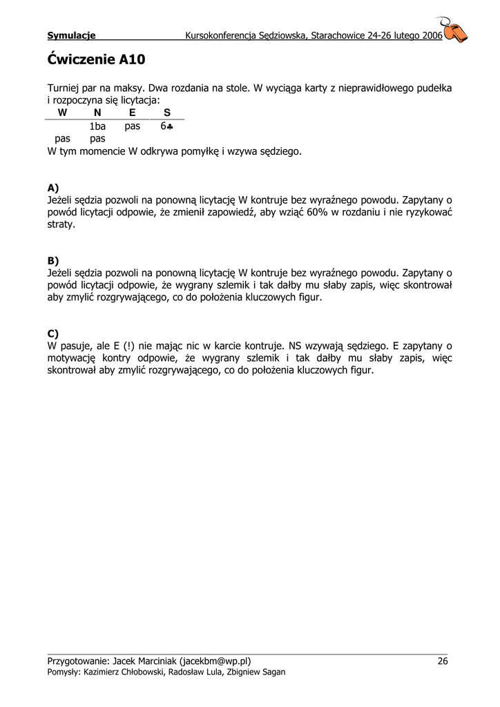 Symulacje Kursokonferencja Sędziowska, Starachowice 24-26 lutego 2006 Ćwiczenie A10 Turniej par na maksy. Dwa rozdania na stole. W wyciąga karty z nieprawidłowego pudełka i rozpoczyna się licytacja: W N E S pas 6♣ 1ba pas pas W tym momencie W odkrywa pomyłkę i wzywa sędziego. A) Jeżeli sędzia pozwoli na ponowną licytację W kontruje bez wyraźnego powodu. Zapytany o powód licytacji odpowie, że zmienił zapowiedź, aby wziąć 60% w rozdaniu i nie ryzykować straty. B) Jeżeli sędzia pozwoli na ponowną licytację W kontruje bez wyraźnego powodu. Zapytany o powód licytacji odpowie, że wygrany szlemik i tak dałby mu słaby zapis, więc skontrował aby zmylić rozgrywającego, co do położenia kluczowych figur. C) W pasuje, ale E (!) nie mając nic w karcie kontruje. NS wzywają sędziego. E zapytany o motywację kontry odpowie, że wygrany szlemik i tak dałby mu słaby zapis, więc skontrował aby zmylić rozgrywającego, co do położenia kluczowych figur. Przygotowanie: Jacek Marciniak ([email protected]) Pomysły: Kazimierz Chłobowski, Radosław Lula, Zbigniew Sagan 26 Kursokonferencja Sędziowska, Starachowice 24-26 lutego 2006 Symulacje Ćwiczenie A11 Rozd E Obie po ♠ K6 ♥ W94 ♦ A7652 ♣ K43 ♠ 10987532 ♥ 63 ♦ W109 ♣9 N W E S ♠A ♥ K1052 ♦ 43 ♣ W108652 ♠ DW4 ♥ AD87 ♦ KD8 ♣ AD7 S otworzył licytację odzywką 2BA i rozgrywa 4♠. Pierwsze dwie lewy zostały zakryte. W N E S ♦A ♦9 ♦4 ♦K I II ♦2 ♦10 ♦3 ♦D A) S wychodzi ♠W w trzeciej lewie i E zagrywa ♠A poza kolejnością. S wzywa sędziego. B) S wychodzi ♠W w trzeciej lewie, a dziadek wysuwa ♠2 z własnej inicjatywy. Następnie E dodaje ♠A, zanim W zdążył zagrać kartę w lewie. S wzywa sędziego. C) S wychodzi ♠W w trzeciej lewie mówiąc „ze stołu pik”. Dziadek czeka na zagranie karty przez W, który przez chwilę się waha. Zanim W zdążył dołożyć, E kładzie na stole ♠A. S wzywa sędziego. Przygotowanie: Jacek Marciniak ([email protected]) Pomysły: Kazimierz Chłobowski, Radosław Lula, Zbigniew Sagan 27 Kursokonferencja Sędziowska, Starachowice 24-26 lutego 2006 Symulacje Ćwiczenie A12 ♠ W10654 ♥ 76 ♦ A765 ♣ 32 ♠A ♥ KD2 ♦ W1098432 ♣ 65 N W E S ♠ 32 ♥ W9843 ♦K ♣ W10987 ♠ KD987 ♥ A105 ♦D ♣ AKD4 S rozgrywa 6♠ po wiście w ♥K. A) S bierze lewę. W zakrywa swoją kartę, ale ♥6, ♥9 i ♥A leżą na stole. Po pewnym czasie W kładzie na stole ♥2 (wydaje mu się, że jeszcze nie zagrał do lewy) i wszyscy zakrywają swoje karty. Gra toczy się dalej: ♣AKD, W wyrzuca karo a ze stołu kier. Teraz oddany pik i odwrót w ♥D, przebity. Ściągnięcie atu (W ponownie karo), przebitka kiera w stole (W znowu wyrzuca karo) i ♦A – wszyscy dokładają. Teraz W spostrzega, że ma mniej kart niż jest w dziadku. Sędzia! B) S bierze lewę i gra ♣AK, do którego wszyscy dokładają, jednak W nie zakrywa ostatniej karty (zapewne zastanawia się co zagrać do następnego trefla). W tym czasie S zagrywa ♣D i widząc na stole trefla u W dysponuje ze stołu kiera, a E dokłada trefla. Następuje zagranie w pika i W bierze lewę na asa. Teraz spostrzega, że ma więcej kart niż jest w dziadku. Sędzia! C) S bierze lewę i gra ♣AKD, W wyrzuca karo a ze stołu kier. Wszyscy zakrywają lewę z wyjątkiem W, przed którym leży blotka karo. Rozgrywający gra małego pika i widząc karo u W dysponuje ze stołu waleta, a E dokłada do koloru. Następuje zagranie ze stołu kolejnego pika, E dokłada do koloru i w tym momencie W przerywa grę oświadczając, że jeszcze nie dołożył do poprzedniej lewy. Sędzia! Przygotowanie: Jacek Marciniak ([email protected]) Pomysły: Kazimierz Chłobowski, Radosław Lula, Zbigniew Sagan 28