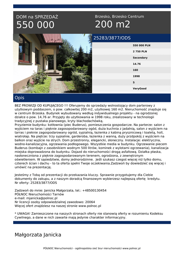 DOM na SPRZEDAŻ 550 000 Brzesko, Brzesko Centrum 200 m2 25283/3877/ODS 550 000 PLN 2 750 PLN Secondary 14.76 160 1998 5 VeryGood Opis BEZ PROWIZJI OD KUPUJĄCEGO !!! Oferujemy do sprzedaży wolnostojący dom parterowy z użytkowym poddaszem, o pow. całkowitej 200 m2, użytkowej 160 m2. Nieruchomość znajduje się w centrum Brzeska. Budynek wybudowany według indywidualnego projektu - na ogrodzonej działce o pow. 14,76 ar. Przyjęty do użytkowania w 1998 roku, zrealizowany w technologii tradycyjnej z pustaka pianowego, kryty blachodachówką. Przyziemie budynku: kotłownia (piec Buderus), pomieszczenia gospodarcze. Na parterze: salon z wyjściem na taras i pięknie zagosopodarowany ogód, duża kuchnia z jadalnią, salon z wyjściem na tarras i pieknie zagospodarowany ogród, sypialnią, łazienka z kabiną prysznicową i toaletą, holl, wiatrołap. Na piętrze: trzy sypialnie, garderoba, łazienka z wanną, duży przdpokój z wyjściem na balkon oraz wyjście na strych. Dom przestronny, elegancki, słoneczny. Instalacje: elektryczna, wodno-kanalizacyjna, ogrzewania podłogowego. Wszystkie media w budynku. Ogrzewanie piecem Buderus (kombajn z zasobnikiem wodnym 500 litrów, kominek z wylotami ogrzewania), kanalizacja miejska doprowadzona do budynku. Dojazd do nieruchomości drogą asfaltową. Działka płaska, nasłoneczniona z pięknie zagospodarowanym terenem, ogrodzona, z zewnętrznym oświetleniem. W sąsiedztwie, domy jednorodzinne. Jeśli szukasz czegoś więcej niż tylko domu, czterech ścian i dachu - to ta oferta spełni Twoje oczekiwania.Zadzwoń by dowiedzieć się więcej i umówić na prezentację. Jesteśmy z Tobą od prezentacji do przekazania kluczy. Sprawnie przygotujemy dla Ciebie dokumenty do zakupu, a z naszym doradcą finansowym wybierzesz najlepszą ofertę kredytu. Nr oferty: 25283/3877/ODS Zadzwoń do mnie: Janicka Małgorzata, tel.: +48500130454 PÓŁNOC Nieruchomości Tarnów e-mail: [email protected] Nr licencji osoby odpowiedzialnej zawodowo: 20064 Więcej ofert znajdziesz na naszej stronie www.polnoc.pl * UWAGA! Zamieszczone na naszych stronach oferty nie stanowią oferty w rozumieniu Kodeksu Cywilnego, a dane w nich zawarte mają jedynie charakter informacyjny. Małgorzata Janicka PÓŁNOC Nieruchomości - ogólnopolska sieć biur nieruchomości www.polnoc.pl tel. 500-130-454 email: [email protected] PÓŁNOC Nieruchomości - ogólnopolska sieć biur nieruchomości www.polnoc.pl Powered by TCPDF (www.tcpdf.org)