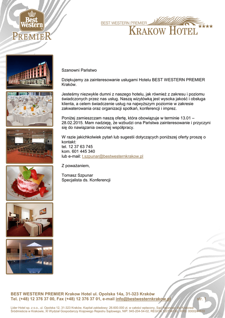 Szanowni Państwo Dziękujemy za zainteresowanie usługami Hotelu BEST WESTERN PREMIER Kraków. Jesteśmy niezwykle dumni z naszego hotelu, jak również z zakresu i poziomu świadczonych przez nas usług. Naszą wizytówką jest wysoka jakość i obsługa klienta, a celem świadczenie usług na najwyższym poziomie w zakresie zakwaterowania oraz organizacji spotkań, konferencji i imprez. Poniżej zamieszczam naszą ofertę, która obowiązuje w terminie 13.01 – 28.02.2015. Mam nadzieję, że wzbudzi ona Państwa zainteresowanie i przyczyni się do nawiązania owocnej współpracy. W razie jakichkolwiek pytań lub sugestii dotyczących poniższej oferty proszę o kontakt: tel. 12 37 63 745 kom. 601 445 340 lub e-mail: [email protected] Z poważaniem, Tomasz Szpunar Specjalista ds. Konferencji BEST WESTERN PREMIER Krakow Hotel ul. Opolska 14a, 31-323 Kraków Tel. (+48) 12 376 37 00, Fax (+48) 12 376 37 01, e-mail [email protected] str. 1 Lider Hotel sp. z o.o., ul. Opolska 12, 31-323 Kraków, Kapitał zakładowy: 26.600.000 zł, w całości wpłacony, Sąd Rejonowy dla KrakowaŚródmieścia w Krakowie, XI Wydział Gospodarczy Krajowego Rejestru Sądowego, NIP: 945-204-54-02, REGON 120134130, KRS: 0000244810 Data Sala 13.01-28.02.2015 Wykaz sal oraz ich cennik w załączeniu Pow. w m2 Cena Od 52 50% rabatu od ceny z załącznika W cenę sali wliczone jest wyposażenie techniczne: • ekran, projektor multimedialny • flipchart • bezprzewodowy Internet • nagłośnienie . USŁUGA GASTRONOMICZNA Data Usługa Cena za osobę 13.01-28.02.2015 Rabat dla Państwa Przerwa kawowa - jednorazowa Od 15 zł/os. 10% od ceny standardowej Przerwa kawowa - całodniowa Od 24 zł/os. 10% od ceny standardowej Lunch w formie serwowanej Od 50 zł/os. 5% od ceny standardowej Lunch w formie bufetu Od 60 zł/os. 5% od ceny standardowej Szczegółowe propozycje menu znajdą Państwo w załączeniu. USŁUGA NOCLEGOWA Data Cena specjalna pokój 1-os Cena specjalna pokój 2-os 13.01-28.02.2015 180 zł/doba 220 zł/doba W cenę pokoju wliczone jest śniadanie w formie bufetu oraz wstęp na basen oraz saunę. Parking: GRATIS Wszystkie podane powyżej ceny są cenami brutto. Z poważaniem Tomasz Szpunar Specjalista ds. Konferencji BEST WESTERN PREMIER Krakow Hotel ul. Opolska 14a, 31-323 Kraków Tel. (+48) 12 376 37 00, Fax (+48) 12 376 37 01, e-mail [email protected] str. 2 Lider Hotel sp. z o.o., ul. Opolska 12, 31-323 Kraków, Kapitał zakładowy: 26.600.000 zł, w całości wpłacony, Sąd Rejonowy dla KrakowaŚródmieścia w Krakowie, XI Wydział Gospodarczy Krajowego Rejestru Sądowego, NIP: 945-204-54-02, REGON 120134130, KRS: 0000244810