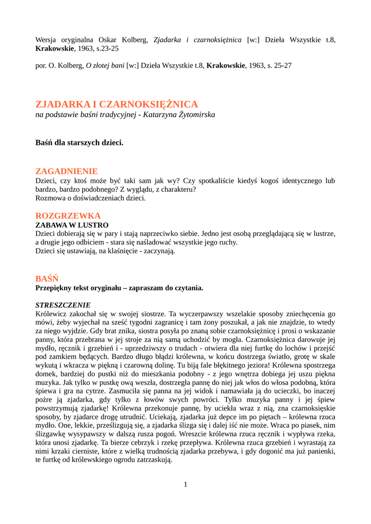 Wersja oryginalna Oskar Kolberg, Zjadarka i czarnoksiężnica [w:] Dzieła Wszystkie t.8, Krakowskie, 1963, s.23-25 por. O. Kolberg, O złotej bani [w:] Dzieła Wszystkie t.8, Krakowskie, 1963, s. 25-27 ZJADARKA I CZARNOKSIĘŻNICA na podstawie baśni tradycyjnej - Katarzyna Żytomirska Baśń dla starszych dzieci. ZAGADNIENIE Dzieci, czy ktoś może być taki sam jak wy? Czy spotkaliście kiedyś kogoś identycznego lub bardzo, bardzo podobnego? Z wyglądu, z charakteru? Rozmowa o doświadczeniach dzieci. ROZGRZEWKA ZABAWA W LUSTRO Dzieci dobierają się w pary i stają naprzeciwko siebie. Jedno jest osobą przeglądającą się w lustrze, a drugie jego odbiciem - stara się naśladować wszystkie jego ruchy. Dzieci się ustawiają, na klaśnięcie - zaczynają. BAŚŃ Przepiękny tekst oryginału – zapraszam do czytania. STRESZCZENIE Królewicz zakochał się w swojej siostrze. Ta wyczerpawszy wszelakie sposoby zniechęcenia go mówi, żeby wyjechał na sześć tygodni zagranicę i tam żony poszukał, a jak nie znajdzie, to wtedy za niego wyjdzie. Gdy brat znika, siostra posyła po znaną sobie czarnoksiężnicę i prosi o wskazanie panny, która przebrana w jej stroje za nią samą uchodzić by mogła. Czarnoksiężnica darowuje jej mydło, ręcznik i grzebień i - uprzedziwszy o trudach - otwiera dla niej furtkę do lochów i przejść pod zamkiem będących. Bardzo długo błądzi królewna, w końcu dostrzega światło, grotę w skale wykutą i wkracza w piękną i czarowną dolinę. Tu biją fale błękitnego jeziora! Królewna spostrzega domek, bardziej do pustki niż do mieszkania podobny - z jego wnętrza dobiega jej uszu piękna muzyka. Jak tylko w pustkę ową weszła, dostrzegła pannę do niej jak włos do włosa podobną, która śpiewa i gra na cytrze. Zasmuciła się panna na jej widok i namawiała ją do ucieczki, bo inaczej pożre ją zjadarka, gdy tylko z łowów swych powróci. Tylko muzyka panny i jej śpiew powstrzymują zjadarkę! Królewna przekonuje pannę, by uciekła wraz z nią, zna czarnoksięskie sposoby, by zjadarce drogę utrudnić. Uciekają, zjadarka już depce im po piętach – królewna rzuca mydło. One, lekkie, prześlizgują się, a zjadarka ślizga się i dalej iść nie może. Wraca po piasek, nim ślizgawkę wysypawszy w dalszą rusza pogoń. Wreszcie królewna rzuca ręcznik i wypływa rzeka, która unosi zjadarkę. Ta bierze cebrzyk i rzekę przepływa. Królewna rzuca grzebień i wyrastają za nimi krzaki cierniste, które z wielką trudnością zjadarka przebywa, i gdy dogonić ma już panienki, te furtkę od królewskiego ogrodu zatrzaskują. 1 Nazajutrz wraca brat i nie może jednakowo przebranych dziewcząt odróżnić. Pisze po pomoc do znanej nam czarnoksiężnicy. Ta doradza mu wypełnić pęcherz krwią i przebić się na oczach dziewcząt, a wiedząc, że siostra za szyję pochwyci, pisze mu, żeby tej, co za rękę go złapie, nie wypuszczał już. Wszytko kończy się dobrze, brat zakochuje się we właściwej pannie i żeni się z nią. Jego małżonka, do końca życia była bardzo pobożną osobą. Wierzyła, że Pan Bóg specjalnie męża miłością do siostry natchnął, by uwolnić ją od zjadarki. TEMATYKA ĆWICZEŃ - JA i SOBOWTÓR PISANIE LISTU DO SOBOWTÓRA Każdy dostaje kartkę i długopis, i może napisać list do kogoś takiego samego jak on. Warto powiedzieć dzieciom, że nie będą musiały czytać na głos swoich listów. Tylko Ci, którzy będą chcieli, podzielą się w kręgu z innymi dziećmi swoimi zapisanymi przemyśleniami. ROBIENIE KOLAŻY MARZEŃ Robimy kolaże - wyklejanki/rysowanki ze swoimi postaciami i przedmiotami, które lubimy, z tym, co dobrze robimy lub chcielibyśmy umieć robić, z miejscami, które chcielibyśmy zobaczyć, odwiedzić - czyli generalnie temat MARZENIA. Przynosimy dużo gazet, czasopism - dzieci wycinają i wyklejają fragmenty zdjęć na kartkach, jeśli czegoś nie mogą znaleźć – mogą to dorysować. ZADANIE DO DOMU Jak wyglądałoby Twoje życie, gdybyś się urodził 50 lat wcześniej i 100 lat później? TO MOŻE BYĆ TEMATEM KOLEJNYCH ZAJĘĆ. 50 lat wcześniej – pytamy dziadków, szperamy w książkach – co bym jadł na śniadanie, jakbym się ubierał itp. 100 lat później – rozmowa o naszych wyobrażeniach. RZEŹBY Dzieci dobierają się w kilkuosobowe grupy i mają przedstawić jakąś scenę z życia w przyszłości. Gdy już wszystkie grupy są gotowe - jedna pokazuje swoją rzeźbę, a reszta dzieci ogląda i próbuje zgadnąć, co rzeźba przedstawia. 2