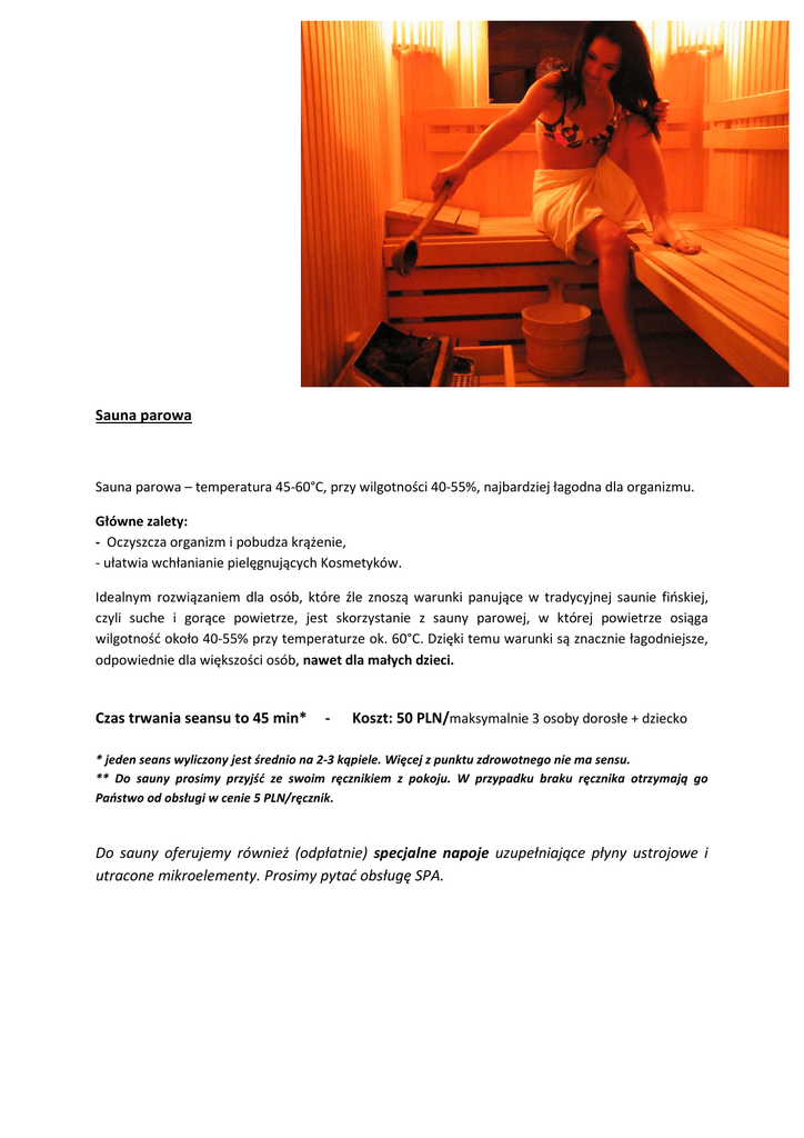 Sauna parowa Sauna parowa – temperatura 45-60°C, przy wilgotności 40-55%, najbardziej łagodna dla organizmu. Główne zalety: - Oczyszcza organizm i pobudza krążenie, - ułatwia wchłanianie pielęgnujących Kosmetyków. Idealnym rozwiązaniem dla osób, które źle znoszą warunki panujące w tradycyjnej saunie fińskiej, czyli suche i gorące powietrze, jest skorzystanie z sauny parowej, w której powietrze osiąga wilgotność około 40-55% przy temperaturze ok. 60°C. Dzięki temu warunki są znacznie łagodniejsze, odpowiednie dla większości osób, nawet dla małych dzieci. Czas trwania seansu to 45 min* - Koszt: 50 PLN/maksymalnie 3 osoby dorosłe + dziecko * jeden seans wyliczony jest średnio na 2-3 kąpiele. Więcej z punktu zdrowotnego nie ma sensu. ** Do sauny prosimy przyjść ze swoim ręcznikiem z pokoju. W przypadku braku ręcznika otrzymają go Państwo od obsługi w cenie 5 PLN/ręcznik. Do sauny oferujemy również (odpłatnie) specjalne napoje uzupełniające płyny ustrojowe i utracone mikroelementy. Prosimy pytać obsługę SPA.