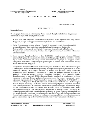 CONSEIL DE LA COMMUNAUTÉ POLONAISE DE BELGIQUE asbl RAAD VAN DE POOLSE GEMEENSCHAP VAN BELGIË vzw RADA POLONII BELGIJSKIEJ Genk, styczeń 2009 r. KOMUNIKAT N° 32 Drodzy Państwo, W niniejszym Komunikacie informujemy Was o pracach Zarządu Rady Polonii Belgijskiej w okresie od 10 maja 2008 do 31 grudnia 2008 r. 1. W dniu 10.05.2008 odbyło się Sprawozdawczo-Wyborcze Walne Zgromadzenie Rady Polonii Belgijskiej, o czym szerzej poinformowaliśmy Państwa w Komunikacie 31. 2. Walne Zgromadzanie wybrało też nowy Zarząd. W jego skład weszli: Joseph Ptaszyński (prezes). Krzysztof Bystram (wiceprezes), Isabelle du Bois d'Aische Światopełk Czetwertyńska (wiceprezes), Jan Bielecki (wiceprezes skarbnik), Alicja BiałkowskaPtaszyńska (wiceprezes sekretarz), Krystyna Balawajder (sekretarz), Jolanta Ruts – Ratajczak (członek zarządu). 3. Nowo wybrany Zarząd spotkał się w dniu 26.05.2008 r na pierwszym zebraniu. Głównym tematem było przygotowanie projektu zmian restrukturyzacyjnych, które umożliwią starania się o środki finansowe ze strony władz flamandzkich. Wymaga to podjęcia szeroko zakrojonych kontaktów z organizacjami polonijnymi w terenie oraz opracowania nowego statutu Rady Polonii Belgijskiej. 4. Na spotkaniu Zarządu RPB została zreferowana przez Isabelle du Bois d'Aische Światopełk Czetwertyńską działalność Komisji Społecznej, która przede wszystkim jest aktywna w dwóch obszarach: pomocy bezdomnym Polakom w Belgii oraz podjęcia nowej inicjatywy, wspomaganej przez Konsulat i Ambasadę RP, jakim jest otwarcie Poradni Rodzinnej w Brukseli. Pierwszym etapem projektu „Poradnia Rodzinna” było otwarcie Punktu Konsultacyjnego 16 września 2008 r. Personel Punktu składa się z koordynatora projektu, pedagoga, psychologa, lekarza pediatry, logopedy, osoby dla pomocy społecznej i osoby zajmującej się sekretariatem. Placówka działa w każdy wtorek od godziny 18.00 do 20.00 pod adresem : ul. d’Angleterre 43-45, 1060 Bruksela (Siedziba Zespołu Szkół im. J. Lelewela przy Polskiej Misji Katolickiej). Działalność Punktu skierowana jest przede wszystkim do rodzin, które z wielu powodów, a w większości zarobkowych, podjęły decyzję o wyjeździe do Belgii, lecz nie radzą sobie w nowym środowisku. Brak kontaktu z bliskimi, bariera językowa, strach przed nieznanym jutrem, powodują problemy adaptacyjne, a w konsekwencji i zdrowotne. Ich ofiarami są najczęściej matki z dziećmi zdane wyłącznie na siebie. Celem przedsięwzięcia jest nawiązanie kontaktu z osobami potrzebującymi wsparcia i ofiarowanie im bezpłatnej pomocy. Szczególną troską otaczane są dzieci w wieku przedszkolnym, które z powodu nieznajomości języka nie asymilują się, są źle kwalifikowane i źle kierowane w dziedzinie szkolnictwa. ________________________________________________________________________ Rue Baron de Castro 46 De Heuvel 16A B-1040 BRUXELLES FORTIS 001-1421535-76 3600 GENK CONSEIL DE LA COMMUNAUTÉ POLONAISE DE BELGIQUE asbl RAAD VAN DE POOLSE GEMEENSCHAP VAN BELGIË vzw RADA POLONII BELGIJSKIEJ 5. Członkowie Zarządu wzięli udział w spotkaniu zorganizowanym przez Konsulat RP między organizacjami polonijnymi i dziennikarzami mediów polonijnych w dniu 30 maja 2008 r. 6. Isabelle du Bois d'Aische Światopełk Czetwertyńska reprezentowała Zarząd RPB na „II Sesji nt. Roli Polonii w uzyskiwaniu pomocy przez naród polski od społeczności narodowej w latach 1981-1989” w Zielonej Górze, gdzie przedstawiła referat oparty na własnych doświadczeniach i posiadanych materiałach wraz ze zdjęciami z tamtego czasu. 7. W 2009 roku przypada 15 rocznica istnienia RPB. Z tej okazji zostanie zorganizowana impreza w pierwszej połowie 2009 roku. 8. Przedstawiciele Zarządu wezmą udział w pracach komitetu organizacyjnego „Polak Roku 2008”. RPB przypadło wskazanie kandydatów w kategorii działalność społeczna i przedsiębiorczość w biznesie. 9. Zarząd utrzymuje robocze kontakty z Ambasadą oraz Konsulatem Generalnym RP. Ambasador RP przy Królestwie Belgii Sławomir Czarlewski zaprosił nowy Zarząd RPB na spotkanie w Ambasadzie w dniu 9.06.2008 r. Na spotkaniu wymieniliśmy poglądy na tematy związane z rolą Polonii oraz współpracy między Ambasadą, Konsulatem, Polonią i RPB. 10. Członkowie Zarządu zostali zaproszeni przez Ambasadora tytularnego, kierownika Konsulatu Generalnego RP w Brukseli pana Piotra Wojtczaka na spotkanie w dniu 3 listopada 2008 r. 11. Na zaproszenie Ambasady RP członkowie Zarządu uczestniczyli w imprezach i spotkaniach zorganizowanych z okazji 90 rocznicy odzyskania niepodległości RP. 12. Jak co roku, przedstawiciele Zarządu byli obecni na uroczystościach w Maldegem i w Lommel. 13. Prezes RPB J. Ptaszyński wziął udział w Zjeździe EUWP w Berlinie 28 listopada 2008 r. Tradycyjnie, w okresie świąt Bożego Narodzenia uczestniczyliśmy w spotkaniach organizowanych przez Ambasadę i Konsulat RP i organizacje polonijne. Prosimy też zaglądać na stronę internetową: www.polonia.be. Łączymy serdeczne pozdrowienia, Zarząd RPB ________________________________________________________________________ Rue Baron de Castro 46 De Heuvel 16A B-1040 BRUXELLES FORTIS 001-1421535-76 3600 GENK