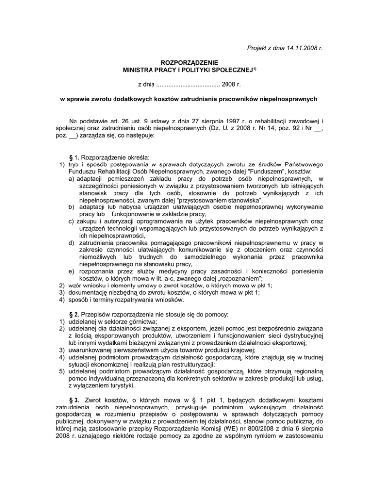 Projekt z dnia 14.11.2008 r. ROZPORZĄDZENIE MINISTRA PRACY I POLITYKI SPOŁECZNEJ1) z dnia ..................................... 2008 r. w sprawie zwrotu dodatkowych kosztów zatrudniania pracowników niepełnosprawnych Na podstawie art. 26 ust. 9 ustawy z dnia 27 sierpnia 1997 r. o rehabilitacji zawodowej i społecznej oraz zatrudnianiu osób niepełnosprawnych (Dz. U. z 2008 r. Nr 14, poz. 92 i Nr __, poz. __) zarządza się, co następuje: § 1. Rozporządzenie określa: 1) tryb i sposób postępowania w sprawach dotyczących zwrotu ze środków Państwowego Funduszu Rehabilitacji Osób Niepełnosprawnych, zwanego dalej "Funduszem", kosztów: a) adaptacji pomieszczeń zakładu pracy do potrzeb osób niepełnosprawnych, w szczególności poniesionych w związku z przystosowaniem tworzonych lub istniejących stanowisk pracy dla tych osób, stosownie do potrzeb wynikających z ich niepełnosprawności, zwanym dalej "przystosowaniem stanowiska”, b) adaptacji lub nabycia urządzeń ułatwiających osobie niepełnosprawnej wykonywanie pracy lub funkcjonowanie w zakładzie pracy, c) zakupu i autoryzacji oprogramowania na użytek pracowników niepełnosprawnych oraz urządzeń technologii wspomagających lub przystosowanych do potrzeb wynikających z ich niepełnosprawności, d) zatrudnienia pracownika pomagającego pracownikowi niepełnosprawnemu w pracy w zakresie czynności ułatwiających komunikowanie się z otoczeniem oraz czynności niemożliwych lub trudnych do samodzielnego wykonania przez pracownika niepełnosprawnego na stanowisku pracy, e) rozpoznania przez służby medycyny pracy zasadności i konieczności poniesienia kosztów, o których mowa w lit. a-c, zwanego dalej „rozpoznaniem”; 2) wzór wniosku i elementy umowy o zwrot kosztów, o których mowa w pkt 1; 3) dokumentację niezbędną do zwrotu kosztów, o których mowa w pkt 1; 4) sposób i terminy rozpatrywania wniosków. § 2. Przepisów rozporządzenia nie stosuje się do pomocy: 1) udzielanej w sektorze górnictwa; 2) udzielanej dla działalności związanej z eksportem, jeżeli pomoc jest bezpośrednio związana z ilością eksportowanych produktów, utworzeniem i funkcjonowaniem sieci dystrybucyjnej lub innymi wydatkami bieżącymi związanymi z prowadzeniem działalności eksportowej; 3) uwarunkowanej pierwszeństwem użycia towarów produkcji krajowej; 4) udzielanej podmiotom prowadzącym działalność gospodarczą, które znajdują się w trudnej sytuacji ekonomicznej i realizują plan restrukturyzacji; 5) udzielanej podmiotom prowadzącym działalność gospodarczą, które otrzymują regionalną pomoc indywidualną przeznaczoną dla konkretnych sektorów w zakresie produkcji lub usług, z wyłączeniem turystyki. § 3. Zwrot kosztów, o których mowa w § 1 pkt 1, będących dodatkowymi kosztami zatrudnienia osób niepełnosprawnych, przysługuje podmiotom wykonującym działalność gospodarczą w rozumieniu przepisów o postępowaniu w sprawach dotyczących pomocy publicznej, dokonywany w związku z prowadzeniem tej działalności, stanowi pomoc publiczną, do której mają zastosowanie przepisy Rozporządzenia Komisji (WE) nr 800/2008 z dnia 6 sierpnia 2008 r. uznającego niektóre rodzaje pomocy za zgodne ze wspólnym rynkiem w zastosowaniu art. 87 i 88 Traktatu (ogólne rozporządzenie w sprawie wyłączeń blokowych) (Dz.U. UE L 214 z 09.08. 2008r., str. 3). § 4. 1. Pracodawca, o którym mowa w art. 26 ust. 1 lub art. 26d ustawy z dnia 27 sierpnia 1997 r. o rehabilitacji zawodowej i społecznej oraz zatrudnianiu osób niepełnosprawnych, zwanej dalej "ustawą", ubiegający się o zwrot kosztów, o których mowa w § 1 pkt 1, składa wniosek do starosty (prezydenta miasta na prawach powiatu) właściwego ze względu na miejsce zatrudnienia osób niepełnosprawnych. 2. Pracodawca będący starostą (prezydentem miasta na prawach powiatu) składa wniosek do Prezesa Zarządu Funduszu za pośrednictwem oddziału Funduszu, właściwego ze względu na siedzibę tego pracodawcy. 3. Wzór wniosku pracodawcy o którym mowa w ust. 1 i 2 o zwrot ze środków Funduszu kosztów, o których mowa w § 1 pkt 1, określa załącznik do rozporządzenia. 4. Do wniosku pracodawca i starosta (prezydent miasta na prawach powiatu), zwani dalej „wnioskodawcami", dołączają odpowiednio: 1) kopię dokumentu poświadczającego formę prawną prowadzonej działalności: a) zaświadczenia o wpisie do ewidencji działalności gospodarczej, b) wyciąg z rejestru przedsiębiorców Krajowego Rejestru Sądowego, c) umowę spółki cywilnej potwierdzoną w urzędzie skarbowym, d) w szczególnych przypadkach koncesje lub pozwolenie na prowadzenie działalności, jeżeli działalność ta, zgodnie z odrębnymi przepisami, takiej koncesji lub pozwolenia wymaga; 2) kopię dokumentu określającego tytuł prawny do nieruchomości, budynku, lokalu lub pomieszczenia, w którym mają zostać przystosowane stanowiska pracy albo adaptowane pomieszczenia; 3) zaświadczenie z Zakładu Ubezpieczeń Społecznych o niezaleganiu w opłacaniu należności z tytułu składek na ubezpieczenia społeczne, ubezpieczenie zdrowotne, Fundusz Pracy oraz Fundusz Gwarantowanych Świadczeń Pracowniczych; 4) dokumenty z urzędu skarbowego: a) dla osób opłacających zryczałtowany podatek - informacje o jego wysokości, za okres dwóch ubiegłych lat, a w przypadku pracodawcy działającego krócej niż 2 lata - za okres co najmniej 12 miesięcy, b) decyzję o zwolnieniu płatnika z obowiązku pobrania podatku wydaną na podstawie art. 22 § 2 ustawy z dnia 29 sierpnia 1997 r. - Ordynacja podatkowa (Dz. U. z 2005 r. Nr 8, poz. 60, z późn. zm. 2)), zwanej dalej „Ordynacją", lub decyzję o umorzeniu zaległości podatkowych wydaną na podstawie art. 67a lub art. 67b Ordynacji - o ile została wydana, c) zaświadczenie o niezaleganiu z podatkami; 5) decyzję o umorzeniu zaległości z tytułu podatku akcyzowego wydaną na podstawie art. 67a lub 67b Ordyn
