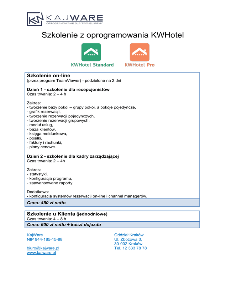 Szkolenie z oprogramowania KWHotel Szkolenie on-line (przez program TeamViewer) - podzielone na 2 dni Dzień 1 - szkolenie dla recepcjonistów Czas trwania: 2 – 4 h Zakres: - tworzenie bazy pokoi – grupy pokoi, a pokoje pojedyncze, - grafik rezerwacji, - tworzenie rezerwacji pojedynczych, - tworzenie rezerwacji grupowych, - moduł usług, - baza klientów, - księga meldunkowa, - posiłki, - faktury i rachunki, - plany cenowe. Dzień 2 - szkolenie dla kadry zarządzającej Czas trwania: 2 – 4h Zakres: - statystyki, - konfiguracja programu, - zaawansowane raporty. Dodatkowo: - konfiguracja systemów rezerwacji on-line i channel managerów. Cena: 450 zł netto Szkolenie u Klienta (jednodniowe) Czas trwania: 4 – 8 h Cena: 600 zł netto + koszt dojazdu KajWare NIP 944-185-15-88 [email protected] www.kajware.pl Oddział Kraków Ul. Zbożowa 3, 30-002 Kraków Tel. 12 333 78 78