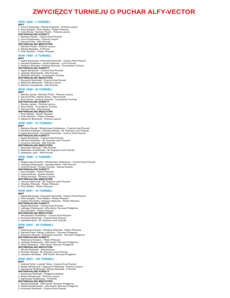 ZWYCIÊZCY TURNIEJU O PUCHAR ALFY-VECTOR ROK 1994 - I TURNIEJ MIXT 1. Anna Paw³owska / Micha³ Grêdziak - Polonia Leszno 2. Ewa Œwi¹tek / Piotr Kieliba - Platan Pleszew 3. Lidia Rossa / Damian Piosik - Polonia Leszno INDYWIDUALNIE KOBIETY 1. Barbara Danek - Czarna Kula Poznañ 2. Anna Paw³owska - Polonia Leszno 3. Danuta Pribe - Alfa Poznañ 1. Damian Piosik - Polonia Leszno 2. Maciej Kl¹ska³a - 9 Wronki 3. Piotr Derwich - Platan Pleszew ROK 1995 - II TURNIEJ MIXT 1. Agata Banaszak / Krzysztof Kamiñski - Czarna Kula Poznañ 2. Karolina Katafiasz / Jacek Klabiñski - Lech Poznañ 3. Stefania Sikorska / Andrzej Schmidt - Tucholanka Tuchola INDYWIDUALNIE KOBIETY 1. Agata Banaszak - Czarna Kula Poznañ 2. Jadwiga Wojcieszak - Alfa Poznañ 3. Stefania Sikorska - Tucholanka Tuchola 1. Krzysztof Kamiñski - Czarna Kula Poznañ 2. S³awomir Bednarek - Polonia Leszno 3. Bartosz Cwojdziñski - Alfa Poznañ ROK 1996 - III TURNIEJ MIXT 1. Monika Jêsiak / Damian Piosik - Polonia Leszno 2. Danuta Pribe / Marek Torka - Alfa Poznañ 3. Ewa Iwicka / Andrzej Schmidt - Tucholanka Tuchola INDYWIDUALNIE KOBIETY 1. Monika Jêsiak - Polonia Leszno 2. Ewa Iwicka - Tucholanka Tuchola 3. Danuta Pribe - Alfa Poznañ 1. Piotr Kieliba - Platan Pleszew 2. Piotr Derwich - Platan Pleszew 3. S³awomir Bednarek - Polonia Leszno ROK 1997 - IV TURNIEJ MIXT 1. Barbara Danek / W³odzimierz Dutkiewicz - Czarna Kula Poznañ 2. Karolina Katafiasz / Wies³aw Musia³ - B³. Express Lech Poznañ 3. Agata Banaszak / Krzysztof Kamiñski - Czarna Kula Poznañ INDYWIDUALNIE KOBIETY 1. Agata Banaszak - Czarna Kula Poznañ 2. Karolina Katafiasz - B³. Express Lech Poznañ 3. Krystyna Golczak - Alfa Poznañ 1. Stanis³aw Golczak - Alfa Poznañ 2. Rados³aw Cwojdziñski - B³. Express Lech Poznañ 3. Sebastian Jêch - Alfa Poznañ ROK 1998 - V TURNIEJ MIXT 1. Ma³gorzata Siniecka / W³odzimierz Dutkiewicz - Czarna Kula Poznañ 2. Jadwiga Wojcieszak / Jaros³aw Bonk - Alfa Poznañ 3. Joanna Nosal / Tomasz Kondej - Sparta Kraków INDYWIDUALNIE KOBIETY 1. Ewa Œwi¹tek - Platan Pleszew 2. Joanna Nosal - Sparta Kraków 3. Kinga Konopa - Polonia Leszno 1. Janusz Adamczak - B³. Express Lech Poznañ 2. Wies³aw Walczak - Platan Pleszew 3. Piotr Kieliba - Platan Pleszew ROK 2001 - VI TURNIEJ MIXT 1. Agata Banaszak / Krzysztof Kamiñski - Czarna Kula Poznañ 2. Ewa Œwi¹tek / Piotr Kieliba - Platan Pleszew 3. Izabela Ruciñska / Wies³aw Walczak - Platan Pleszew INDYWIDUALNIE KOBIETY 1. Agata Banaszak - Czarna Kula Poznañ 2. Jadwiga Wojcieszak - Alfa-Vector Tarnowo Podgórne 3. Ewa Œwi¹tek - Platan Pleszew 1. W³odzimierz Dutkiewicz - Czarna Kula Poznañ 2. Krzysztof Kamiñski - Czarna Kula Poznañ 3. Jaros³aw Bonk - B³. Express Lech Poznañ ROK 2002 - VII TURNIEJ MIXT 1. Katarzyna Krawiec / Wies³aw Walczak - Platan Pleszew 2. Danuta Pribe / Marek Luftmann - Tarnowo Podgórne 3. Krystyna Golczak / Stanis³aw Golczak - Tarnowo Podgórne INDYWIDUALNIE KOBIETY 1. Katarzyna Krawiec - Platan Pleszew 2. Jadwiga Wojcieszak - Alfa-Vector Tarnowo Podgórne 3. Alicja U³asewicz - Alfa-Vector Tarnowo Podgórne 1. Micha³ Grêdziak - niezrzeszony 2. Krystian Kempa - B³. Express Lech Poznañ 3. Jaros³aw Michalak - Alfa-Vector Tarnowo Podgórne ROK 2003 - VIII TURNIEJ MIXT 1. Izabela Torka / Leszek Torka - Czarna Kula Poznañ 2. Beata W³odarczyk / Zygmunt Felenberg - Polonia Leszno 3. Agnieszka Wojtkowiak / Maciej Kl¹ska³a - 9 Wronki INDYWIDUALNIE KOBIETY 1. Katarzyna Macheta - Podgórze Kraków 2. Beata W³odarczyk - Polonia Leszno 3. Agnieszka Wojtkowiak - 9 Wronki 1. Micha³ Grêdziak - Alfa-Vector Tarnowo Podgórne 2. Witold Korzeniewski - Alfa-Vector Tarnowo Podgórne 3. Krzysztof Kamiñski - Czarna Kula Poznañ ZWYCIÊZCY TURNIEJU O PUCHAR ALFY-VECTOR ROK 2004 - IX TURNIEJ MIXT 1. Jadwiga Wojcieszak / Marek Luftmann - Alfa-Vector Tarnowo Podg. 2. Ewa Karliñska / S³awomir Pribe - Czarna Kula Poznañ 3. Barbara Gierzak / Krystian Kempa - B³. Express Lech Poznañ INDYWIDUALNIE KOBIETY 1. Bogus³awa U³asewicz - Alfa-Vector Tarnowo Podgórne 2. Barbara Danek - Czarna Kula Poznañ 3. Jadwiga Wojcieszak - Alfa-Vector Tarnowo Podgórne 1. Jaros³aw Bonk - Alfa-Vector Tarnowo Podgórne 2. Wies³aw Walczak - Platan Pleszew 3. Adam Nowak - Alfa-Vector Tarnowo Podgórne ROK 2005 - X TURNIEJ MIXT 1. Izabela Torka / Leszek Torka - Czarna Kula Poznañ 2. Joanna Neczyñska / Zygmunt Felenberg - Polonia Leszno 3. Krystyna Golczak / Micha³ Grêdziak - Alfa-Vector Tarnowo Podg. INDYWIDUALNIE KOBIETY 1. Marta Dyzert - Czarna Kula Poznañ 2. Joanna Lajtke - Polonia Leszno 3. Miros³awa Dobkowicz - Wejherowianka Wejherowo 1. Jaros³aw Bonk - Alfa-Vector Tarnowo Podgórne 2. Micha³ Grêdziak - Alfa-Vector Tarnowo Podgórne 3. Leszek Torka - Czarna Kula Poznañ ROK 2006 - XI TURNIEJ MIXT 1. Joanna Neczyñska / Zygmunt Felenberg - Polonia Leszno 2. Agata Banaszak / Krzysztof Kamiñski - Platan Pleszew / Tucholanka Tuchola 3. Izabela Torka / Leszek Torka - Czarna Kula Poznañ INDYWIDUALNIE KOBIETY 1. Agata Banaszak - Platan Pleszew 2. Ewa Œwi¹tek - Platan Pleszew 3. Izabela Torka - Czarna Kula Poznañ 1. Krzysztof Kamiñski - Tucholanka Tuchola 2. Marek Majer - Polonia Leszno 3. Jaros³aw Maækowiak - Czarna Kula Poznañ ROK 2007 - XII TURNIEJ MIXT 1. Dorota Or³owska / Jakub Osiewicz - Dêbinki Gdañsk / Start Gostyñ 2. Agata Banaszak / Krzysztof Kamiñski - Platan Pleszew / Start Gostyñ 3. Ma³gorzata Leopold / Dawid Strzelczak - Alfa-Vector Tarnowo Podgórne INDYWIDUALNIE KOBIETY 1. Agata Banaszak - Platan Pleszew 2. Ewa Iwicka - Tucholanka Tuchola 3. Danuta Pribe - Liga Vector 1. Jakub Osiewicz - Start Gostyñ 2. Jaros³aw Michalak - Alfa-Vector Tarnowo Podgórne 3. Maciej Dokowicz - Czarna Kula Poznañ ROK 2008 - XIII TURNIEJ INDYWIDUALNIE KOBIETY 1. Beata W³odarczyk - Polonia 1912 Leszno 2. Anna Chwastyniak - Polonia 1912 Leszno 3. Kinga Konopa - Polonia 1912 Leszno 1. Micha³ Grêdziak - Alfa-Vector Tarnowo Podgórne 2. Marek Majer - Polonia