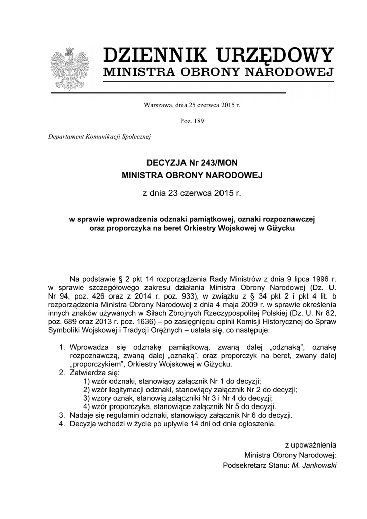 Warszawa, dnia 25 czerwca 2015 r. Poz. 189 Departament Komunikacji Społecznej DECYZJA Nr 243/MON MINISTRA OBRONY NARODOWEJ z dnia 23 czerwca 2015 r. w sprawie wprowadzenia odznaki pamiątkowej, oznaki rozpoznawczej oraz proporczyka na beret Orkiestry Wojskowej w Giżycku Na podstawie § 2 pkt 14 rozporządzenia Rady Ministrów z dnia 9 lipca 1996 r. w sprawie szczegółowego zakresu działania Ministra Obrony Narodowej (Dz. U. Nr 94, poz. 426 oraz z 2014 r. poz. 933), w związku z § 34 pkt 2 i pkt 4 lit. b rozporządzenia Ministra Obrony Narodowej z dnia 4 maja 2009 r. w sprawie określenia innych znaków używanych w Siłach Zbrojnych Rzeczypospolitej Polskiej (Dz. U. Nr 82, poz. 689 oraz 2013 r. poz. 1636) – po zasięgnięciu opinii Komisji Historycznej do Spraw Symboliki Wojskowej i Tradycji Orężnych – ustala się, co następuje: 1. Wprowadza się odznakę pamiątkową, zwaną dalej „odznaką”, oznakę rozpoznawczą, zwaną dalej „oznaką”, oraz proporczyk na beret, zwany dalej „proporczykiem”, Orkiestry Wojskowej w Giżycku. 2. Zatwierdza się: 1) wzór odznaki, stanowiący załącznik Nr 1 do decyzji; 2) wzór legitymacji odznaki, stanowiący załącznik Nr 2 do decyzji; 3) wzory oznak, stanowią załączniki Nr 3 i Nr 4 do decyzji; 4) wzór proporczyka, stanowiące załącznik Nr 5 do decyzji. 3. Nadaje się regulamin odznaki, stanowiący załącznik Nr 6 do decyzji. 4. Decyzja wchodzi w życie po upływie 14 dni od dnia ogłoszenia. z upoważnienia Ministra Obrony Narodowej: Podsekretarz Stanu: M. Jankowski Załączniki do decyzji Nr 243/MON Ministra Obrony Narodowej z dnia 23.06.2015 r. (poz. 189) Załącznik Nr 1 WZÓR GRAFICZNY ODZNAKI PAMIĄTKOWEJ ORKIESTRY WOJSKOWEJ W GIŻYCKU Załącznik Nr 2 WZÓR GRAFICZNY LEGITYMACJI ODZNAKI PAMIĄTKOWEJ ORKIESTRY WOJSKOWEJ W GIŻYCKU ORKIESTRA WOJSKOWA W GIŻYCKU Na podstawie Rozkazu Dziennego Dowódcy Orkiestry Wojskowej w Giżycku Nr...........z dnia......................... …............................................................... LEGITYMACJA (stopień, imię i nazwisko) jest uprawniony do posiadania Nr …......... ODZNAKI PAMIĄTKOWEJ ORKIESTRY WOJSKOWEJ W GIŻYCKU DOWÓDCA - KAPELMISTRZ ……………….. Giżycko, dn....................... m. p. ORKIESTRA WOJSKOWA W GIŻYCKU Załącznik Nr 3 WZÓR GRAFICZNY OZNAKI ROZPOZNAWCZEJ ORKIESTRY WOJSKOWEJ W GIŻYCKU NA MUNDUR WYJŚCIOWY Załącznik Nr 4 WZÓR GRAFICZNY OZNAKI ROZPOZNAWCZEJ ORKIESTRY WOJSKOWEJ W GIŻYCKU NA MUNDUR POLOWY Załącznik Nr 5 WZÓR GRAFICZNY PROPORCZYKA NA BERET ORKIESTRY WOJSKOWEJ W GIŻYCKU Załącznik Nr 6 REGULAMIN ODZNAKI PAMIĄTKOWEJ ORKIESTRY WOJSKOWEJ W GIŻYCKU 1. Odznaka pamiątkowa Orkiestry Wojskowej (OW) w Giżycku, zwana dalej „odznaką”, jest widocznym znakiem przynależności i nienagannej służby w szeregach Orkiestry Wojskowej oraz zewnętrznym symbolem solidarności i współpracy żołnierskiej. 2. Odznaka ma kształt liry barwy złocistej z nałożonymi na nią symbolami: herbem miasta Giżycka i stylizowanym białym żaglem. Symbole te nawiązują do miejsca stacjonowania i działania orkiestry. 3. Prawo do otrzymania odznaki przysługuje: 1) Dowódcy – Kapelmistrzowi OW w Giżycku z dniem objęcia stanowiska służbowego; 2) żołnierzom, po minimum dwóch latach nienagannie pełnionej służby w OW w Giżycku; 3) żołnierzom rezerwy, będącym na przydziałach mobilizacyjnych w OW w Giżycku za szczególne zasługi; 4) wyjątkowo, na wniosek Komisji do Spraw Odznaki Pamiątkowej zwanej dalej „Komisją”, innym osobom fizycznym lub prawnym, zasłużonym dla OW w Giżycku. 4. Dowódca – Kapelmistrz OW w Giżycku powołuje Komisję. 5. W skład Komisji wchodzą: 1) asystent kapelmistrza – przewodniczący; 2) trzech podoficerów – członkowie. 6. Imienny skład Komisji oraz wszelkie zmiany w jej składzie ogłasza się rozkazie dziennym Dowódcy – Kapelmistrza OW w Giżycku. 7. Do obowiązków Komisji w szczególności należy: 1) opiniowanie wniosków o nadanie lub pozbawienie prawa do odznaki; 2) przedkładanie ww. wniosków do zatwierdzenia Dowódcy – Kapelmistrzowi OW; 3) prowadzenie ewidencji odznak. 8. Odznaki są numerowane i nadawane wraz z legitymacją. 9. Odznakę nadaje Dowódca – Kapelmistrz OW w Giżycku na wniosek Komisji. 10. Fakt nadania odznaki odnotowuje się w rozkazie dziennym Dowódcy – Kapelmistrza oraz w Kronice Orkiestry. 11. Odznaka nadawana jest imiennie i może być noszona jedynie przez osobę nią wyróżnioną. Niedopuszczalne jest przekazywanie odznaki innym osobom, darowanie lub sprzedaż osobom trzecim. 12. Odznakę wraz z legitymacją wręcza się z okazji świąt państwowych i wojskowych oraz w innych szczególnie ważnych dla służby i pracy okolicznościach, zgodnie z wymogami ceremoniału wojskowego. 13. Posiadaczom odznaki nie przysługują jakiekolwiek prawa czy przywileje z tytułu jej posiadania. 14. Odznakę nosi się zgodnie z zasadami określonymi w przepisach ubiorczych żołnierzy Sił Zbrojnych Rzeczypospolitej Polskiej. 15. Prawo do odznaki tracą żołnierze skazani prawomocnym wyrokiem sądu za przestępstwa oraz w popełnione z uzasadnionych winy umyślnej lub z przypadkach żołnierze ukarani niskich za pobudek przewinienia dyscyplinarne. 16. Decyzję o pozbawieniu prawa do posiadania odznaki podejmuje Dowódca – Kapelmistrz OW z własnej inicjatywy lub na wniosek Komisji. Od powyższej decyzji przysługuje prawo do odwołania na piśmie do Dowódcy wyższego szczebla w terminie 14 dni od zawiadomienia o pozbawieniu prawa do jej posiadania. Decyzja przełożonego wyższego szczebla jest ostateczna. 17. Wizerunek odznaki może być używany na drukach, których tematyka jest ściśle związana z OW w Giżycku. 18. Jeden egzemplarz odznaki przekazuje się do Muzeum Wojska Polskiego. Zakupu odznaki dokonuje się z wydatków bieżących właściwej wojskowej jednostki budżetowej. 19. Koszty wykonania matrycy i wszystkich serii odznak