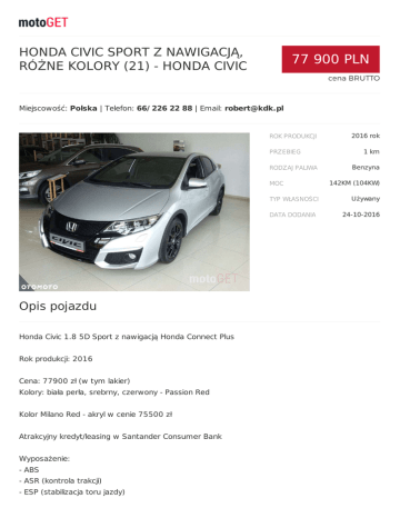 HONDA CIVIC SPORT Z NAWIGACJĄ, RÓŻNE KOLORY (21) - HONDA CIVIC 77 900 PLN cena BRUTTO Miejscowość: Polska | Telefon: 66/ 226 22 88 | Email: [email protected] 2016 rok 1 km Benzyna 142KM (104KW) Używany 24-10-2016 Opis pojazdu Honda Civic 1.8 5D Sport z nawigacją Honda Connect Plus Rok produkcji: 2016 Cena: 77900 zł (w tym lakier) Kolory: biała perła, srebrny, czerwony - Passion Red Kolor Milano Red - akryl w cenie 75500 zł Atrakcyjny kredyt/leasing w Santander Consumer Bank Wyposażenie: - ABS - ASR (kontrola trakcji) - ESP (stabilizacja toru jazdy) - Poduszki i kurtyny powietrzne - Isofix - Centralny zamek - Immobilizer - Alarm - System Start-Stop - Wspomaganie kierownica - Wielofunkcyjna kierownica - Komputer pokładowy - Tempomat - Ogranicznik prędkości - Radio CD/MP3 - Gniazdo AUX - Gniazdo USB - Bluetooth - Nawigacja GPS - Klimatyzacja automatyczna - Podgrzewane przednie siedzenia - Elektryczne szyby przednie - Elektryczne szyby tylne - Elektrycznie ustawiane, podgrzewane lusterka boczne - Kamera cofania - Czujnik deszczu - Światła LED do jazdy dziennej - Światła przeciwmgielne - Alufelgi Zapraszamy do odbycia jazdy testowej