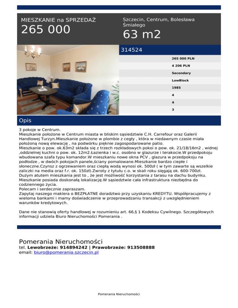 Szczecin, Centrum, Bolesława Śmiałego MIESZKANIE na SPRZEDAŻ 265 000 63 m2 314524 265 000 PLN 4 206 PLN Secondary LowBlock 1985 4 4 3 Opis 3 pokoje w Centrum. Mieszkanie położone w Centrum miasta w bliskim sąsiedztwie C.H. Carrefour oraz Galerii Handlowej Turzyn.Mieszkanie położone w plombie z cegły , która w niedawnym czasie miała położoną nową elewację , na podwórku pięknie zagospodarowane patio. Mieszkanie o pow. ok.63m2 składa się z trzech rozkładowych pokoi o pow. ok. 21/18/16m2 , widnej ,oddzielnej kuchni o pow. ok. 12m2.Łazienka i w.c. osobno w glazurze i terakocie.W przedpokoju wbudowana szafa typu komandor.W mieszkaniu nowe okna PCV , glazura w przedpokoju na podłodze , w dwóch pokojach panele,ściany pomalowane.Mieszkanie bardzo ciepłe i słoneczne.Czynsz z ogrzewaniem oraz ciepłą wodą wynosi ok. 500zł ( w tym zawarte są wszelkie zaliczki na media oraz f.r. ok. 150zł).Zwroty z tytułu c.o. w skali roku sięgają ok. 600-700zł. Dużym atutem mieszkania jest to , że jest możliwość korzystania z tarasu na dachu budynku. Mieszkanie posiada doskonałą lokalizację.W sąsiedztwie cała infrastruktura niezbędna do codziennego życia. Polecam i serdecznie zapraszam. Zapytaj naszego maklera o BEZPŁATNE doradztwo przy uzyskaniu KREDYTU. Współpracujemy z wieloma bankami i mamy doświadczenie w przeprowadzaniu transakcji z uwzględnieniem warunków kredytowych. Dane nie stanowią oferty handlowej w rozumieniu art. 66,§ 1 Kodeksu Cywilnego. Szczegółowych informacji udziela Biuro Nieruchomości Pomerania . Pomerania Nieruchomości tel. Lewobrzeże: 914894242 | Prawobrzeże: 913508888 email: [email protected] Pomerania Nieruchomości Powered by TCPDF (www.tcpdf.org)