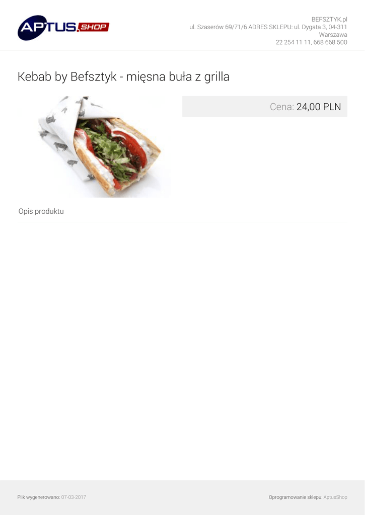 BEFSZTYK.pl ul. Szaserów 69/71/6 ADRES SKLEPU: ul. Dygata 3, 04-311 Warszawa 22 254 11 11, 668 668 500 Kebab by Befsztyk - mięsna buła z grilla Cena: 24,00 PLN Opis produktu Plik wygenerowano: 07-03-2017 Powered by TCPDF (www.tcpdf.org) Oprogramowanie sklepu: AptusShop