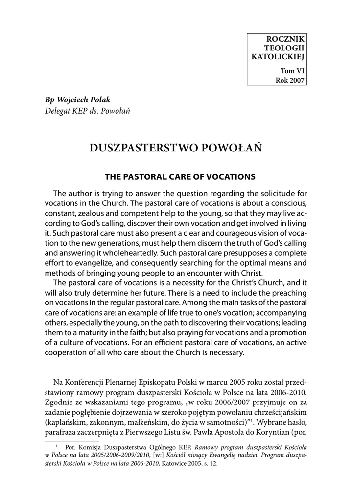 Rocznik Teologii Katolickiej Tom VI Rok 2007 Bp Wojciech Polak Delegat KEP ds. Powołań Duszpasterstwo powołań The Pastoral Care of Vocations The author is trying to answer the question regarding the solicitude for vocations in the Church. The pastoral care of vocations is about a conscious, constant, zealous and competent help to the young, so that they may live according to God’s calling, discover their own vocation and get involved in living it. Such pastoral care must also present a clear and courageous vision of vocation to the new generations, must help them discern the truth of God’s calling and answering it wholeheartedly. Such pastoral care presupposes a complete effort to evangelize, and consequently searching for the optimal means and methods of bringing young people to an encounter with Christ. The pastoral care of vocations is a necessity for the Christ’s Church, and it will also truly determine her future. There is a need to include the preaching on vocations in the regular pastoral care. Among the main tasks of the pastoral care of vocations are: an example of life true to one’s vocation; accompanying others, especially the young, on the path to discovering their vocations; leading them to a maturity in the faith; but also praying for vocations and a promotion of a culture of vocations. For an efficient pastoral care of vocations, an active cooperation of all who care about the Church is necessary. Na Konferencji Plenarnej Episkopatu Polski w marcu 2005 roku został przedstawiony ramowy program duszpasterski Kościoła w Polsce na lata 2006-2010. Zgodnie ze wskazaniami tego programu, „w roku 2006/2007 przyjmuje on za zadanie pogłębienie dojrzewania w szeroko pojętym powołaniu chrześcijańskim (kapłańskim, zakonnym, małżeńskim, do życia w samotności)”1. Wybrane hasło, parafraza zaczerpnięta z Pierwszego Listu św. Pawła Apostoła do Koryntian (por. 1 Por. Komisja Duszpasterstwa Ogólnego KEP, Ramowy program duszpasterski Kościoła w Polsce na lata 2005/2006-2009/2010, [w:] Kościół niosący Ewangelię nadziei. Program duszpasterski Kościoła w Polsce na lata 2006-2010, Katowice 2005, s. 12. Duszpasterstwo powołań 19 1 Kor 1,26) – „Przypatrzmy się powołaniu naszemu” – jednoznacznie sugeruje, że tak jak kiedyś pierwotną wspólnotę chrześcijańską w Koryncie, tak i dzisiaj, wspólnotę Chrystusowego Kościoła w Polsce, Apostoł Narodów zachęca w tym roku do szczególnej autorefleksji – „przypatrzmy się bracia sobie” – do ponownego odkrycia własnej tożsamości, do ożywczego powrotu do korzeni, czyli do źródeł naszego chrześcijańskiego powołania. W przypadku powołania kapłańskiego to sięganie do źródeł czy do korzeni powołania, będzie niewątpliwie związane z jakąś szczególną, duchową wędrówką do jerozolimskiego Wieczernika. Tutaj bowiem – jak pisał w swej książce Wstańcie, chodźmy! sługa Boży Jan Paweł II – „pulsują źródła kapłańskiego powołania”. Ale Chrystusowe słowa, wypowiedziane „w godzinie, na którą przyszedł” (por. J 12,27), słowa „o większej jeszcze miłości, która oddaje życie za przyjaciół swoich”, i Jezusowy nakaz – mandatum – „trwajcie w miłości mojej (...) abyście się wzajemnie miłowali, tak jak Ja was umiłowałem” (por. J 15, 9-14), są – jak zapewniał nas sam Wielki Papież – „korzeniem każdego powołania w Kościele. Z tych słów wypływają ożywcze soki, które dają początek każdemu powołaniu: Apostołów i ich następców, podobnie jak powołaniu każdego człowieka, bo Syn pragnie być «przyjacielem» każdego: za wszystkich bowiem oddał swoje życie, To co najważniejsze, najcenniejsze i najświętsze, spotyka się w tych słowach: miłość Ojca i miłość Chrystusa do nas, Jego i nasza radość, jak też nasza przyjaźń i wierność, która wyraża się w wypełnianiu przykazań. W tych słowach – pisał dalej sługa Boży Jan Paweł II – zawiera się także cel i sens naszego powołania: abyśmy szli i owoc przynosili, i aby owoc nasz trwał...” (por. J 15, 16)2. Odkrywanie źródeł powołania wiąże się również z przekonaniem, że każde powołanie – „kapłańskie czy do życia konsekrowanego, małżeńskie czy do życia w samotności – jest darem i tajemnicą, która nieskończenie przerasta człowieka”3. To Bóg jest Dawcą powołania, a ono jest zawsze – jak pisał o swoim powołaniu wspomniany już Jan Paweł II – „tajemnicą Bożego wybrania”4. W swej najgłębszej warstwie jest więc szczególnym dialogiem miłości pomiędzy Bogiem i człowiekiem, dialogiem, w którym dochodzą do głosu – jak wyjaśniał to obszernie z kolei w swoim Liście do młodych Jan Paweł II – „czynniki układające się zwykle w określony porządek wartości (nazywany także: hierarchią wartości), z których wyłania się atrakcyjny dla młodego serca ideał do urzeczywistnienia. Na tej drodze «powołanie» staje się «projektem» – a projekt zaczyna oznaczać także powołanie”5. Jan Paweł II, Wstańcie, chodźmy!, Karków 2004, s. 10-11. Por. tenże, Dar i tajemnica. W pięćdziesiątą rocznicę moich święceń kapłańskich, Kraków 2005, s. 7. 4 Tamże. 5 Tenże, List apostolski Ojca Świętego Jana Pawła II do młodych całego świata z okazji Międzynarodowego Roku Młodzieży, Rzym, 31 marca 1985, [w:] tenże, Młodzież nadzieją Kościoła. Orędzia na Światowe Dni Młodzieży, Warszawa 2005, s. 26. 2 3 Bp Wojciech Polak 20 W tym sensie dar i łaska powołania nie unicestwiają nigdy wolności człowieka, ale jej się domagają. Młodość bowiem jest czasem rozpoznawania spraw zasadniczych i doniosłych, a przez to konstruowania własnego „projektu życia”. Tajemnica Bożego wybrania domaga się bowiem odkrycia, czy lepiej jeszcze – rozeznania swego powołania i udzielenia na nie wielkodusznej odpowiedzi. Stąd – jak przypomina nam adhortacja ap