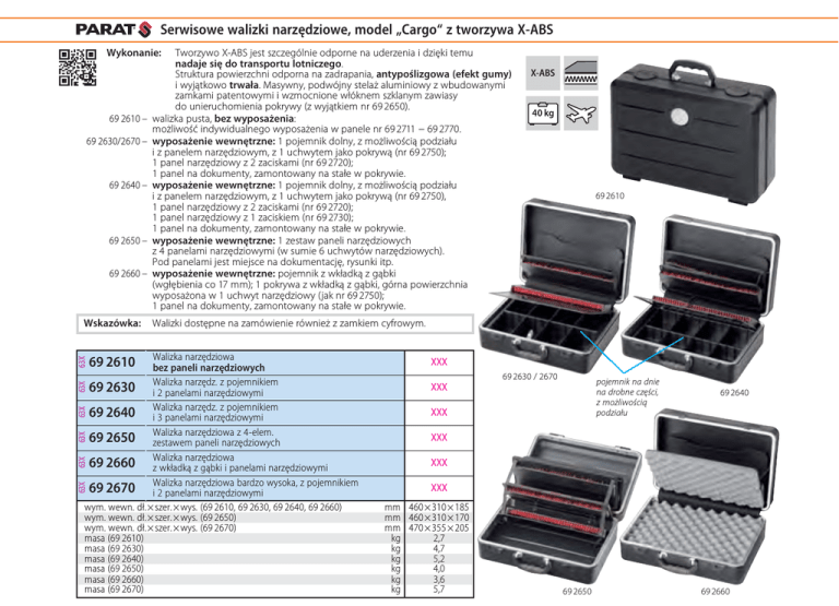 Serwisowe walizki narzędziowe, model „Cargo“ z tworzywa X-ABS Wykonanie: 69 2610 – 69 2630/2670 – 69 2640 – 69 2650 – 69 2660 – Wskazówka: Tworzywo X-ABS jest szczególnie odporne na uderzenia i dzięki temu nadaje się do transportu lotniczego. Struktura powierzchni odporna na zadrapania, antypoślizgowa (efekt gumy) i wyjątkowo trwała. Masywny, podwójny stelaż aluminiowy z wbudowanymi zamkami patentowymi i wzmocnione włóknem szklanym zawiasy do unieruchomienia pokrywy (z wyjątkiem nr 69 2650). walizka pusta, bez wyposażenia: możliwość indywidualnego wyposażenia w panele nr 69 2711 − 69 2770. wyposażenie wewnętrzne: 1 pojemnik dolny, z możliwością podziału i z panelem narzędziowym, z 1 uchwytem jako pokrywą (nr 69 2750); 1 panel narzędziowy z 2 zaciskami (nr 69 2720); 1 panel na dokumenty, zamontowany na stałe w pokrywie. wyposażenie wewnętrzne: 1 pojemnik dolny, z możliwością podziału i z panelem narzędziowym, z 1 uchwytem jako pokrywą (nr 69 2750), 1 panel narzędziowy z 2 zaciskami (nr 69 2720); 1 panel narzędziowy z 1 zaciskiem (nr 69 2730); 1 panel na dokumenty, zamontowany na stałe w pokrywie. wyposażenie wewnętrzne: 1 zestaw paneli narzędziowych z 4 panelami narzędziowymi (w sumie 6 uchwytów narzędziowych). Pod panelami jest miejsce na dokumentację, rysunki itp. wyposażenie wewnętrzne: pojemnik z wkładką z gąbki (wgłębienia co 17 mm); 1 pokrywa z wkładką z gąbki, górna powierzchnia wyposażona w 1 uchwyt narzędziowy (jak nr 69 2750); 1 panel na dokumenty, zamontowany na stałe w pokrywie. 63X 63X XXX 63X XXX 63X 63X 69 2610 XXX XXX XXX 63X 40 kg Walizki dostępne na zamówienie również z zamkiem cyfrowym. Walizka narzędziowa bez paneli narzędziowych narzędz. z pojemnikiem 69 2630 Walizka i 2 panelami narzędziowymi narzędz. z pojemnikiem 69 2640 Walizka i 3 panelami narzędziowymi narzędziowa z 4-elem. 69 2650 Walizka zestawem paneli narzędziowych narzędziowa 69 2660 Walizka z wkładką z gąbki i panelami narzędziowymi narzędziowa bardzo wysoka, z pojemnikiem 69 2670 Walizka i 2 panelami narzędziowymi wym. wewn. dł.×szer.×wys. (69 2610, 69 2630, 69 2640, 69 2660) wym. wewn. dł.×szer.×wys. (69 2650) wym. wewn. dł.×szer.×wys. (69 2670) masa (69 2610) masa (69 2630) masa (69 2640) masa (69 2650) masa (69 2660) masa (69 2670) 69 2610 X-ABS 69 2630 / 2670 pojemnik na dnie na drobne części, z możliwością podziału 69 2640 XXX mm 460×310×185 mm 460×310×170 mm 470×355×205 kg 2,7 kg 4,7 kg 5,2 kg 4,0 kg 3,6 kg 5,7 69 2650 69 2660