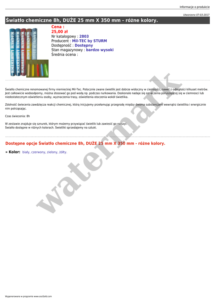Informacje o produkcie Utworzono 07-03-2017 Światło chemiczne 8h, DUŻE 25 mm X 350 mm - różne kolory. Cena : 25,00 zł er m ar k Nr katalogowy : 2803 Producent : Mil-TEC by STURM Dostępność : Dostępny Stan magazynowy : bardzo wysoki Średnia ocena : Światło chemiczne renomowanej firmy niemieckiej Mil-Tec. Potocznie zwane świetlik jest dobrze widoczny w ciemności, nawet z odległości kilkuset metrów. Jest całkowicie wodoodporny, można stosować go pod wodą np. podczas nurkowania. Doskonale nadaje się oznaczenia poruszającej się w ciemnosci lub niedostatecznym oświetleniu osoby, wyznaczenia trasy, oświetlenia otoczenia wokół świetlika. Zdolność świecenia zawdzięcza reakcji chemicznej, którą inicjujemy przełamując przegrodę między dwoma substancjami wewnątrz świetlika i energicznie nim potrząsając. Czas świecenia: 8h W zestawie znajduje się sznurek, którym możemy przywiązać świetlik lub zawiesić go na szyi. Światło dostępne w różnych kolorach. Świetliki sprzedajemy na sztuki. Dostępne opcje Światło chemiczne 8h, DUŻE 25 mm X 350 mm - różne kolory. w at » Kolor: biały, czerwony, zielony, żółty. Wygenerowano w programie www.oscGold.com
