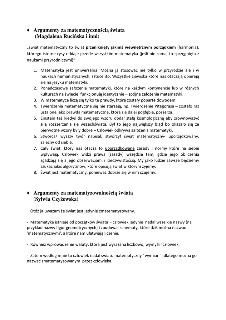 ♦ Argumenty za matematycznością świata (Magdalena Rucińska i inni) „świat matematyczny to świat przeniknięty jakimś wewnętrznym porządkiem (harmonią), którego istotne rysy oddaje przede wszystkim matematyka (jeśli nie sama, to sprzęgnięta z naukami przyrodniczymi)” 1. Matematyka jest uniwersalna. Można ją stosować nie tylko w przyrodzie ale i w naukach humanistycznych, sztuce itp. Wszystkie zjawiska które nas otaczają opierają się na języku matematyki. 2. Ponadczasowe założenia matematyki, które na każdym kontynencie lub w różnych kulturach na świecie funkcjonują identycznie – spójne założenia matematyki. 3. W matematyce liczą się tylko te prawdy, które zostały poparte dowodem. 4. Twierdzenia matematyczne się nie starzeją, np. Twierdzenie Pitagorasa – zostało raz ustalone jako prawda matematyczna, którą się dalej pogłębia, poszerza. 5. Einstein też kiedyś do swojego wzoru dodał stałą kosmologiczną aby zrównoważyć siłę rozszerzania się wszechświata. Był to jego największy błąd bo okazało się że pierwotne wzory były dobre – Człowiek odkrywa założenia matematyki. 6. Stwórca/ wyższy twór napisał, stworzył świat matematyczny- uporządkowany, zależny od siebie. 7. Cały świat, który nas otacza to uporządkowane zasady i normy które na siebie wpływają. Człowiek widzi prawa (zasady) wszędzie tam, gdzie jego obliczenia zgadzają się z jego obserwacjami i rzeczywistością. My jako ludzie zawsze będziemy szukać jakiś algorytmów, które opisują świat w którym żyjemy. 8. Świat jest matematyczny, ponieważ dobrze się w nim czujemy. ♦ Argumenty za matematyzowalnością świata (Sylwia Czyżewska) Otóż ja uważam że świat jest jedynie zmatematyzowany. - Matematyka istnieje od początków świata - człowiek jedynie nadał wszelkie nazwy (na przykład nazwy figur geometrycznych) i zbudował schematy, które dziś można nazwać 'matematycznymi', a które nam ułatwiają liczenie. - Również wprowadzenie waluty, która jest wyrażana liczbowo, wymyślił człowiek. - Zatem według mnie to człowiek nadal światu matematyczny ' wymiar ' i dlatego można go nazwać zmatematyzowanym przez człowieka.