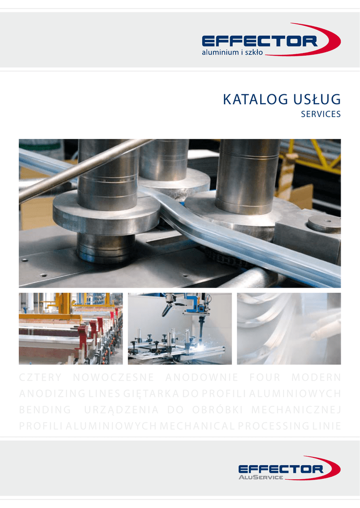 Katalog usług services C Z TER Y N O W OC Z ES N E A N O D O W N IE F OUR M O D ER N A N O D I Z I N G LIn e s G i ę ta r kA d o p r o f i l i a l u m i n i o wy c h B e nd i n g u r z ą dz e n i a d o o b r ó bk i m e c h a n i c zn e j p r o f i l i a lu m i n i o wyc h M e c h a n i c a l p r o c e s s i n g l i n i e spis treści: contents 1. misja Mission Statement 3 2. o firmie About the company 4 3. ekologia Ecology 8 4. usługi – Aluservice Services – Aluservice 12 5. 2 4.1 NOWOCZESNE ANODOWNIE MODERN ANODIZING LInes 16 4.2 GiętarkA do profili aluminiowych Bending 22 4.3 urządzenia do obróbki mechanicznej profili aluminiowych Mechanical processing 23 4.4 linie do powlekania profili foliami dekoracyjnymi i ochronnymi Coating with decorative and protective foils 28 4.5 urządzenie do śrutowania profili aluminiowych Shot-blasting 29 4.6 Linia do polerowania mechanicznego profili aluminiowych Polishing 30 4.7 linia do szczotkowania profili aluminiowych Brushing 32 4.8 Robot kawasaki mk Robot kawasaki mk 34 4.9 Automatyczne linie do lakierowania Proszkowego profili aluminiowych POWDER coating 36 Certyfikaty certificates 39 Katalog usług | services 1. misja Naszą misją jest dostarczanie najwyższej jakości produktów, usług i rozwiązań, spełniających wyszukane oczekiwania Klientów. Wyróżniają nas profesjonalne rozwiązania techniczne, nieustanne doskonalenie infrastruktury przedsiębiorstwa oraz wysoki poziom jakości obsługi. Indywidualne projekty, wyjątkowa jakość surowca oraz nowoczesny design służą zapewnieniu pełnej satysfakcji Klientów oraz zagwarantowaniu najlepszych standardów współpracy. Katalog usług | services misssion statement The primary goal of our Company is to deliver products and services to meet the identified and foreseen requirements of our current and future Customers, as well as any legal or other requirements, which apply to our operation. Through high standards of delivered quality we aim to achieve complete Customer satisfaction and a sustainable leading position in the market. 3 2. O Firmie Historia firmy Effector S. A. sięga roku 1991. Ponad dwadzieścia lat nieustannego rozwoju oraz doświadczeń generowanych na krajowych i zagranicznych rynkach to potencjał, który kształtuje naszą teraźniejszość i ma istotny wpływ na przyszłość. W oparciu o najnowsze technologie i rozwiązania organizacyjne oraz własny know-how, produkujemy i dystrybuujemy wiele produktów, pogrupowanych w następujących sektorach: Effector ALUDECOR - listwy wykończeniowe i elementy do aranżacji wnętrz Effector ALUSERVICE - usługi powierzchniowej i mechanicznej obróbki aluminium Effector ALUSTYLE - produkty przeznaczone dla wytwórców stolarki okiennej i drzwiowej: okapniki rynnowe, okładziny okienne, listwy przyszybowe, progi drzwiowe, systemy okienne drewniano-aluminiowe oraz szeroko rozumiana stolarka aluminiowa (jak np. stolarka okienno-drzwiowa, fasadowa, okiennice). Marka EFFECTOR posiada także bogatą ofertę szyb zespolonych i szkła specjalnego, wytwarzaną przez firmę EFFECT GLASS. Nasz główny zakład produkcyjny, a zarazem siedziba Spółki mieści się we Włoszczowie. Najważniejsze jego wydziały to specjalistyczna obróbka mechaniczna, cztery linie do anodowania, dwie linie do lakierowania proszkowego oraz nowoczesna oczyszczalnia ścieków. Dzięki wieloletniemu doświadczeniu projektowo-konstrukcyjnemu, aktywnemu kształtowaniu oferty produktowej, nieustannie unowocześniamy i rozwijamy naszą dystrybucję, wprowadzamy nowe produkty, jeszcze lepiej dopasowane do obecnych oczekiwań rynku. Wyroby marki Effector posiadają wymagane aprobaty techniczne, atesty oraz stosowne Certyfikaty (m. in. QUALICOAT i QUALANOD). Troska o zapewnienie satysfakcji, poczucie komfortu oraz wysoką jakość wykonywanych usług oznacza dbałość o najwyższy standard oferowanych produktów, dostęp do informacji oraz właściwą komunikację i profesjonalizm podczas całego procesu realizacji zamówienia. Effector to firma realizująca w praktyce idee Społecznej Odpowiedzialności Biznesu, zachowująca wysokie standardy zrównoważonego rozwoju na wielu płaszczyznach: w sferze produkcji, dbałości o środowisko naturalne oraz współpracy z lokalnymi społecznościami. Spółka dba o to, by stosowane przez nią technologie oraz oferowane wyroby były neutralne dla środowiska naturalnego. Naturalną konsekwencją wcześniejszych działań była decyzja o wdrożeniu Zintegrowanego Systemu Zarządzania Jakością i Ochrony Środowiska, zgodnie z normami EN ISO 9001:2008 i EN ISO 14001:2004. 4 Katalog usług | services About the company The history of our Company goes back to 1991. Twenty years of continuous development and experience gained in many markets are values that shape our present and future strategies. On the basis of cutting-edge technology, organizational solutions and our own know-how we manufacture and distribute aluminium drip caps for wooden windows, window lining systems, finishing and decorative slats and double-glazed units as well as provide support and services concerning surface and mechanical treatment of aluminium products. The production unit in Włoszczowa, which at the same time is the Company’s registered office, consists of: section of mechanical treatment of aluminium products, four anodising lines and two powder coating lines with a state-of-the-art wastewater treatment plant. Combined with our experience in design and construction and an active participation in market activities, it allows us to constantly improve our products, already introduced to the market and start new lines. Continuous development of the Company, both in production and organisational terms, aims at meeting the constantly changing expectations of our Customers and the market. All our products conform to technical and quality standards, what is proved by required technical approvals and appropriate certificates. The integral pa