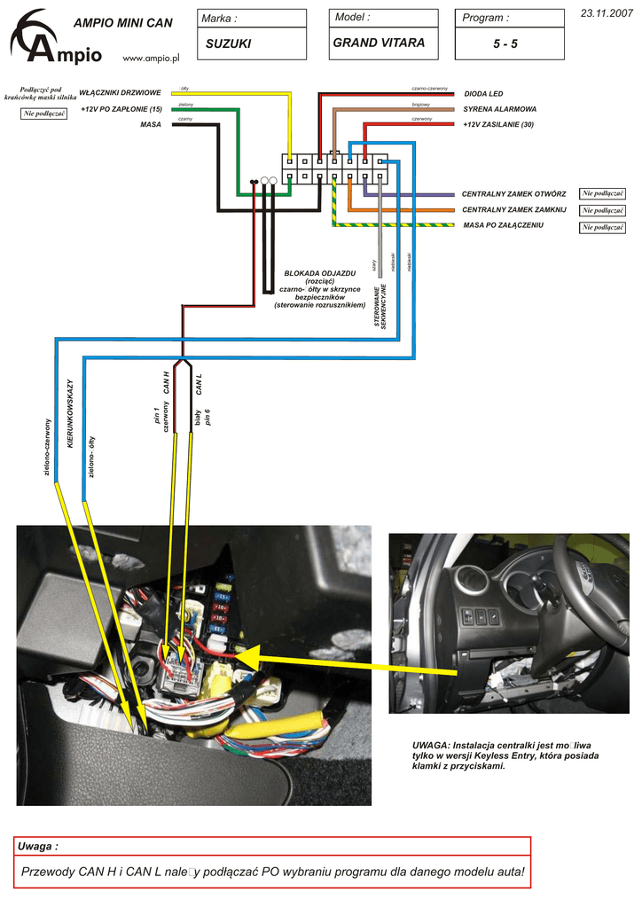 Marka : AMPIO MINI CAN SUZUKI Model : Program : GRAND VITARA 23.11.2007 5-5 www.ampio.pl Podłączyć pod WŁĄCZNIKI DRZWIOWE krańcówkę maski silnika Nie podłączać +12V PO ZAPŁONIE (15) żółty czarno-czerwony zielony brązowy czarny czerwony DIODA LED MASA SYRENA ALARMOWA +12V ZASILANIE (30) CENTRALNY ZAMEK OTWÓRZ Nie podłączać CENTRALNY ZAMEK ZAMKNIJ Nie podłączać MASA PO ZAŁĄCZENIU Nie podłączać biały pin 6 pin 1 czerwony zielono-żółty zielono-czerwony BLOKADA ODJAZDU (rozciąć) czarno-żółty w skrzynce bezpieczników (sterowanie rozrusznikiem) UWAGA: Instalacja centralki jest możliwa tylko w wersji Keyless Entry, która posiada klamki z przyciskami. Uwaga : Przewody CAN H i CAN L należy podłączać PO wybraniu programu dla danego modelu auta!