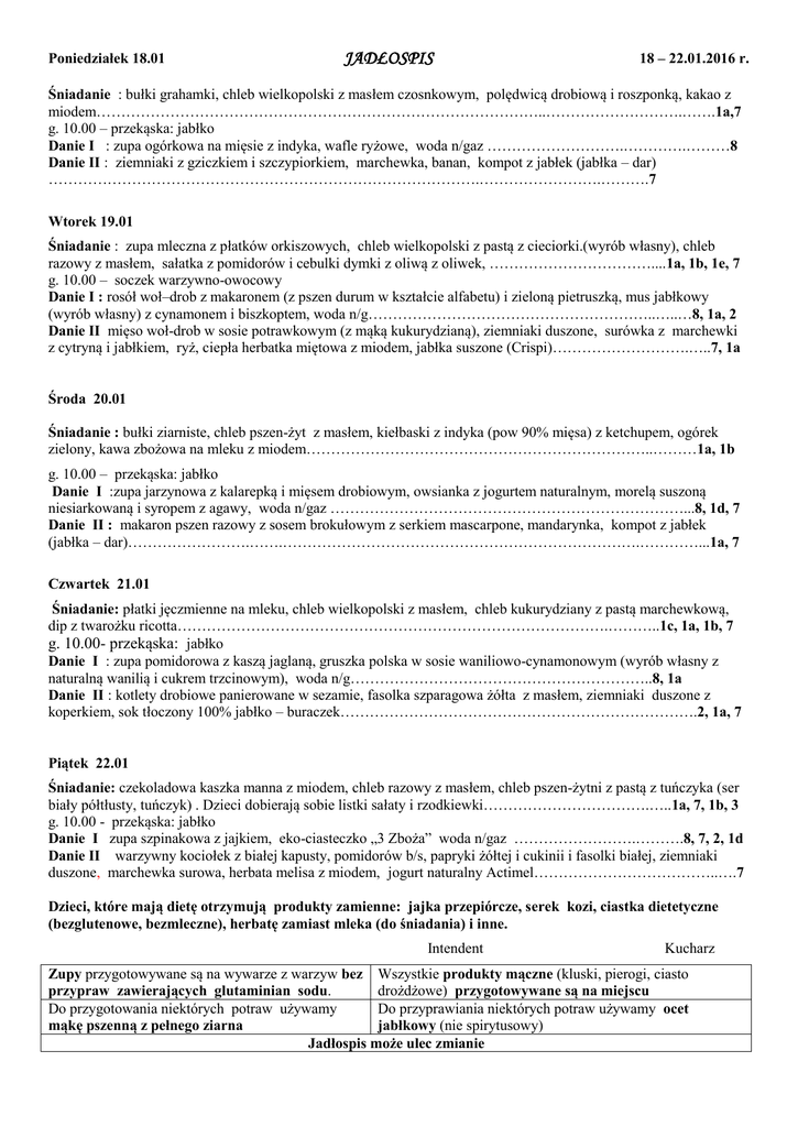 Poniedziałek 18.01 JADŁOSPIS 18 – 22.01.2016 r. Śniadanie : bułki grahamki, chleb wielkopolski z masłem czosnkowym, polędwicą drobiową i roszponką, kakao z miodem………………………………………………………………………………..……………………….…….1a,7 g. 10.00 – przekąska: jabłko Danie I : zupa ogórkowa na mięsie z indyka, wafle ryżowe, woda n/gaz ……………………….………….………8 Danie II : ziemniaki z gziczkiem i szczypiorkiem, marchewka, banan, kompot z jabłek (jabłka – dar) …………………………………………………………………………….…………………….……….7 Wtorek 19.01 Śniadanie : zupa mleczna z płatków orkiszowych, chleb wielkopolski z pastą z cieciorki.(wyrób własny), chleb razowy z masłem, sałatka z pomidorów i cebulki dymki z oliwą z oliwek, ……………………………....1a, 1b, 1e, 7 g. 10.00 – soczek warzywno-owocowy Danie I : rosół woł–drob z makaronem (z pszen durum w kształcie alfabetu) i zieloną pietruszką, mus jabłkowy (wyrób własny) z cynamonem i biszkoptem, woda n/g…………………………………………………..…..…8, 1a, 2 Danie II mięso woł-drob w sosie potrawkowym (z mąką kukurydzianą), ziemniaki duszone, surówka z marchewki z cytryną i jabłkiem, ryż, ciepła herbatka miętowa z miodem, jabłka suszone (Crispi)……………………….…..7, 1a Środa 20.01 Śniadanie : bułki ziarniste, chleb pszen-żyt z masłem, kiełbaski z indyka (pow 90% mięsa) z ketchupem, ogórek zielony, kawa zbożowa na mleku z miodem……………………………………………………………..………1a, 1b g. 10.00 – przekąska: jabłko Danie I :zupa jarzynowa z kalarepką i mięsem drobiowym, owsianka z jogurtem naturalnym, morelą suszoną niesiarkowaną i syropem z agawy, woda n/gaz ………………………………………………………………...8, 1d, 7 Danie II : makaron pszen razowy z sosem brokułowym z serkiem mascarpone, mandarynka, kompot z jabłek (jabłka – dar)…………………….…….……………………………………………………………….…………...1a, 7 Czwartek 21.01 Śniadanie: płatki jęczmienne na mleku, chleb wielkopolski z masłem, chleb kukurydziany z pastą marchewkową, dip z twarożku ricotta…………………………………………………………………………….………..1c, 1a, 1b, 7 g. 10.00- przekąska: jabłko Danie I : zupa pomidorowa z kaszą jaglaną, gruszka polska w sosie waniliowo-cynamonowym (wyrób własny z naturalną wanilią i cukrem trzcinowym), woda n/g……………………………………………………..8, 1a Danie II : kotlety drobiowe panierowane w sezamie, fasolka szparagowa żółta z masłem, ziemniaki duszone z koperkiem, sok tłoczony 100% jabłko – buraczek……………………………………………………………….2, 1a, 7 Piątek 22.01 Śniadanie: czekoladowa kaszka manna z miodem, chleb razowy z masłem, chleb pszen-żytni z pastą z tuńczyka (ser biały półtłusty, tuńczyk) . Dzieci dobierają sobie listki sałaty i rzodkiewki…………………………….…..1a, 7, 1b, 3 g. 10.00 - przekąska: jabłko Danie I zupa szpinakowa z jajkiem, eko-ciasteczko „3 Zboża” woda n/gaz …………………….……….8, 7, 2, 1d Danie II warzywny kociołek z białej kapusty, pomidorów b/s, papryki żółtej i cukinii i fasolki białej, ziemniaki duszone, marchewka surowa, herbata melisa z miodem, jogurt naturalny Actimel………………………………..….7 Dzieci, które mają dietę otrzymują produkty zamienne: jajka przepiórcze, serek kozi, ciastka dietetyczne (bezglutenowe, bezmleczne), herbatę zamiast mleka (do śniadania) i inne. Intendent Kucharz Zupy przygotowywane są na wywarze z warzyw bez Wszystkie produkty mączne (kluski, pierogi, ciasto przypraw zawierających glutaminian sodu. drożdżowe) przygotowywane są na miejscu Do przygotowania niektórych potraw używamy Do przyprawiania niektórych potraw używamy ocet jabłkowy (nie spirytusowy) mąkę pszenną z pełnego ziarna Jadłospis może ulec zmianie