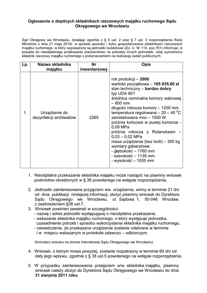 Ogłoszenie o zbędnych składnikach rzeczowych majątku ruchomego Sądu Okręgowego we Wrocławiu Sąd Okręgowy we Wrocławiu, działając zgodnie z § 6 ust. 2 oraz § 7 ust. 3 rozporządzenia Rady Ministrów z dnia 21 maja 2010r. w sprawie sposobu i trybu gospodarowania składnikami rzeczowymi majątku ruchomego, w który wyposażone są jednostki budżetowe (Dz. U. Nr 114, poz.761) informuje, iż posiada do nieodpłatnego przekazania (bezzwrotnie) na potrzeby innych jednostek, niżej wymieniony składnik rzeczowy majątku ruchomego z przeznaczeniem na realizację zadań publicznych: Lp. 1. Nazwa składnika majątku Urządzenie do dezynfekcji archiwaliów Nr inwentarzowy 2265 Opis rok produkcji – 2000 wartość początkowa – 105 835,00 zł stan techniczny – bardzo dobry typ UDA 801 średnica nominalna komory walcowej – 800 mm długość robocza komory – 1200 mm temperatura regulowana – 20 – 40 0C zainstalowana moc – 1500 W próżnia końcowa w pustej komorze 0,09 MPa próżnia robocza z Rotanoksem – 0,03 – 0,02 MPa masa urządzenia (bez butli) – 300 kg wymiary gabarytowe: - głębokość – 1760 mm - szerokość – 1135 mm - wysokość – 1935 mm 1. Nieodpłatne przekazanie składnika majątku może nastąpić na pisemny wniosek podmiotów określonych w § 38 powołanego na wstępie rozporządzenia. 2. Jednostki zainteresowane przyjęciem ww. urządzenia, winny w terminie 21 dni od dnia publikacji niniejszej informacji, złożyć pisemny wniosek do Dyrektora Sądu Okręgowego we Wrocławiu, ul. Sądowa 1, 50-046 Wrocław, z zastrzeżeniem §38 ust.7. 3. Wniosek powinien zawierać w szczególności: - nazwę i adres jednostki występującej o nieodpłatne przekazanie, - wskazanie składnika majątku ruchomego, o który występuje jednostka, uzasadnienie potrzeb i sposobu wykorzystania składnika majątku ruchomego, - oświadczenie, że przekazane urządzenie zostanie odebrane w terminie i w miejscu wskazanym w protokole zdawczo – odbiorczym. (formularz wniosku na stronie internetowej Sądu Okręgowego we Wrocławiu) 4. Wniosek, o którym mowa powyżej, zostanie rozpatrzony w terminie 60 dni od daty jego wpływu, zgodnie z § 38 ust.5 powołanego na wstępie rozporządzenia. 5. W przypadku zainteresowania przejęciem w/w składnika majątku, pisemny wniosek należy złożyć do Dyrektora Sądu Okręgowego we Wrocławiu do dnia 31 sierpnia 2011 roku. 6. Osobą upoważnioną do kontaktu w sprawie w/w składnika majątku jest: - Pan Kazimierz Jurowski – Kierownik Oddziału Gospodarczego, tel. 071/ 37-04-224, [email protected] - Pani Izabela Graczyk – Inspektor Sądu Okręgowego we Wrocławiu, tel. 071/ 37-04-294, [email protected] EEEEEEEEEE.., dnia EEEE EEEEEEEEEEEEEEEEE nazwa, siedziba i adres podmiotu występującego o nieodpłatne przekazanie składnika rzeczowego majątku ruchomego Pani (((((((((((((((. Dyrektor Sądu Okręgowego we Wrocławiu WNIOSEK o nieodpłatne przekazanie składnia rzeczowego majątku ruchomego 1. Wskazanie składnika rzeczowego majątku ruchomego, którego dotyczy niniejszy wniosek (należy podać składnik rzeczowy majątku ruchomego, który będzie podlegał przekazaniu) 2. Wskazanie sposobu przekazania wyżej wymienionego składnika rzeczowego majątku ruchomego (należy zakreślić odpowiednia pozycję) na czas oznaczony na czas nieoznaczony bez zastrzeżenia obowiązku zwrotu 3. Oświadczenie Oświadczam, że przekazany składnik rzeczowy majątku ruchomego zostanie odebrany w terminie i miejscu wskazanym w protokole zdawczo – odbiorczym. EEEEEEEEEEEE. pieczątka, podpis
