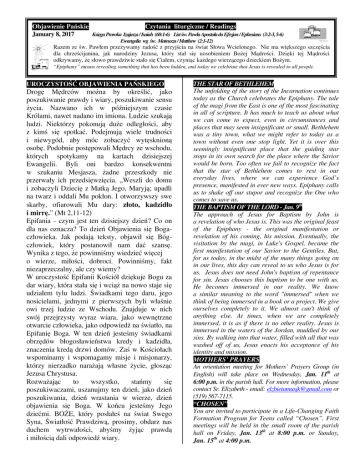 Objawienie Pańskie Czytania liturgiczne / Readings January 8, 2017 Księga Proroka Izajasza / Isaiah (60:1-6) List św. Pawła Apostoła do Efezjan / Ephesians (3:2-3, 5-6) Ewangelia wg św. Mateusza / Matthew (2:1-12) Razem ze św. Pawłem przeżywamy radość z przyjścia na świat Słowa Wcielonego. Nie ma większego szczęścia dla chrześcijanina, jak narodziny Jezusa, który stał się uosobieniem Bożej Mądrości. Dzięki tej Mądrości odkrywamy, że słowo prawdziwie stało się Ciałem, czyniąc każdego wierzącego dzieckiem Bożym. “Epiphany” means revealing something that has been hidden, and today we celebrate that Jesus is revealed to all people. UROCZYSTOŚĆ OBJAWIENIA PAŃSKIEGO Drogę Mędrców można by określić, jako poszukiwanie prawdy i wiary, poszukiwanie sensu życia. Nazwano ich w późniejszym czasie Królami, nawet nadano im imiona. Ludzie szukają ludzi. Niektórzy pokonują duże odległości, aby z kimś się spotkać. Podejmują wiele trudności i niewygód, aby móc zobaczyć wytęsknioną osobę. Podobnie postępowali Mędrcy ze wschodu, których spotykamy na kartach dzisiejszej Ewangelii. Byli oni bardzo konsekwentni w szukaniu Mesjasza, żadne przeszkody nie przerwały ich przedsięwzięcia. „Weszli do domu i zobaczyli Dziecię z Matką Jego, Maryją; upadli na twarz i oddali Mu pokłon. I otworzywszy swe skarby, ofiarowali Mu dary: złoto, kadzidło i mirrę.” (Mt 2,11-12) Epifania - czym jest ten dzisiejszy dzień? Co on dla nas oznacza? To dzień Objawienia się Bogaczłowieka. Jak podają teksty, objawił się Bógczłowiek, który postanowił nam dać szansę. Wynika z tego, że powinniśmy wiedzieć więcej o wierze, miłości, dobroci. Powinniśmy, fakt niezaprzeczalny, ale czy wiemy? W uroczystość Epifanii Kościół dziękuje Bogu za dar wiary, która stała się i wciąż na nowo staje się udziałem tylu ludzi. Świadkami tego daru, jego nosicielami, jednymi z pierwszych byli właśnie owi trzej ludzie ze Wschodu. Znajduje w nich swój przejrzysty wyraz wiara, jako wewnętrzne otwarcie człowieka, jako odpowiedź na światło, na Epifanię Boga. W ten dzień jesteśmy świadkami obrzędów błogosławieństwa kredy i kadzidła, znaczenia kredą drzwi domów. Zaś w Kościołach wspominamy i wspomagamy misje i misjonarzy, którzy nierzadko narażają własne życie, głosząc Jezusa Chrystusa. Rozważając to wszystko, stańmy się poszukiwaczami, uszanujmy ten dzień, jako dzień poszukiwania, dzień wrastania w wierze, dzień objawienia się Boga. W końcu jesteśmy Jego dziećmi. BOŻE, który posłałeś na świat Swego Syna, Światłość Prawdziwą, prosimy, obdarz nas duchem wytrwałości, abyśmy żyjąc prawdą i miłością dali odpowiedź wiary. THE STAR OF BETHLEHEM The unfolding of the story of the Incarnation continues today as the Church celebrates the Epiphany. The tale of the magi from the East is one of the most fascinating in all of scripture. It has much to teach us about what we can come to expect, even in circumstances and places that may seem insignificant or small. Bethlehem was a tiny town, what we might refer to today as a town without even one stop light. Yet it is over this seemingly insignificant place that the guiding star stops in its own search for the place where the Savior would be born. Too often we fail to recognize the fact that the star of Bethlehem comes to rest in our everyday lives, where we can experience God’s presence, manifested in ever new ways. Epiphany calls us to shake off our stupor and recognize the One who comes to save us. THE BAPTISM OF THE LORD - Jan. 9th The approach of Jesus for Baptism by John is a revelation of who Jesus is. This was the original feast of the Epiphany - the original manifestation or revelation of his coming, his mission. Eventually, the visitation by the magi, in Luke's Gospel, became the first manifestation of our Savior to the Gentiles. But, for us today, in the midst of the many things going on in our lives, this day can reveal to us who Jesus is for us. Jesus does not need John's baptism of repentance for sin. Jesus chooses this baptism to be one with us. He becomes immersed in our reality. We know a similar meaning to the word "immersed" when we think of being immersed in a book or a project. We give ourselves completely to it. We almost can't think of anything else. At times, when we are completely immersed, it is as if there is no other reality. Jesus is immersed in the waters of the Jordan, muddied by our sins. By walking into that water, filled with all that was washed off of us, Jesus enacts his acceptance of his identity and mission. MOTHERS’ PRAYERS An orientation meeting for Mothers’ Prayers Group (in English) will take place on Wednesday, Jan. 11th at 6:00 p.m. in the parish hall. For more information, please contact Sr. Elizabeth - email: [email protected] or (519) 567-7115. “CHOSEN” You are invited to participate in a Life-Changing Faith Formation Program for Teens called “Chosen”. First meetings will be held in the small room of the parish hall on Friday, Jan. 13th at 8:00 p.m. or Sunday, Jan. 15th at 4:00 p.m.