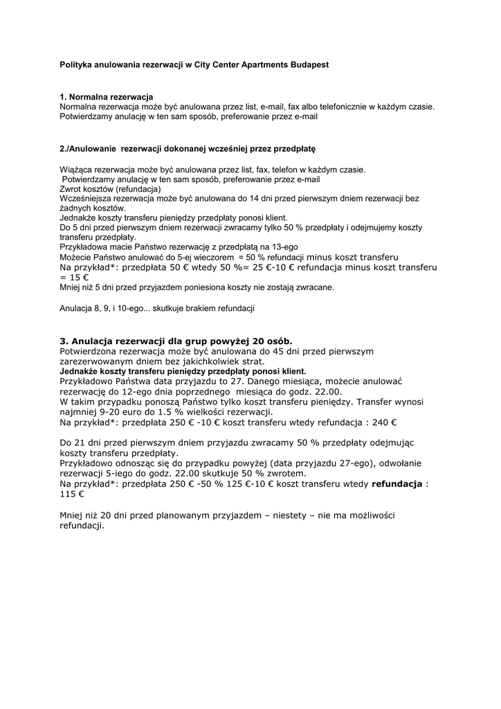 Polityka anulowania rezerwacji w City Center Apartments Budapest 1. Normalna rezerwacja Normalna rezerwacja może być anulowana przez list, e-mail, fax albo telefonicznie w każdym czasie. Potwierdzamy anulację w ten sam sposób, preferowanie przez e-mail 2./Anulowanie rezerwacji dokonanej wcześniej przez przedpłatę Wiążąca rezerwacja może być anulowana przez list, fax, telefon w każdym czasie. Potwierdzamy anulację w ten sam sposób, preferowanie przez e-mail Zwrot kosztów (refundacja) Wcześniejsza rezerwacja może być anulowana do 14 dni przed pierwszym dniem rezerwacji bez żadnych kosztów. Jednakże koszty transferu pieniędzy przedpłaty ponosi klient. Do 5 dni przed pierwszym dniem rezerwacji zwracamy tylko 50 % przedpłaty i odejmujemy koszty transferu przedpłaty. Przykładowa macie Państwo rezerwację z przedpłatą na 13-ego Możecie Państwo anulować do 5-ej wieczorem = 50 % refundacji minus koszt transferu Na przykład*: przedpłata 50 € wtedy 50 %= 25 €-10 € refundacja minus koszt transferu = 15 € Mniej niż 5 dni przed przyjazdem poniesiona koszty nie zostają zwracane. Anulacja 8, 9, i 10-ego... skutkuje brakiem refundacji 3. Anulacja rezerwacji dla grup powyżej 20 osób. Potwierdzona rezerwacja może być anulowana do 45 dni przed pierwszym zarezerwowanym dniem bez jakichkolwiek strat. Jednakże koszty transferu pieniędzy przedpłaty ponosi klient. Przykładowo Państwa data przyjazdu to 27. Danego miesiąca, możecie anulować rezerwację do 12-ego dnia poprzednego miesiąca do godz. 22.00. W takim przypadku ponoszą Państwo tylko koszt transferu pieniędzy. Transfer wynosi najmniej 9-20 euro do 1.5 % wielkości rezerwacji. Na przykład*: przedpłata 250 € -10 € koszt transferu wtedy refundacja : 240 € Do 21 dni przed pierwszym dniem przyjazdu zwracamy 50 % przedpłaty odejmując koszty transferu przedpłaty. Przykładowo odnosząc się do przypadku powyżej (data przyjazdu 27-ego), odwołanie rezerwacji 5-iego do godz. 22.00 skutkuje 50 % zwrotem. Na przykład*: przedpłata 250 € -50 % 125 €-10 € koszt transferu wtedy refundacja : 115 € Mniej niż 20 dni przed planowanym przyjazdem – niestety – nie ma możliwości refundacji.
