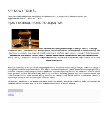 KPP NOWY TOMYŚL Źródło: http://www.nowy-tomysl.policja.gov.pl/w15/prewencja/75120,Pijany-uciekal-przed-policjantami.html Wygenerowano: Wtorek, 7 marca 2017, 16:07 PIJANY UCIEKAŁ PRZED POLICJANTAMI Przez kilkaset metrów policyjny patrol ścigał 56-letniego kierowcę osobowego znajdującego się na „podwójnym gazie”. Siedzący za jego kierownicą mężczyzna nie zatrzymał się do kontroli drogowej. Zbyt duża brawura, adrenalina oraz desperacja zmusiły mężczyznę do wjechania w pole uprawne a następnie do kontynuowania swojej dalszej ucieczki przed stróżami prawa na piechotę. Powód ucieczki zdesperowanego mężczyzny funkcjonariusze poznali od razu po zatrzymaniu - kierowca miał ponad pół promila. Teraz za swój kompletny brak odpowiedzialności poniesie surowe konsekwencje. Wczoraj o godzinie 19:20 Policjanci Ruchu Drogowego Komendy Powiatowej Policji w Nowym Tomyślu postanowili zatrzymać do rutynowej kontroli w miejscowości Nowa Wieś Zbąska pojazd m-ki Opel Zafira. Jednak kierowca osobowego Opla widząc podawane przez mundurowych sygnały świetlne gwałtownie przyśpieszył próbując im uciec. Po przejechaniu kilkuset metrów drogą gruntową 56-latek został zmuszony do dalszej ucieczki na piechotę, gdyż po wjechaniu w pole uprawne jego samochód odmówił mu posłuszeństwa. Pościg zakończył się chwilę później. Wynik badania na zawartość alkoholu w wydychanym powietrzu wykazał u mężczyzny ponad pół promila. Już niebawem odpowie on za kierowanie pojazdem w stanie nietrzeźwości oraz niezatrzymanie się do kontroli drogowej. Za swoją bezmyślność i brawurę grozi mu do 2 lat pozbawienia wolności oraz wysoka grzywna. Ocena: 0/5 (0) Tweetnij