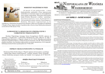 NR 47 WARSZTATYMAŁŻEŃSKIEWPISZU W dniach 27-28 paź dziernika , s.Anna Małdrzykowska- pallotynka z Pisza, zaprasza pary małż eń skienawarsztatymającenacelupogłębienie więzimiędzymałż onkami.Warsztatypoprowadzą: ksiądz Wiesław Błaszczak z Lublina – psycholog i p s y c h o t e r a p e u t a o r a z m a ł ż e ń s t w o z czternastoletnimstaż em:JustynaiPawełKopyccyz R a d o m i a . Wa r s z t a t y o r g a n i z o wa n e s ą w e wspó łpracyzWydziałemDuszpasterstwaRodzinwEłkuorazOś rodkiemProfilaktyki iTerapiiwPiszu.Zapisydodnia14paź dziernikauSiostryAnnyMałdrzykowskiejpod nrtel.665615483.Koszt170zł. ZAPROSZENIE NA REKOLEKCJE O PRZEBACZENIU I UZDROWIENIU POKOLENIOWYM Dyrektor Wigierskiego Areopagu Nowej Ewangelizacji (WANE) zaprasza na rekolekcje o Przebaczeniu i Uzdrowieniu Pokoleniowym, które odbywać się będą w Pokamedulskim Klasztorze w Wigrach w dniach 16-18.11.2012r. Rekolekcje prowadzone będą przez Wspólnotę Odnowy w Duchu Świętym Getsemani z Suwałk. Więcej informacji, program rekolekcji, oraz formularz zgłoszeniowy na stronie internetowej: www.wigry.pro , Informacje można również uzyskać pod nr tel. 87 566 24 99. IMPREZY OKOLICZNOŚCIOWE NA WIGRACH Restauracja Domu Królewskiego w Wigrach zaprasza do korzystania z szerokiego rodzaju usług: imprezy okolicznościowe - urodziny, imieniny, Chrzty, I Komunie Święte, konferencje, przyjęcia weselne, itp. Kontakt: www.wigry.pro, tel. 87 566 24 99 Ofiarynautrzymanie PokamedulskiegoKlasztoruw Wigrachmoż naprzekazać wpłacającnakontoWigierskiego AreopaguNowejEwangelizacji Wigry11,16-400Suwałki. Nrrachunku:831020 13320000110207156476 KSIĘŻA PRACUJĄCY W PARAFII Proboszcz:Wikariusz: Ks. Dariusz Rogiński Wszystkimparafianomigoś ciomż ycząmiłegotygodniowego wypoczynku. Zapraszamy na stronę: 4 Ks. Tadeusz Krzywiński www.wigry.pro www.wigry.kuria.elk.pl NIEPOKALANA ZE WZGÓRZA WIGIERSKIEGO BIULETYN INFORMACYJNY PARAFII P.W. NIEPOKALANEGO POCZĘCIA NMP W WIGRACH I WIGIERSKIEGO AREOPAGU NOWEJ EWANGELIZACJI REDAKCJA: WWW.WIGRY.PRO 14 PAŹDZIERNIKA 2012 ROKU JAN PAWEŁ II – PAPIEŻ RODZINY ListEpiskopatuPolski(fragmenty) UmiłowaniwChrystusiePanuBraciaiSiostry! WtymrokubłogosławionyJanPawełIIzapraszanasdopochyleniasięnad chrześ cijań skąprawdąorodzinie.Refleksjanadrodzinąjestbowiemnajważ niejszą sprawąwkontekś cieprzemianekonomiczno-ideowychwewspó łczesnymś wiecie, któ re często prowadzą do negowania wartoś ci małż eń stwa i rodziny, marginalizowania czy nawet wyś miewania małż eń stwa jako nierozerwalnego związku męż czyzny i kobiety. W publikacjach książ kowych, w popularnych czasopismach,wprogramachradiowychitelewizyjnychpojawiająsiętreś ciś wiadcząceopogardziedlarodziny. Rodzinychrześ cijań skiepoddawanesąwpływomprądó wmyś lowych„nowegowieku”(NewAge)iostatnio bardzomodnejideologiigender,któ razacieraró ż nicepomiędzymęż czyznąikobietą.Naszerodzinyprzeż ywają zagubienieorazwątpliwoś ciwodniesieniudopodstawowegoznaczeniaż yciamałż eń skiegoirodzinnego.Na nowopojawiająsiępró bypodważ aniaprawdyorodzinieiwprowadzenia„związkó wpartnerskich”wmiejsce małż eń stwarozumianegojakojednoś ćmęż czyznyikobiety. Zbliż ającysięDzień Papieskistwarzaokazjędozastanowieniasięnadrodziną,nadjejistotąimisjąwe wspó łczesnymś wiecie.Rodzina–jakpisałOjciecSwiętywAdhortacjiFamiliarisconsortio–jestznakiemnadziei dlawspó łczesnegoś wiata,zniejbowiemwywodząsięprzyszłepokolenia,któ reprzekazująwiaręwjedynego Bogaiobjawiająwpełnimiłoś ćJezusaChrystusa,naszegoPanaiOdkupiciela,doczłowieka…….. DrodzyBraciaiSiostry! Wsytuacjikryzysukulturowegoiideowegobudząnaszniepokó jwszystkieatakinarodzinęipró by przedefiniowaniapojęciarodzinyjakoluź negozwiązku.Przejawamitegokryzysusą:osłabieniewięzirodzinnej, przeró ż nepatologierodzinne,plagarozwodó w,takzwane„luź ne”czy„wolne”związkipraktykowanejuż od młodoś ci,częstozazgodąrodzicó w,orazbrak otwarciamałż onkó wnadarż ycia.Obserwujemytakż ecoraz większeprzyzwoleniespołecznenateniewłaś ciwezjawiskaiczęstobrakjakiejkolwiekreakcjizestronybliskich osó b. Zjawiskatepowodująwkonsekwencjiwspomnianykryzysrodzinyipoważ neproblemydemograficzne. EpiskopatPolskizesmutkiemprzyjąłinformację,ż ePolskawdziedzinieprzyrostunaturalnegospadłana209. pozycjęspoś ró dwszystkich222pań stwś wiata.Zjawiskotonosiznamionaprawdziwejkatastrofy.Polskana naszychoczachstarzejesię,awmłodychrodzinachczęstopojawiasiętylkojednodzieckoalborezygnujesięw ogó lezpotomstwa.PolskiedziecirodząsięnatomiastwkrajachZachodu,ponieważ tamrodziceznajdująlepsze warunkimaterialnedlaichwychowania. Jednązkonsekwencjikryzysudemograficznegojestró wnież wydłuż eniewiekuemerytalnego,któ renie likwidujeprzyczynzaistniałejsytuacji,ajedyniepró bujewalczyć zeskutkami.Trzebabezzwłocznieposzukać prawdziwychprzyczyn wspomnianego kryzysu i znaleź ć odpowiednie rozwiązanie problemu. Nasze działania powinny cechować mądroś ć i dalekosięż na perspektywa. Potrzebne jest szanujące i wspierające rodzinę,szczegó lniewielodzietną,ustawodawstwoorazpomocsamorządó wlokalnych…… Całoś ćnastroniewww.diecezjaelk.pl Podpisali:PasterzeKoś ciołakatolickiegowPolsce obecnina358.ZebraniuPlenarnym KonferencjiEpiskopatuPolskiweWrocławiu wdniu23czerwca2012r. 1 KALENDARIUM LITURGICZNE 14.10. – Niedziela XXVIII Niedziela Zwykła. Dzień Papieski. 15.10. – Poniedziałek Wspomnienie Św. Teresy z Avila od Jezusa, Dziewicy i Doktora Kościoła.. 16.10. – Wtorek Wspomnienie Św. Jadwigi Śląskiej. Rocznica wyboru kard. Karola Wojtyły na Stolicę Piotrową. 17.10. – Środa Wspomnienie Św. Ignacego Antiocheńskiego, Biskupa i Męczennika. 18.10. – Czwartek Święto Św. Łukasza Ewangelisty. Patrona Pracowników Służby Zdrowia. 19.10. – Piątek XXVIII Rocznica Męczeńskiej Śmierci Bł. Ks. Jerzego Popiełuszki. 20.10. - Sobota Wspomnienie Ś