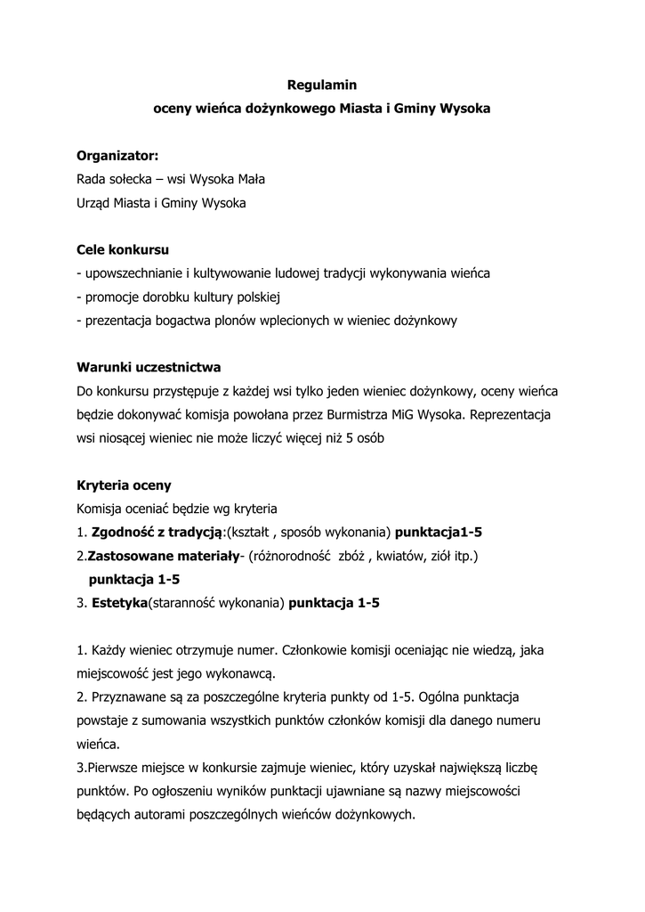 Regulamin oceny wieńca dożynkowego Miasta i Gminy Wysoka