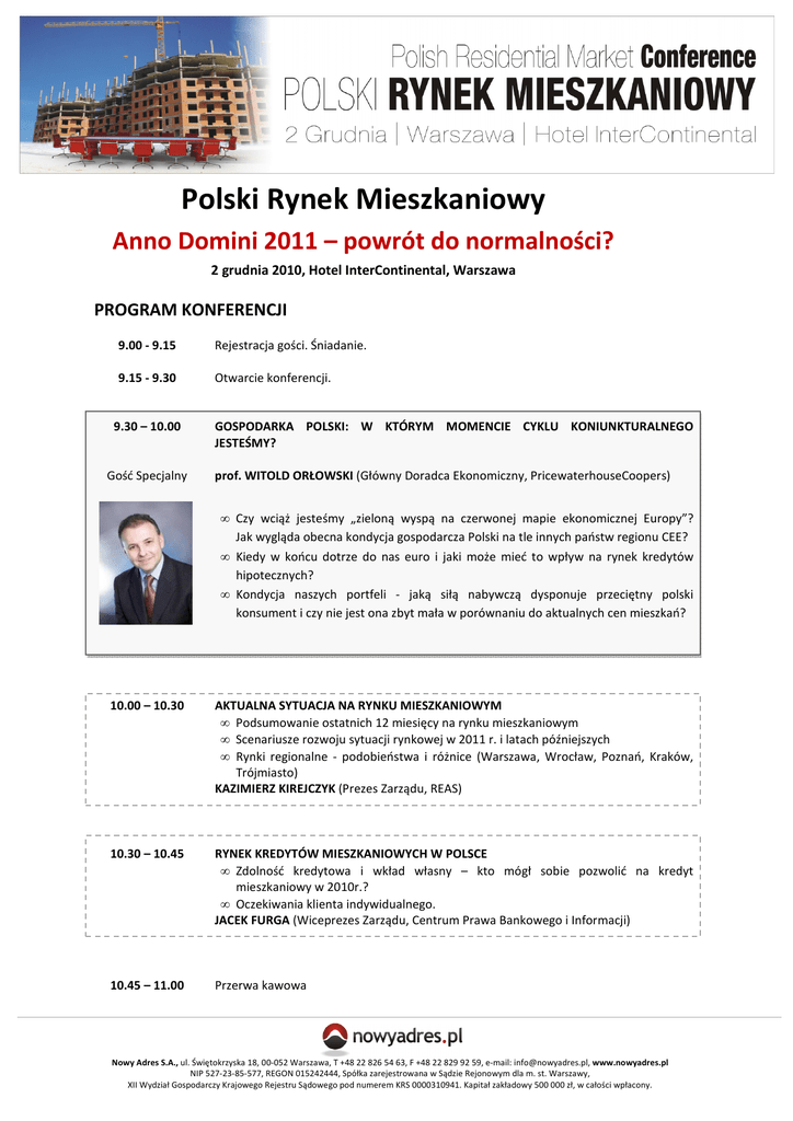Polski Rynek Mieszkaniowy Anno Domini 2011 – powrót do normalności? 2 grudnia 2010, Hotel InterContinental, Warszawa PROGRAM KONFERENCJI 9.00 - 9.15 Rejestracja gości. Śniadanie. 9.15 - 9.30 Otwarcie konferencji. 9.30 – 10.00 Gość Specjalny GOSPODARKA POLSKI: W KTÓRYM MOMENCIE CYKLU KONIUNKTURALNEGO JESTEŚMY? prof. WITOLD ORŁOWSKI (Główny Doradca Ekonomiczny, PricewaterhouseCoopers) • Czy wciąż jesteśmy „zieloną wyspą na czerwonej mapie ekonomicznej Europy”? Jak wygląda obecna kondycja gospodarcza Polski na tle innych państw regionu CEE? • Kiedy w końcu dotrze do nas euro i jaki może mieć to wpływ na rynek kredytów hipotecznych? • Kondycja naszych portfeli - jaką siłą nabywczą dysponuje przeciętny polski konsument i czy nie jest ona zbyt mała w porównaniu do aktualnych cen mieszkań? 10.00 – 10.30 AKTUALNA SYTUACJA NA RYNKU MIESZKANIOWYM • Podsumowanie ostatnich 12 miesięcy na rynku mieszkaniowym • Scenariusze rozwoju sytuacji rynkowej w 2011 r. i latach późniejszych • Rynki regionalne - podobieństwa i różnice (Warszawa, Wrocław, Poznań, Kraków, Trójmiasto) KAZIMIERZ KIREJCZYK (Prezes Zarządu, REAS) 10.30 – 10.45 RYNEK KREDYTÓW MIESZKANIOWYCH W POLSCE • Zdolność kredytowa i wkład własny – kto mógł sobie pozwolić na kredyt mieszkaniowy w 2010r.? • Oczekiwania klienta indywidualnego. JACEK FURGA (Wiceprezes Zarządu, Centrum Prawa Bankowego i Informacji) 10.45 – 11.00 Przerwa kawowa Nowy Adres S.A., ul. Świętokrzyska 18, 00-052 Warszawa, T +48 22 826 54 63, F +48 22 829 92 59, e-mail: [email protected], www.nowyadres.pl NIP 527-23-85-577, REGON 015242444, Spółka zarejestrowana w Sądzie Rejonowym dla m. st. Warszawy, XII Wydział Gospodarczy Krajowego Rejestru Sądowego pod numerem KRS 0000310941. Kapitał zakładowy 500 000 zł, w całości wpłacony. 11.00 – 12.00 POWRÓT DO NORMALNOŚCI? PIERWOTNY I WTÓRNY RYNEK MIESZKAŃ I DOMÓW Po wznowieniu akcji kredytowej przez banki klienci wrócili do biur sprzedaży deweloperów i do agencji nieruchomości, lecz wciąż mamy do czynienia ze zjawiskiem nadpodaży na rynku pierwotnym. Niemniej jednak różnica między podażą i popytem nie jest już tak wielka, jak choćby rok temu – czy możemy już ogłosić powrót do rynkowej normalności? • Podsumowanie ostatnich 12 miesięcy na rynku mieszkaniowym: nadpodaż lokali i dostosowywanie oferty do potrzeb rynkowych • Ceny produktów: mieszkania i domy najbardziej narażone na obniżki cen • Rynki regionalne – już po kryzysie, czy jeszcze w jego trakcie? • Najem mieszkań – czy wprowadzenie instytucji najmu okazjonalnego uzdrowiło ten segment rynkowy? Moderator Paneliści MAREK WIELGO (Gazeta Wyborcza) MARIUSZ KANIA (Prezes Zarządu, Metrohouse), KAZIMIERZ KIREJCZYK (Prezes Zarządu, REAS), MAREK PIRSZTUK (Dyrektor Zarządzający, Invest Komfort), MAŁGORZATA PUCHYŁA (Wiceprezes UWI Inwestycje), MAURIZIO SANGALLI (Dyrektor Sprzedaży, Verona Building) 12.00 – 12.40 CZEGO OCZEKUJĄ I CO PLANUJĄ KLIENCI NA KRAJOWYM RYNKU MIESZKANIOWYM? Czwarta edycja badań „Polski Rynek Mieszkaniowy – Popyt i Preferencje Nabywców”, przeprowadzanych wspólnie z niezależnym instytutem badawczym odpowie nie tylko jak obecnie kształtuje się deklarowany popyt na nieruchomości mieszkaniowe, ale podsumuje również mieszkaniowe zakupy Polaków w 2010 r. Na podstawie poprzednich edycji badań wskazane zostaną najważniejsze trendy rynkowe w latach 2007-2010. Jakie mieszkania i domy Polacy będą kupować w 2011 r.? W jaki sposób chcą sfinansować swoje zakupy? Jakie poziomy cenowe potencjalni nabywcy są w stanie zaakceptować? • Mieszkania, domy, działki – popyt w poszczególnych segmentach rynku • Najczęściej kupowane nieruchomości w latach 2007-2010 – analiza • Z jakich źródeł finansowane były te zakupy? • Preferencje dotyczące lokalizacji inwestycji w Warszawie, Trójmieście, Wrocławiu, Poznaniu i Krakowie. KATARZYNA CYPRYNOWSKA (Prezes Zarządu, Nowy Adres), MARCELIN MATUSIAK (Business Development Manager, Construction - B2B Research & Consulting, GfK Polonia) 12.40 – 14.00 Lunch Nowy Adres S.A., ul. Świętokrzyska 18, 00-052 Warszawa, T +48 22 826 54 63, F +48 22 829 92 59, e-mail: [email protected], www.nowyadres.pl NIP 527-23-85-577, REGON 015242444, Spółka zarejestrowana w Sądzie Rejonowym dla m. st. Warszawy, XII Wydział Gospodarczy Krajowego Rejestru Sądowego pod numerem KRS 0000310941. Kapitał zakładowy 500 000 zł, w całości wpłacony. 14.00 – 14.15 PRZY MINISTERIALNYM STOLE – CO W OBECNEJ DEKADZIE POWINIEN ZROBIĆ RZĄD, ABY POLAKOM MIESZKAŁO SIĘ LEPIEJ? Polska polityka mieszkaniowa doświadczyła znaczących przemian w ciągu pierwszych dwóch dekad okresu transformacji. Odpowiedzialność polityczna za politykę mieszkaniową została w dużym stopniu przerzucona na samorządy terytorialne, zaś ich indolencja w tym zakresie była traktowana przez kolejne rządy i parlamenty jako drugorzędny problem. W praktyce w oczach społeczeństwa za budownictwo mieszkaniowe w miastach odpowiadają deweloperzy. Obecna sytuacja finansów publicznych, ograniczenia rynku kredytowego oraz ogólne spowolnienie gospodarcze stawia pod znakiem zapytania możliwość znaczących działań sektora publicznego w zakresie budownictwa niewłasnościowego i wspierania sektora deweloperskiego. Czy istnieją realne możliwości zwiększenia z jednej strony skali budownictwa, a z drugiej – dostępności nowych mieszkań? Jakie powinny być priorytety polityki państwa w obecnej dekadzie? dr WŁADYSŁAW JAN BRZESKI (Partner, REAS) 14.15 – 15.00 Moderator Paneliści PRZY MINISTERIALNYM STOLE – DYSKUSJA dr WŁADYSŁAW JAN BRZESKI (Partner, REAS) ANDRZEJ AUMILLER (Minister Budownictwa 2006-2007), MIROSŁAW BARSZCZ (Minister Budownictwa 2007), MAREK BRYX (Urząd Mieszkalnictwa i Rozwoju Miast, Wiceminister Infrastruktury 2001-2003), SŁAWOMIR NAJNIGIER (Prezes Urzędu Mies