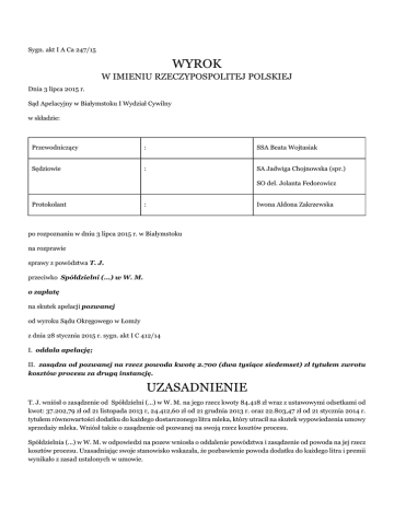 Sygn. akt I A Ca 247/15 WYROK W IMIENIU RZECZYPOSPOLITEJ POLSKIEJ Dnia 3 lipca 2015 r. Sąd Apelacyjny w Białymstoku I Wydział Cywilny w składzie: Przewodniczący : SSA Beata Wojtasiak Sędziowie : SA Jadwiga Chojnowska (spr.) SO del. Jolanta Fedorowicz Protokolant : Iwona Aldona Zakrzewska po rozpoznaniu w dniu 3 lipca 2015 r. w Białymstoku na rozprawie sprawy z powództwa T. J. przeciwko Spółdzielni (...) w W. M. o zapłatę na skutek apelacji pozwanej od wyroku Sądu Okręgowego w Łomży z dnia 28 stycznia 2015 r. sygn. akt I C 412/14 I. oddala apelację; II. zasądza od pozwanej na rzecz powoda kwotę 2.700 (dwa tysiące siedemset) zł tytułem zwrotu kosztów procesu za drugą instancję. UZASADNIENIE T. J. wniósł o zasądzenie od Spółdzielni (...) w W. M. na jego rzecz kwoty 84.418 zł wraz z ustawowymi odsetkami od kwot: 37.202,79 zł od 21 listopada 2013 r, 24.412,60 zł od 21 grudnia 2013 r. oraz 22.803,47 zł od 21 stycznia 2014 r. tytułem równowartości dodatku do każdego dostarczonego litra mleka, który utracił na skutek wypowiedzenia umowy sprzedaży mleka. Wniósł także o zasądzenie od pozwanej na swoją rzecz kosztów procesu. Spółdzielnia (...) w W. M. w odpowiedzi na pozew wniosła o oddalenie powództwa i zasądzenie od powoda na jej rzecz kosztów procesu. Uzasadniając swoje stanowisko wskazała, że pozbawienie powoda dodatku do każdego litra i premii wynikało z zasad ustalonych w umowie. Wyrokiem z dnia 28 stycznia 2015 r. Sąd Okręgowy w Łomży uwzględnił w całości żądanie pozwu. Zasądził też od pozwanej na rzecz powoda kwotę 7.838 zł tytułem zwrotu kosztów procesu. Orzeczenie to zapadło w oparciu o następujące ustalenia faktyczne. W dniu 18 stycznia 2013 r. między Spółdzielnią (...) w W. M. a T. J. zawarta została umowa sprzedaży mleka surowego. Powód nie wstąpił do pozwanej spółdzielni w charakterze członka. Zgodnie z punktem 6 umowy cena mleka ustalana była przez Zarząd Spółdzielni (...), zmiana ceny mleka mogła następować w okresie comiesięcznym, informacja w przypadku zmiany ceny przekazywana miała być w formie SMS do ostatniego dnia danego miesiąca. W punkcie 23 umowy wskazano, że każda ze stron ma prawo rozwiązać umowę za wypowiedzeniem ze skutkiem na koniec danego roku kalendarzowego, w którym oświadczenie o wypowiedzeniu zostało doręczone drugiej stronie, z zastrzeżeniem, iż doręczenie wypowiedzenia nie może nastąpić później niż do 30 września danego roku kalendarzowego; zerwanie przez sprzedającego warunków umowy w trybie wypowiedzenia powoduje obciążenie sprzedającego karą umowną w wysokości trzymiesięcznej wypłaty (brutto) za mleko sprzedane przez producenta jako suma z ostatnich trzech miesięcy (...). W tym samym dniu, w zakresie punktu 23, sporządzono aneks do umowy, zgodnie z którym każda ze stron ma prawo do rozwiązania umowy - w formie pisemnej - za wypowiedzeniem ze skutkiem na koniec danego roku kalendarzowego, w którym oświadczenie zostało doręczone drugiej stronie, z tym że doręczenie to mogło nastąpić nie później niż do 30 dnia września danego roku kalendarzowego. Zapisano, że rozwiązanie umowy w tym trybie skutkuje brakiem obowiązku zapłaty jakiejkolwiek kary umownej; niedochowanie powyższego trybu i formy rozwiązania umowy przez rolnika (sprzedającego), powoduje obciążenie go karą umowną w wysokości trzymiesięcznej wypłaty za mleko sprzedane do Spółdzielni przez rolnika (sprzedającego), liczonej jako suma z ostatnich trzech miesięcy. Od lutego 2013 r. powód dostarczał pozwanej Spółdzielni wyprodukowane w swoim gospodarstwie mleko, a pozwana dokonywała zapłaty za mleko. W czasie trwania umowy w Spółdzielni obowiązywał cennik ustalany comiesięcznie zarządzeniem wewnętrznym przez Prezesa Spółdzielni (...). Zgodnie z zarządzeniem nr 70 z 22 lipca 2013 r. ustalono cenę mleka na miesiąc lipiec ze wskazaniem, że „dodatkowa premia dla wszystkich dostawców - 0,37 zł/l, dodatkowo za miesiąc lipiec 0,05 zł/l". Zgodnie zaś z zarządzeniem nr 74 z 7 sierpnia 2013 r. ustalono cenę mleka na miesiąc sierpień ze wskazaniem, że „dodatkowa premia dla wszystkich dostawców - 0,37 zł/l (nie obowiązuje w okresie wypowiedzenia), dodatkowo za miesiąc sierpień 0,09 zł/l (nie obowiązuje w okresie wypowiedzenia)". Zastrzeżenie, że dodatkowa premia nie obowiązuje w okresie wypowiedzenia wprowadzone zostało dopiero w zarządzeniu dotyczącym sierpnia 2013 r. Na cenę 1 litra mleka wpływ miały parametry jakościowe (jednostka tłuszczu i białka), a nadto dopłaty i potrącenia oraz dodatkowe premie dla wszystkich dostawców. T. J. dostarczył pozwanej w 2013 r. następujące ilości mleka surowego: luty - 86.185 litrów o wartości 118.118,06 zł, marzec - 98.119 litrów o wartości 146.706,20 zł, kwiecień - 85.498 litrów o wartości 122.441,44 zł, maj - 85.593 litrów o wartości 117.188,21 zł, czerwiec - 78.615 litrów o wartości 115.735,24 zł, lipiec - 83.369 litrów o wartości 126.384,29 zł, sierpień - 76.956 litrów o wartości 121.560,52 zł, wrzesień - 72.693 litrów o wartości 105.329,90 zł. W dniu 2 sierpnia 2013 r. powód złożył pozwanej Spółdzielni wypowiedzenie umowy z uwagi na zbyt niską cenę mleka. W kolejnych miesiącach 2013 r. dostarczał Spółdzielni mleko zgodnie z umową - w październiku 69.473 litrów o wartości 104.674,98 zł, w listopadzie 65.980 litrów o wartości 101.832,19 zł, w grudniu 61.631 litrów o wartości 93.941,77 zł. W następstwie wypowiedzenia umowy pozwana Spółdzielnia pozbawiła powoda za dostarczane w okresie wypowiedzenia mleko premii (dodatku) do każdego litra mleka łącznie w kwotach: 37.202,79 zł za październik, 24.412,60 zł za listopad oraz 22.803,47 zł za grudzień. W Spółdzielni (...) obowiązywała praktyka prowadzenia przez Spółdzielnię całej dokumentacji związanej z dostawami mleka. Powód otrzymywał od pozwa