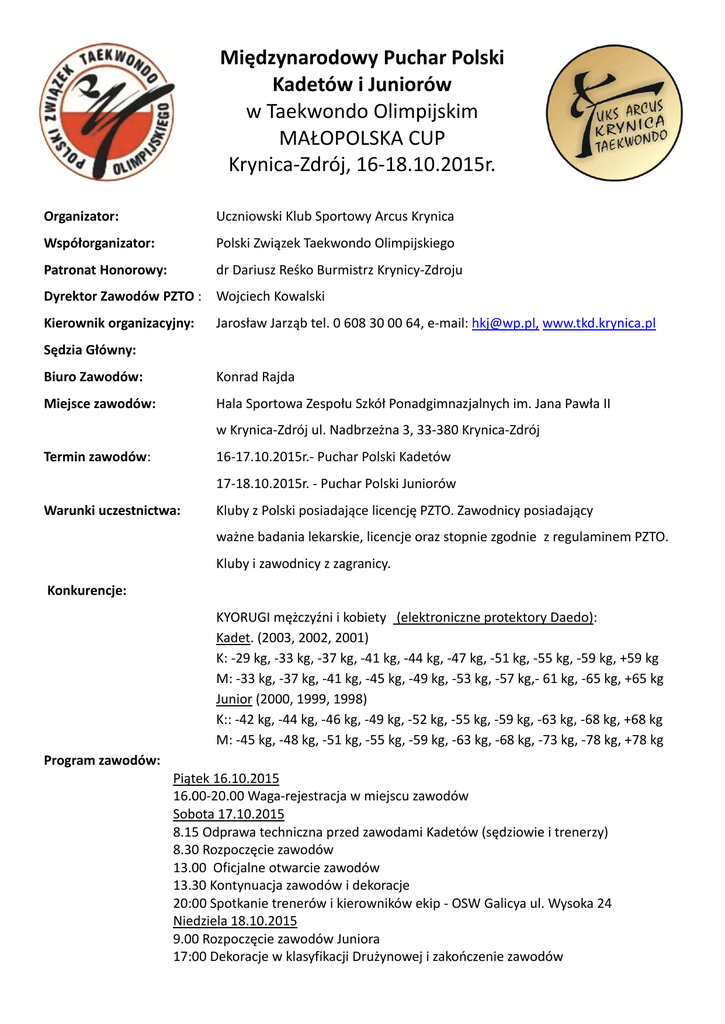 Międzynarodowy Puchar Polski Kadetów i Juniorów w Taekwondo Olimpijskim MAŁOPOLSKA CUP Krynica-Zdrój, 16-18.10.2015r. Organizator: Uczniowski Klub Sportowy Arcus Krynica Współorganizator: Polski Związek Taekwondo Olimpijskiego Patronat Honorowy: dr Dariusz Reśko Burmistrz Krynicy-Zdroju Dyrektor Zawodów PZTO : Wojciech Kowalski Kierownik organizacyjny: Jarosław Jarząb tel. 0 608 30 00 64, e-mail: [email protected], www.tkd.krynica.pl Sędzia Główny: Biuro Zawodów: Konrad Rajda Miejsce zawodów: Hala Sportowa Zespołu Szkół Ponadgimnazjalnych im. Jana Pawła II w Krynica-Zdrój ul. Nadbrzeżna 3, 33-380 Krynica-Zdrój Termin zawodów: 16-17.10.2015r.- Puchar Polski Kadetów 17-18.10.2015r. - Puchar Polski Juniorów Warunki uczestnictwa: Kluby z Polski posiadające licencję PZTO. Zawodnicy posiadający ważne badania lekarskie, licencje oraz stopnie zgodnie z regulaminem PZTO. Kluby i zawodnicy z zagranicy. Konkurencje: KYORUGI mężczyźni i kobiety (elektroniczne protektory Daedo): Kadet. (2003, 2002, 2001) K: -29 kg, -33 kg, -37 kg, -41 kg, -44 kg, -47 kg, -51 kg, -55 kg, -59 kg, +59 kg M: -33 kg, -37 kg, -41 kg, -45 kg, -49 kg, -53 kg, -57 kg,- 61 kg, -65 kg, +65 kg Junior (2000, 1999, 1998) K:: -42 kg, -44 kg, -46 kg, -49 kg, -52 kg, -55 kg, -59 kg, -63 kg, -68 kg, +68 kg M: -45 kg, -48 kg, -51 kg, -55 kg, -59 kg, -63 kg, -68 kg, -73 kg, -78 kg, +78 kg Program zawodów: Piątek 16.10.2015 16.00-20.00 Waga-rejestracja w miejscu zawodów Sobota 17.10.2015 8.15 Odprawa techniczna przed zawodami Kadetów (sędziowie i trenerzy) 8.30 Rozpoczęcie zawodów 13.00 Oficjalne otwarcie zawodów 13.30 Kontynuacja zawodów i dekoracje 20:00 Spotkanie trenerów i kierowników ekip - OSW Galicya ul. Wysoka 24 Niedziela 18.10.2015 9.00 Rozpoczęcie zawodów Juniora 17:00 Dekoracje w klasyfikacji Drużynowej i zakooczenie zawodów Nagrody: Medale za miejsca I-III, dyplomy dla wszystkich uczestników. Puchary za miejsca I-V drużynowo Punktacja : Drużynowa: 1miejsce -5pkt, 2-miejsce-3pkt, 3 miejsce-1pkt Punktacja indywidualna do rankingu PZTO: zgodnie z regulaminem PZTO Zakwaterowanie i wyżywienie: Organizator nie pośredniczy w rezerwacji noclegów i wyżywienia. Sugerowane miejsca noclegowe: www.galicyakrynica.pl – Ośrodek Szkoleniowo Wypoczynkowy Galicya www.iskra-krynica.pl – Dom Wczasowy Iskra www.panorama.krynica.pl – ORW Panorama Opłaty: Opłata startowa – 60 PLN płatne do 10.10.2015r. na konto: Uczniowski Klub Sportowy Arcus Krynica ul. Nadbrzeżna 2, 33-380 Krynica-Zdrój Bank Spółdzielczy 03 8802 0002 2001 0007 3378 0001 Tytuł przelewu: Małopolska CUP – opłata startowa + nazwa Klubu Płatnośd po 10.10.2015r. lub podczas rejestracji 70zł. Oplata za zmianę kategorii wagowej podczas ważenia 30zł Zgłoszenia: Kluby zobowiązane są dokonad zgłoszenia drogą elektroniczną poprzez stronę internetową tpss.eu do dnia 10.10.2015 (limit – 350 osób) z uwagi na międzynarodową rangę imprezy proszę monitowad odpowiednio wcześnie zgłoszenie do zawodów. Uwaga: Kluby mają obowiązek ubezpieczyd zawodników. Organizatorzy nie ponoszą odpowiedzialności za nieszczęśliwe wypadki i konsekwencje wynikające z braku powyższego ubezpieczenia.