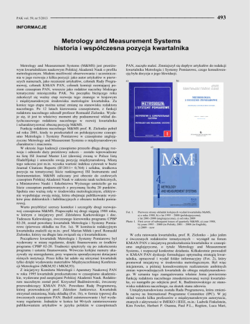 PAK vol. 59, nr 5/2013 493 INFORMACJE Metrology and Measurement Systems historia i współczesna pozycja kwartalnika Metrology and Measurement Systems (M&MS) jest prestiżowym kwartalnikiem naukowym Polskiej Akademii Nauk o profilu metrologicznym. Miałem możliwość obserwowania i uczestniczenia w jego rozwoju z kilku pozycji: jako autor artykułów w pierwszych numerach, jako recenzent artykułów, członek Rady Programowej, członek KMiAN PAN, członek komisji oceniającej poziom czasopism PAN, wreszcie jako redaktor naczelny bliskiego tematycznie miesięcznika PAK. Na początku bieżącego roku zakończył się ważny etap rozwoju tego znanego w krajowym i międzynarodowym środowisku metrologów kwartalnika. Za koniec tego etapu można uznać zmianę na stanowisku redaktora naczelnego. Po 12 latach kierowania czasopismem, z funkcji redaktora naczelnego odszedł profesor Romuald Zielonko. Wydaje się, iż jest to właściwy moment aby podsumować wkład dotychczasowego redaktora naczelnego w rozwój kwartalnika i scharakteryzować obecną pozycję M&MS. Funkcję redaktora naczelnego M&MS prof. R. Zielonko pełnił od roku 2001, kiedy to przekształcił on polskojęzyczne czasopismo Metrologia i Systemy Pomiarowe w czasopismo anglojęzyczne Metrology and Measuremnt Systems o międzynarodowym charakterze i znaczeniu. W okresie Jego kadencji czasopismo przeszło długą drogę rozwoju i odniosło duży prestiżowy sukces – zostało wprowadzone na listę ISI Journal Master List (dawniej zwaną w Polsce listą filadelfijską) i umocniło swoją pozycję międzynarodową. Miarą tego sukcesu jest m.in. wysoka wartość indeksu cytowań w bazie Journal Citations Reports (IF/2011= 0,764) i solidna, środkowa pozycja na tematycznej liście rankingowej ISI Instruments and Instrumentation. M&MS zaliczany jest obecnie do czołowych czasopism Polskiej Akademii Nauk w zakresie nauk technicznych, a Ministerstwo Nauki i Szkolnictwa Wyższego umieściło go na liście czasopism punktowanych z przyznaną liczbą 20 punktów. Spełnia ono ważną rolę w środowisku metrologicznym, efektywnie wypełniając swoją misję, która obejmuje publikowanie wyników prac doktorskich i habilitacyjnych z obszaru techniki pomiarowej. Warto przybliżyć szerszy kontekst i szczegóły drogi rozwojowej czasopisma M&MS. Prapoczątki tej drogi sięgają 1988 roku, w którym z inicjatywy prof. Zdzisława Karkowskiego i doc. Tadeusza Kalewskiego, ówczesnego kierownika programu CPBP 02-20, został powołany kwartalnik Metrologia i Systemy Pomiarowe (pierwsza okładka na Fot. 1a). W komitecie redakcyjnym kwartalnika znaleźli się m.in.: prof. Marian Miłek i prof. Romuald Zielonko, którzy na długie lata związali się z kwartalnikiem. Początkowo kwartalnik Metrologia i Systemy Pomiarowe był wydawany w miarę regularnie, dzięki finansowaniu ze środków programu CPBP 02-20. Trudności spiętrzyły się po zakończeniu programu i ustaniu finansowania. Wówczas kolejne numery ukazywały się nieregularnie, przy wsparciu sporadycznymi dotacjami różnych instytucji. Przez kilka lat udało się utrzymać kwartalnik tylko dzięki wydawaniu materiałów Międzyuczelnianej Konferencji Metrologów (MKM,92 i MKM,93). Z inicjatywy Komitetu Metrologii i Aparatury Naukowej PAN w roku 1995 kwartalnik przekształcono w czasopismo akademickie, wydawane pod auspicjami Polskiej Akademii Nauk. Redaktorem naczelnym został prof. Krzysztof Badźmirowski, ówczesny przewodniczący KMiAN PAN. Powołano Radę Programową, której przewodniczył prof. Zdzisław Jankiewicz. Kwartalnik otrzymał zmienioną, białą okładkę (Fot. 1b), w formie typowej dla ówczesnych czasopism PAN. Budził zainteresowanie i był wydawany regularnie. Jednakże w końcu lat 90-tych zainteresowanie publikowaniem artykułów w języku polskim w czasopismach PAN, zaczęło maleć. Zmniejszył się dopływ artykułów do redakcji kwartalnika Metrologia i Systemy Pomiarowe, czego konsekwencją była decyzja o jego likwidacji. a) b) c) Fot. 1. Pierwsze strony okładek kolejnych wydań kwartalnika MaMS, a) z roku 1988, b) z lat 1995 – 2000 (polskojęzyczna), z lat 2001-2008 (anglojęzyczna), c) od roku 2009 Photo 1. First cover of subsequent issues of quarterly M&MS, a) year 1988, b) years 1995 – 2000 (in Polish), 2001 – 2008 (in English), c) 2009 – now W celu ratowania kwartalnika, prof. R. Zielonko – jako jeden z ówczesnych redaktorów tematycznych – wystąpił na forum KMiAN PAN z inicjatywą przekształcenia kwartalnika w czasopismo anglojęzyczne, o tytule Metrology and Measurement Systems, i rozpoczął konkretne działania. Kilkakrotnie prowadził w KMiAN PAN dyskusje formułujące optymalną strategię kwartalnika, opracował i wydał folder informacyjny (Fot. 2), który promował inicjatywę w środowisku metrologicznym. Był więc inicjatorem, a później konsekwentnym realizatorem ambitnych zmian wprowadzających kwartalnik do obiegu międzynarodowego. W uznaniu tego zaangażowania właśnie Jemu powierzono funkcję redaktora naczelnego zmodernizowanej wersji kwartalnika, co nastąpiło po odejściu prof. K. Badźmirowskiego ze stanowiska redaktora naczelnego, na skutek stanu zdrowia. Umiędzynarodowiona została Rada Programowa, która zmieniła nazwę na International Programme Committee (IPC). W jej skład weszło kilku profesorów o międzynarodowym autorytecie, znanych z aktywności w IMEKO i IEEE, m.in.: Ludwik Finkelstein, Kim Fowler, Herbert P. Osanna, Paul P.L., Regtien, Luca Mari, 494 Albert Weckenmann. Radzie przewodniczył prof. Z. Jankiewicz. Redakcja M&MS została przeniesiona do Politechniki Gdańskiej, Katedry Metrologii i Systemów Elektronicznych, kierowanej przez prof. R. Zielonko. Od roku 2000, przez 12 lat działalność techniczna redakcji była finansowana ze środków wypracowywanych przez Zespół Profesora i tylko w ostatnich 3 latach była wspierana dotacjami Rektora PG i Dziekana WETI. Fot. 2. Folder informacyjn