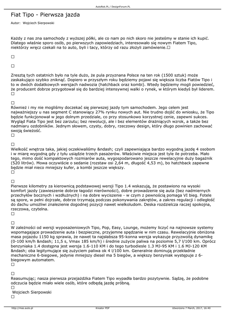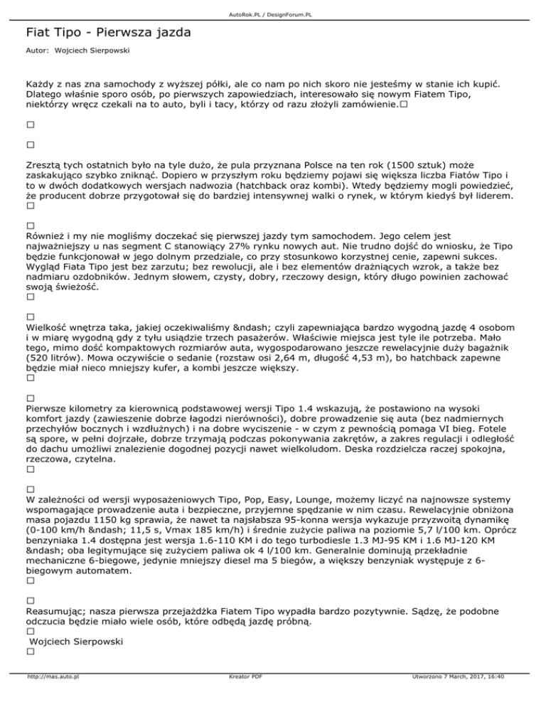 AutoRok.PL / DesignForum.PL Fiat Tipo - Pierwsza jazda Autor: Wojciech Sierpowski Każdy z nas zna samochody z wyższej półki, ale co nam po nich skoro nie jesteśmy w stanie ich kupić. Dlatego właśnie sporo osób, po pierwszych zapowiedziach, interesowało się nowym Fiatem Tipo, niektórzy wręcz czekali na to auto, byli i tacy, którzy od razu złożyli zamówienie. Zresztą tych ostatnich było na tyle dużo, że pula przyznana Polsce na ten rok (1500 sztuk) może zaskakująco szybko zniknąć. Dopiero w przyszłym roku będziemy pojawi się większa liczba Fiatów Tipo i to w dwóch dodatkowych wersjach nadwozia (hatchback oraz kombi). Wtedy będziemy mogli powiedzieć, że producent dobrze przygotował się do bardziej intensywnej walki o rynek, w którym kiedyś był liderem. Również i my nie mogliśmy doczekać się pierwszej jazdy tym samochodem. Jego celem jest najważniejszy u nas segment C stanowiący 27% rynku nowych aut. Nie trudno dojść do wniosku, że Tipo będzie funkcjonował w jego dolnym przedziale, co przy stosunkowo korzystnej cenie, zapewni sukces. Wygląd Fiata Tipo jest bez zarzutu; bez rewolucji, ale i bez elementów drażniących wzrok, a także bez nadmiaru ozdobników. Jednym słowem, czysty, dobry, rzeczowy design, który długo powinien zachować swoją świeżość. Wielkość wnętrza taka, jakiej oczekiwaliśmy – czyli zapewniająca bardzo wygodną jazdę 4 osobom i w miarę wygodną gdy z tyłu usiądzie trzech pasażerów. Właściwie miejsca jest tyle ile potrzeba. Mało tego, mimo dość kompaktowych rozmiarów auta, wygospodarowano jeszcze rewelacyjnie duży bagażnik (520 litrów). Mowa oczywiście o sedanie (rozstaw osi 2,64 m, długość 4,53 m), bo hatchback zapewne będzie miał nieco mniejszy kufer, a kombi jeszcze większy. Pierwsze kilometry za kierownicą podstawowej wersji Tipo 1.4 wskazują, że postawiono na wysoki komfort jazdy (zawieszenie dobrze łagodzi nierówności), dobre prowadzenie się auta (bez nadmiernych przechyłów bocznych i wzdłużnych) i na dobre wyciszenie - w czym z pewnością pomaga VI bieg. Fotele są spore, w pełni dojrzałe, dobrze trzymają podczas pokonywania zakrętów, a zakres regulacji i odległość do dachu umożliwi znalezienie dogodnej pozycji nawet wielkoludom. Deska rozdzielcza raczej spokojna, rzeczowa, czytelna. W zależności od wersji wyposażeniowych Tipo, Pop, Easy, Lounge, możemy liczyć na najnowsze systemy wspomagające prowadzenie auta i bezpieczne, przyjemne spędzanie w nim czasu. Rewelacyjnie obniżona masa pojazdu 1150 kg sprawia, że nawet ta najsłabsza 95-konna wersja wykazuje przyzwoitą dynamikę (0-100 km/h – 11,5 s, Vmax 185 km/h) i średnie zużycie paliwa na poziomie 5,7 l/100 km. Oprócz benzyniaka 1.4 dostępna jest wersja 1.6-110 KM i do tego turbodiesle 1.3 MJ-95 KM i 1.6 MJ-120 KM – oba legitymujące się zużyciem paliwa ok 4 l/100 km. Generalnie dominują przekładnie mechaniczne 6-biegowe, jedynie mniejszy diesel ma 5 biegów, a większy benzyniak występuje z 6biegowym automatem. Reasumując; nasza pierwsza przejażdżka Fiatem Tipo wypadła bardzo pozytywnie. Sądzę, że podobne odczucia będzie miało wiele osób, które odbędą jazdę próbną. Wojciech Sierpowski http://mas.auto.pl Kreator PDF Utworzono 7 March, 2017, 16:40 AutoRok.PL / DesignForum.PL Galeria zdjęć http://mas.auto.pl Kreator PDF Utworzono 7 March, 2017, 16:40