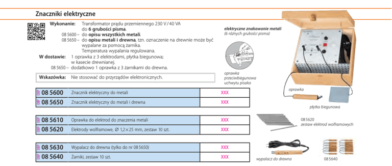 Znaczniki elektryczne Wykonanie: Transformator prądu przemiennego 230 V / 40 VA do 6 grubości pisma. 08 5600 – do opisu wszystkich metali. 08 5650 – do opisu metali i drewna, tzn. oznaczenie na drewnie może być wypalane za pomocą żarnika. Temperatura wypalania regulowana. W dostawie: 1 oprawka z 3 elektrodami, płytka biegunowa; w kasecie drewnianej. 08 5650 – dodatkowo 1 oprawka z 3 żarnikami do drewna. 08P 08P 08 5600 08 5650 08 5610 08 5620 08P 08P 08P 08P Wskazówka: 08 5630 08 5640 Nie stosować do przyrządów elektronicznych. elektryczne znakowanie metali (6 różnych grubości pisma) oprawka przeciwbiegunowa uchwytu pisaka Znacznik elektryczny do metali XXX Znacznik elektryczny do metali i drewna XXX Oprawka do elektrod do znaczenia metali XXX Elektrody wolframowe, ⌀ 1,2×25 mm, zestaw 10 szt. XXX Wypalacz do drewna (tylko do nr 08 5650) XXX Żarniki, zestaw 10 szt. XXX oprawka płytka biegunowa 08 5620 zestaw elektrod wolframowych wypalacz do drewna 08 5640