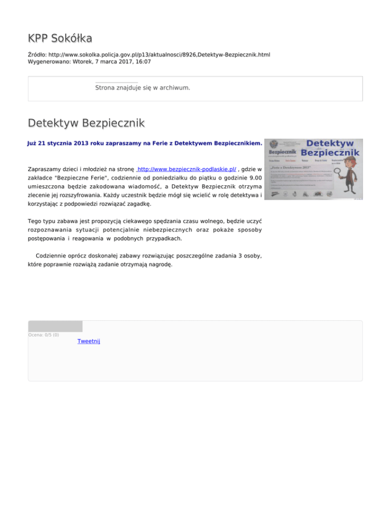 KPP Sokółka Źródło: http://www.sokolka.policja.gov.pl/p13/aktualnosci/8926,Detektyw-Bezpiecznik.html Wygenerowano: Wtorek, 7 marca 2017, 16:07 Strona znajduje się w archiwum. Detektyw Bezpiecznik Już 21 stycznia 2013 roku zapraszamy na Ferie z Detektywem Bezpiecznikiem. Zapraszamy dzieci i młodzież na stronę http://www.bezpiecznik-podlaskie.pl/ , gdzie w zakładce "Bezpieczne Ferie", codziennie od poniedziałku do piątku o godzinie 9.00 umieszczona będzie zakodowana wiadomość, a Detektyw Bezpiecznik otrzyma zlecenie jej rozszyfrowania. Każdy uczestnik będzie mógł się wcielić w rolę detektywa i korzystając z podpowiedzi rozwiązać zagadkę. Tego typu zabawa jest propozycją ciekawego spędzania czasu wolnego, będzie uczyć rozpoznawania sytuacji potencjalnie niebezpiecznych oraz pokaże sposoby postępowania i reagowania w podobnych przypadkach. Codziennie oprócz doskonałej zabawy rozwiązując poszczególne zadania 3 osoby, które poprawnie rozwiążą zadanie otrzymają nagrodę. Ocena: 0/5 (0) Tweetnij