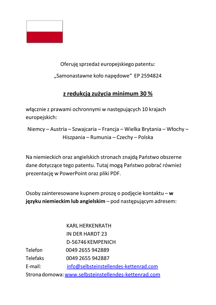 Oferuję sprzedaż europejskiego patentu: „Samonastawne koło napędowe“ EP 2594824 z redukcją zużycia minimum 30 % włącznie z prawami ochronnymi w następujących 10 krajach europejskich: Niemcy – Austria – Szwajcaria – Francja – Wielka Brytania – Włochy – Hiszpania – Rumunia – Czechy – Polska Na niemieckich oraz angielskich stronach znajdą Państwo obszerne dane dotyczące tego patentu. Tutaj mogą Państwo pobrać również prezentację w PowerPoint oraz pliki PDF. Osoby zainteresowane kupnem proszę o podjęcie kontaktu – w języku niemieckim lub angielskim – pod następującym adresem: KARL HERKENRATH IN DER HARDT 23 D-56746 KEMPENICH Telefon 0049 2655 942889 Telefaks 0049 2655 942887 E-mail: [email protected] Strona domowa: www.selbsteinstellendes-kettenrad.com W przypadku, jeżeli zgodnie z oczekiwaniami nie sprzedam patentu w ciągu najbliższych miesięcy, prawdopodobnie będzie istniała możliwość wydawania licencji. Jeżeli są Państwo zainteresowani ewentualną licencją, proszę również o stosowną informację. Ta znakomita innowacja jest skierowana również do inwestorów, którzy są gotowi do wprowadzenia tego wynalazku na międzynarodowe rynki. Możliwości zastosowania tego patentu są tak duże, że może on być wykorzystany we wszystkich łańcuchach na całej kuli ziemskiej.
