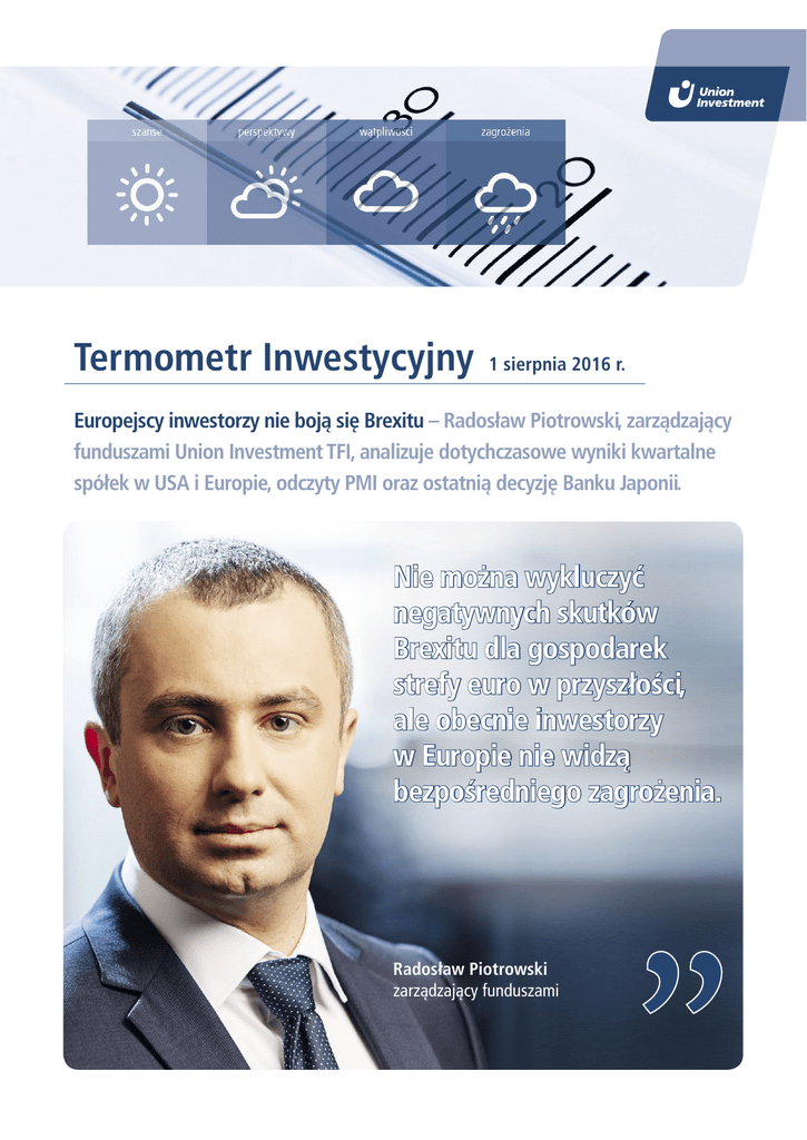 Termometr Inwestycyjny 1 sierpnia 2016 r. Europejscy inwestorzy nie boją się Brexitu – Radosław Piotrowski, zarządzający funduszami Union Investment TFI, analizuje dotychczasowe wyniki kwartalne spółek w USA i Europie, odczyty PMI oraz ostatnią decyzję Banku Japonii. Nie można wykluczyć negatywnych skutków Brexitu dla gospodarek strefy euro w przyszłości, ale obecnie inwestorzy w Europie nie widzą bezpośredniego zagrożenia. Radosław Piotrowski zarządzający funduszami W USA i Europie spółki energetyczne ponownie zawodzą Na świecie trwa sezon publikacji wyników finansowych spółek za II kwartał 2016 r. W Stanach Zjednoczonych przychody oraz zyski spółek są jak dotąd lepsze od oczekiwań analityków, a odsetek pozytywnych zaskoczeń najwyższy od 2009 r. Jest to w dużej mierze efekt niskich oczekiwań. W rzeczywistości zyski amerykańskich spółek kurczą się kolejny kwartał z rzędu. Największym winowajcą są ponownie spółki energetyczne, chociaż i bez nich indeks szerokiego rynku zanotowałby spadek zysków o 2%. W Europie sytuacja prezentuje się lepiej, jednak również tu raporty spółek energetycznych zaniżają całościowe wyniki. Pozytywnie na tle indeksu paneuropejskiego prezentuje się strefa euro, gdzie zyski spółek wzrosły o 2% (jest to jedyny z większych rynków rozwiniętych, który pokazuje wzrost zysków). Fakt ten oraz otrząśnięcie się z pierwszych negatywnych reakcji na Brexit spowodowały, że w ostatnich dniach indeksy giełdowe w Europie zachowują się lepiej na tle świata. Brexit – burza w szklance wody? Dobre nastroje inwestorów na europejskich parkietach mają jeszcze inne źródła. Są nimi niezłe odczyty wskaźników wyprzedzających PMI, które pokazują oczekiwania co do przyszłej koniunktury gospodarczej. Sugerują, że przynajmniej w najbliższym czasie konsekwencje Brexitu dla Europy kontynentalnej będą dużo łagodniejsze, niż się pierwotnie obawiano. Jedynie w Wielkiej Brytanii wskaźnik PMI dla przemysłu i usług spadł w lipcu do 47,7 punktu, osiągając najniższą wartość od ponad 7 lat. Nie można wykluczyć negatywnych skutków Brexitu dla gospodarek strefy euro w przyszłości, ale obecnie inwestorzy w Europie nie widzą bezpośredniego zagrożenia. Bank Japonii rozczarował Ostatnie posiedzenie Banku Japonii mogło nieco rozczarować inwestorów. Wbrew oczekiwaniom, japoński bank centralny nie zdecydował się na obniżkę stopy procentowej (która pozostaje na poziomie -0,1%) ani na zwiększenie skali skupu obligacji rządowych o wartości ok. 80 bln jenów. Trzeba jednak wyraźnie powiedzieć: inwestorzy ustawili poprzeczkę bardzo wysoko i można było się spodziewać, że Bank Japonii nie sprosta ich oczekiwaniom. Warto jednocześnie przypomnieć, że to już kolejna decyzja banku centralnego, która w ostatnim czasie zawiodła. Masz pytania? 800 567 662 (22) 449 03 33 (od poniedziałku do piątku, od 8.00 do 18.00) [email protected] www.doradcy.unionklub.pl